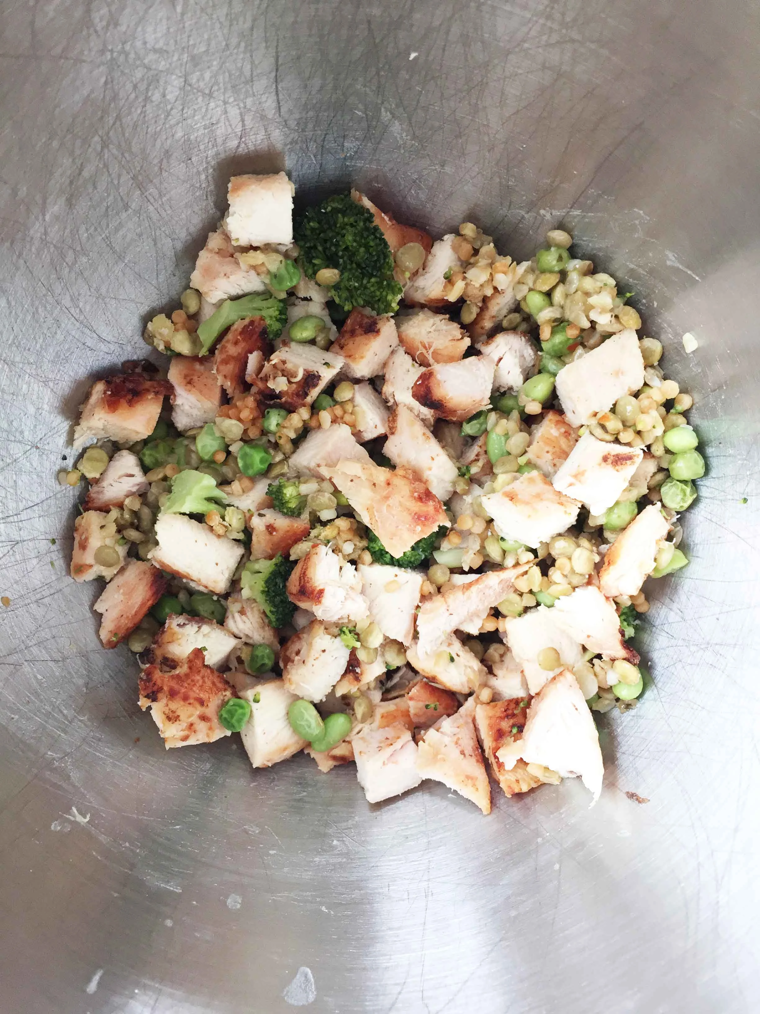 Chop up the chicken into bite size cubes and combine with the vegetable blend.