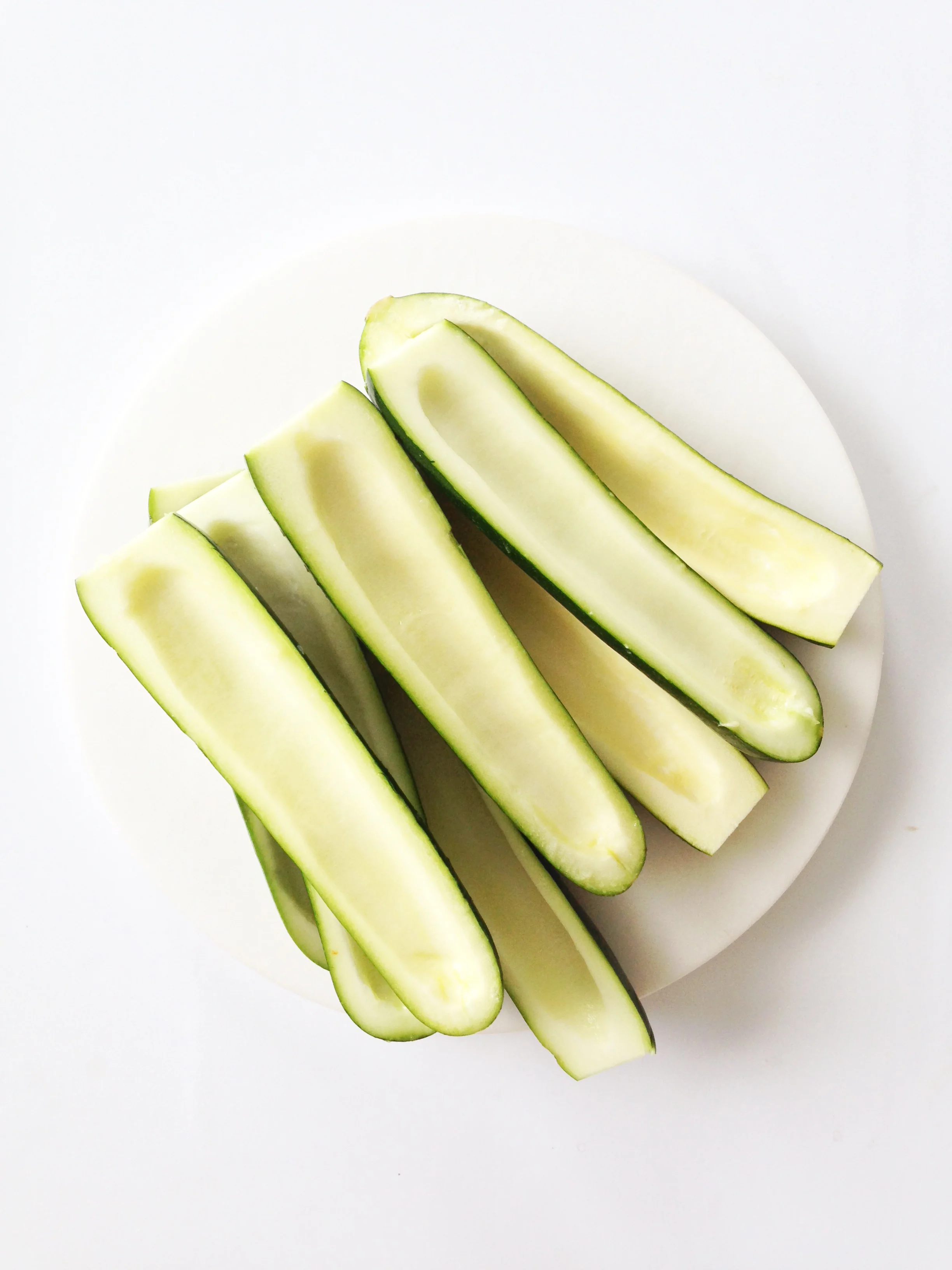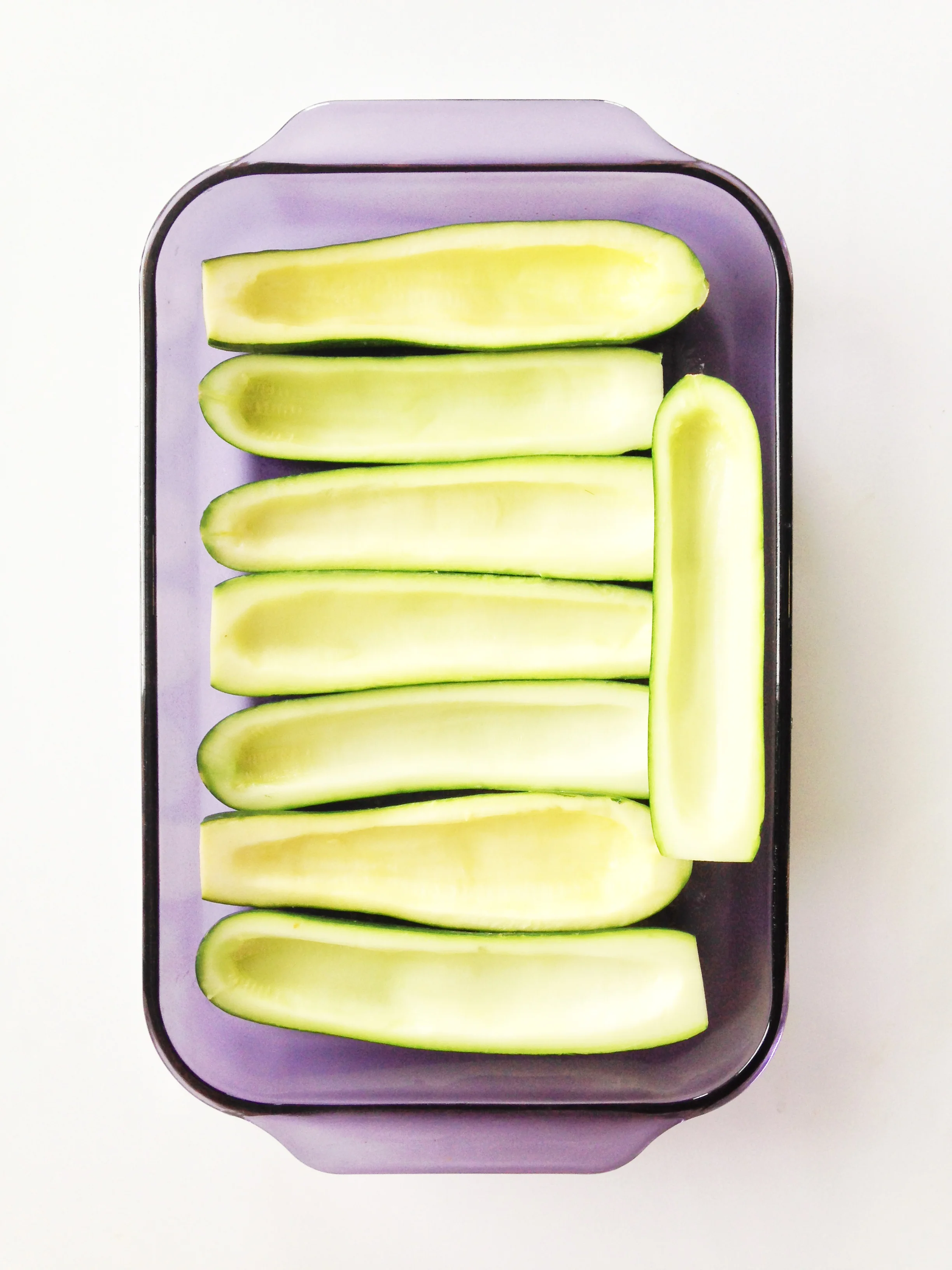 Clean, cut the stems off of your zucchini and slice them in half. Using a spoon or melon baller, scoop out the pulp and flesh to leave about 1/4" thick 'shells'.