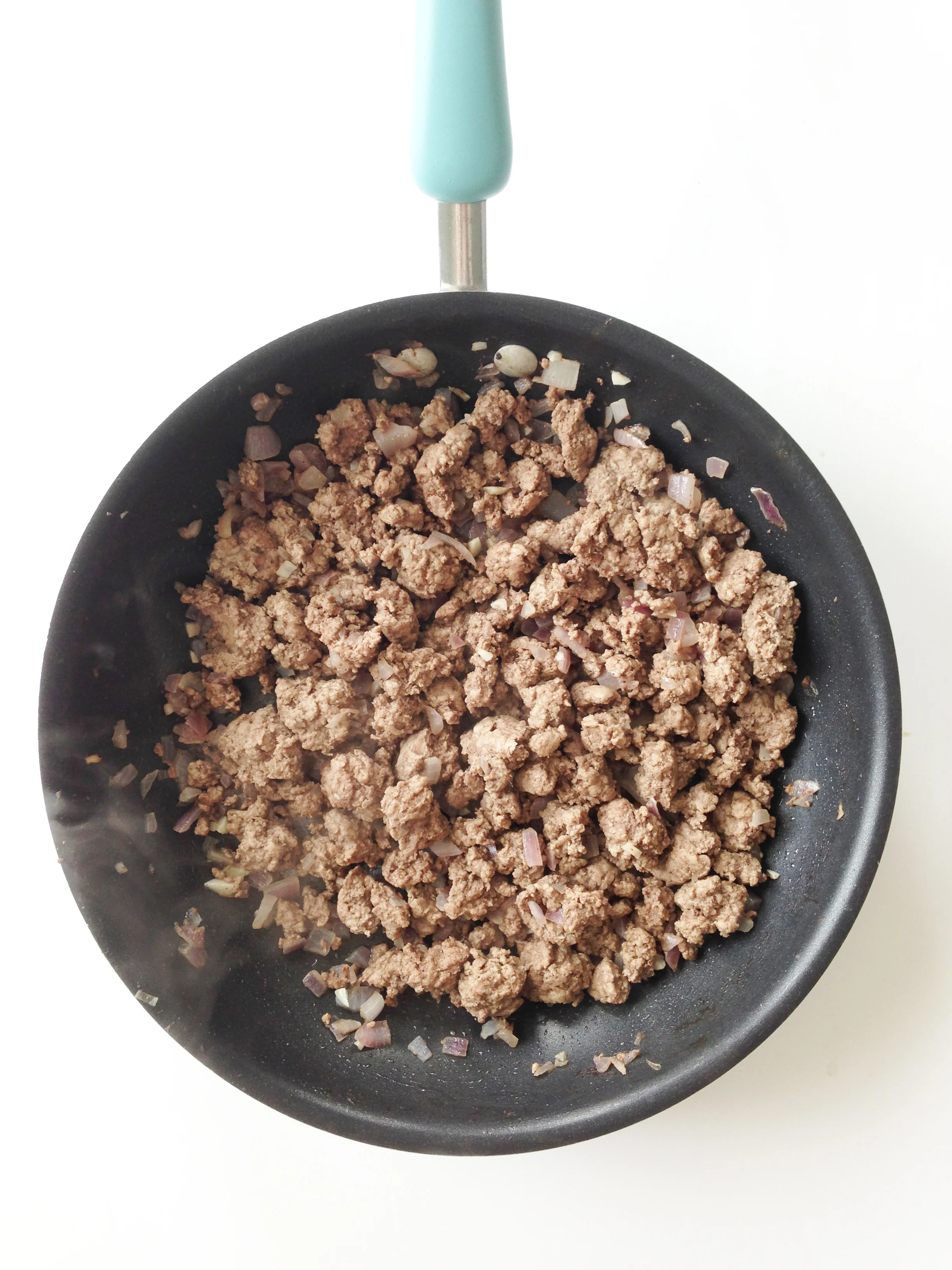 Lightly coat a large skillet with non-stick cooking spray and brown your meat with your onions and garlic.