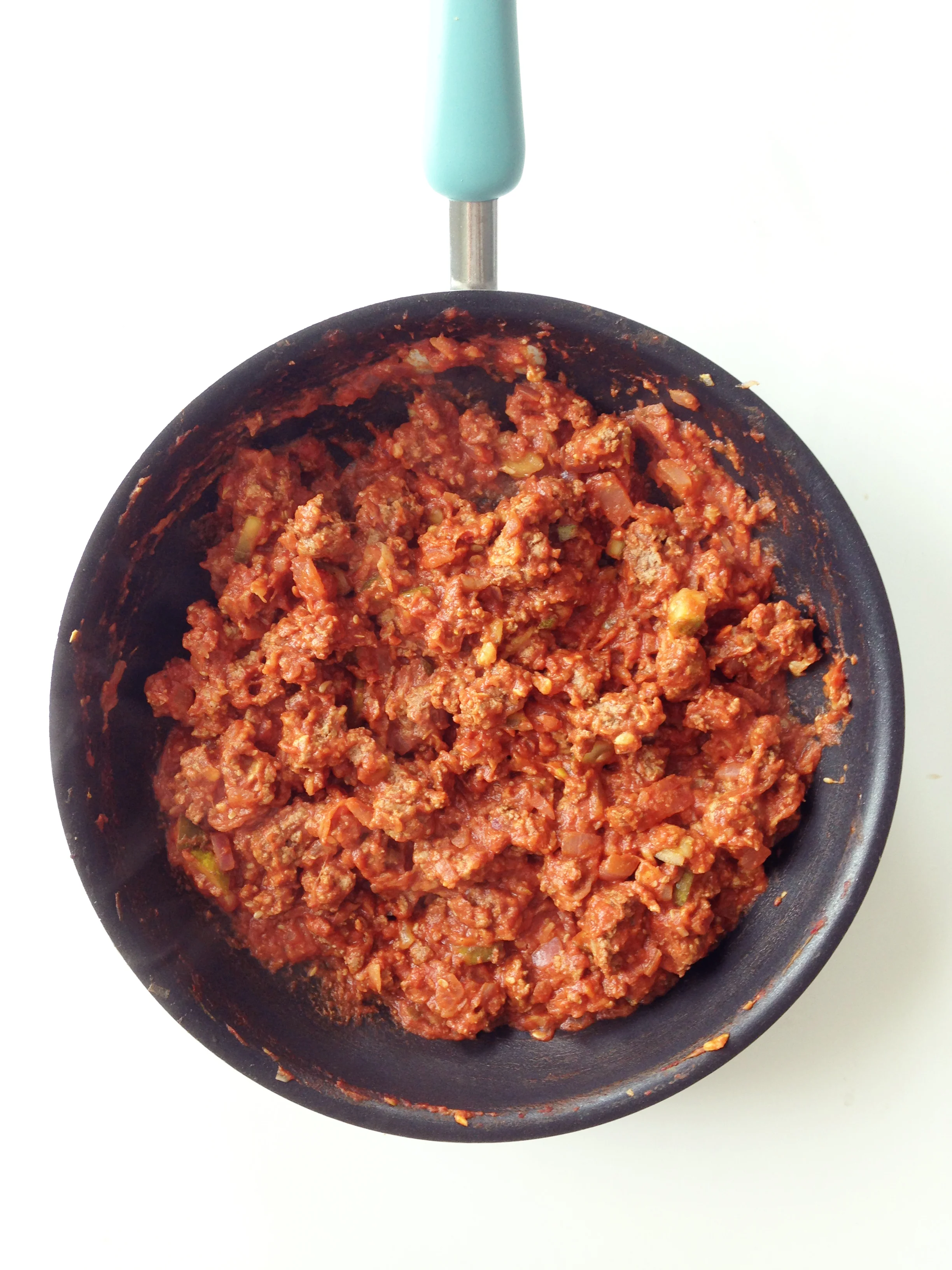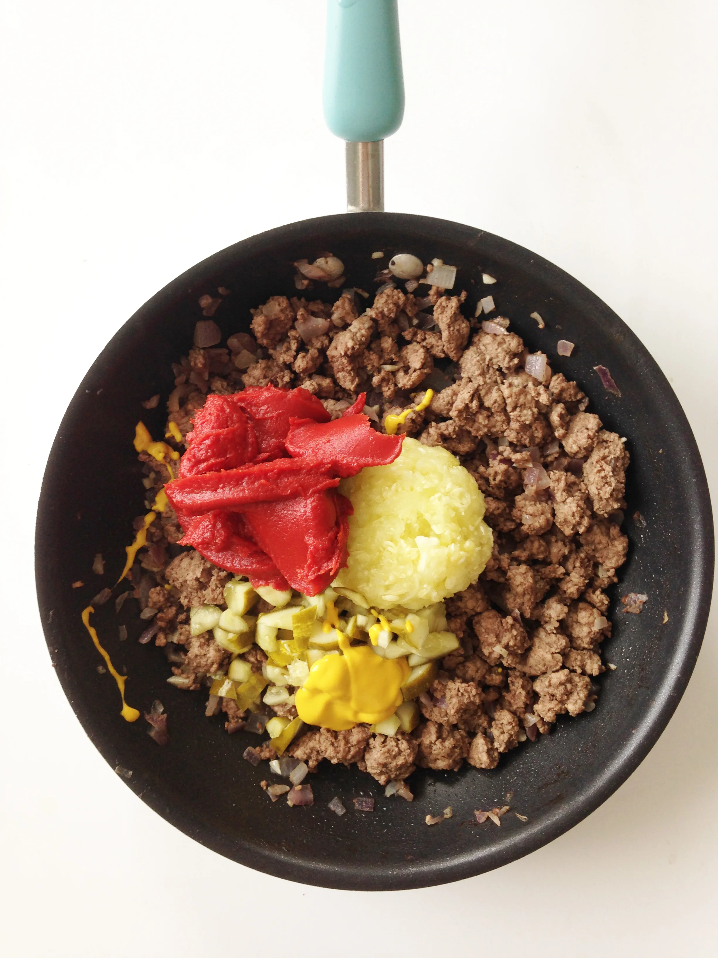 Once the meat is done, drain and add in the chopped zucchini, tomato paste, water, pickles and mustard.