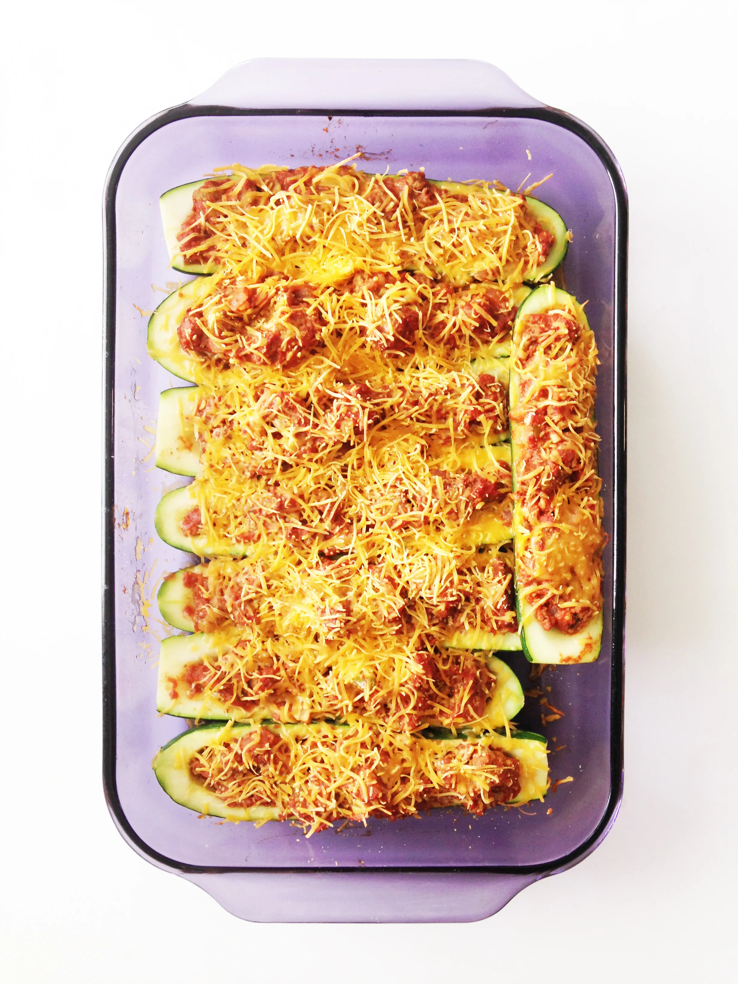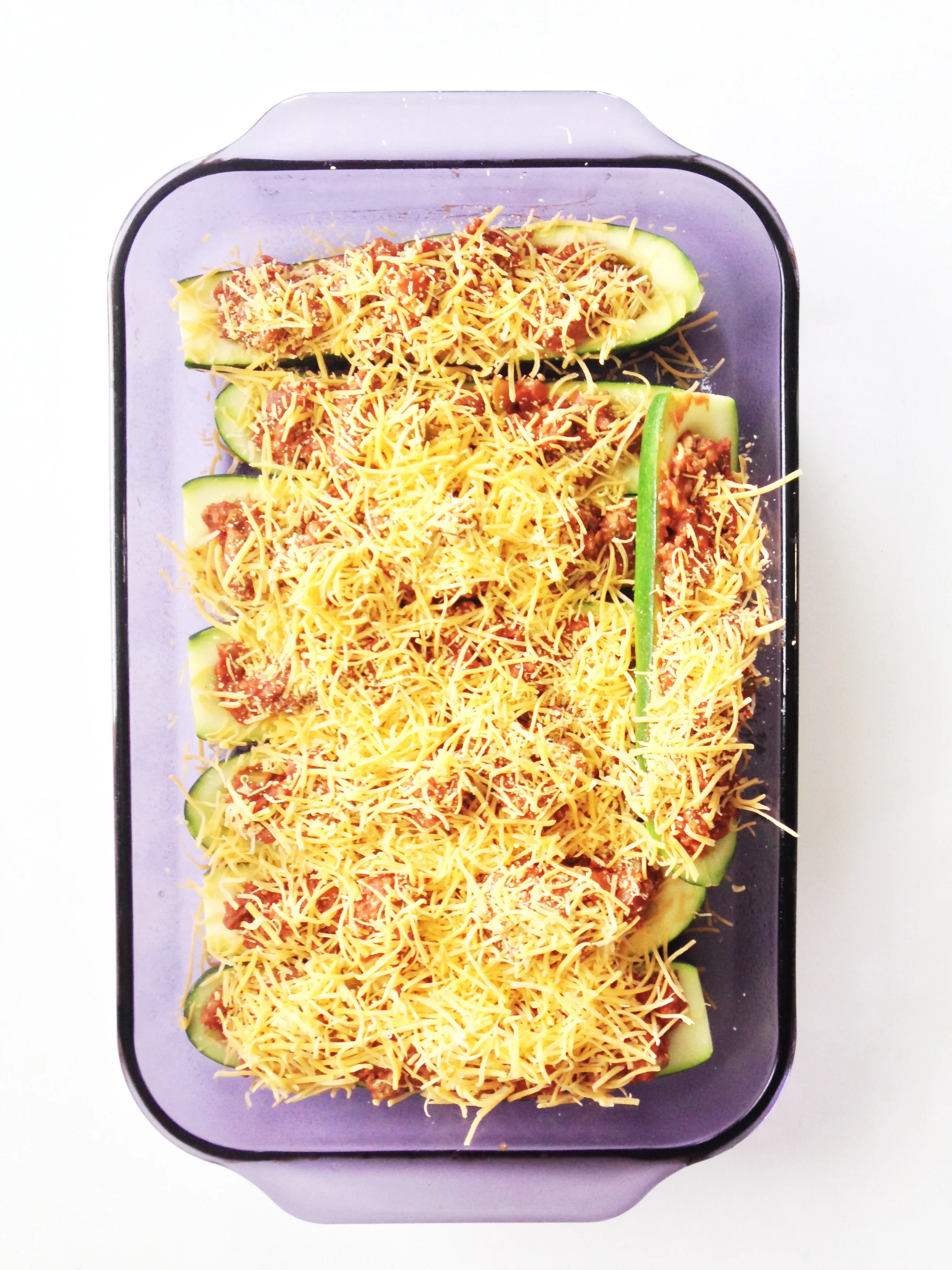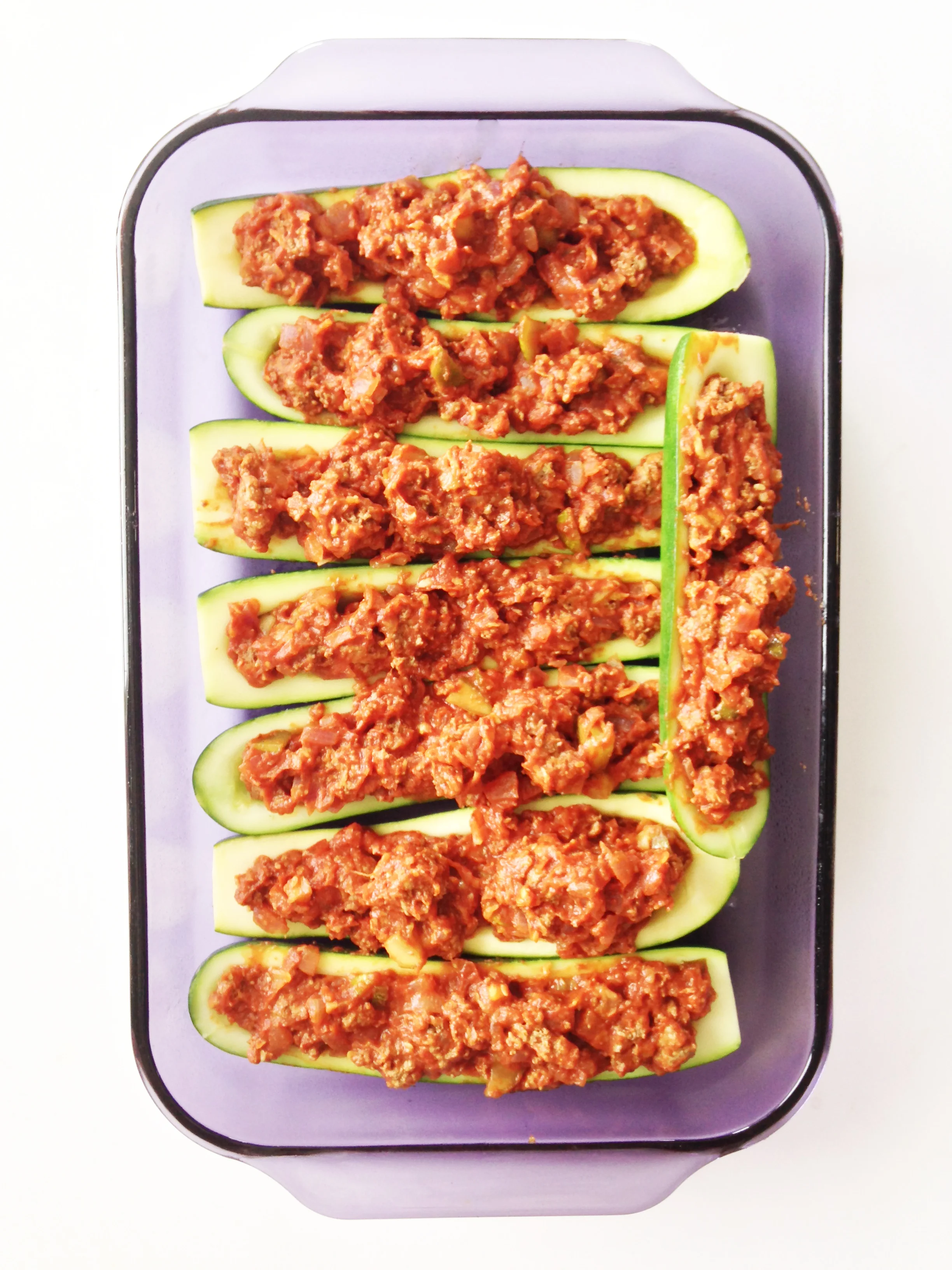 Place your zucchini into the prepared baking dish and feel each with the meat mixture.