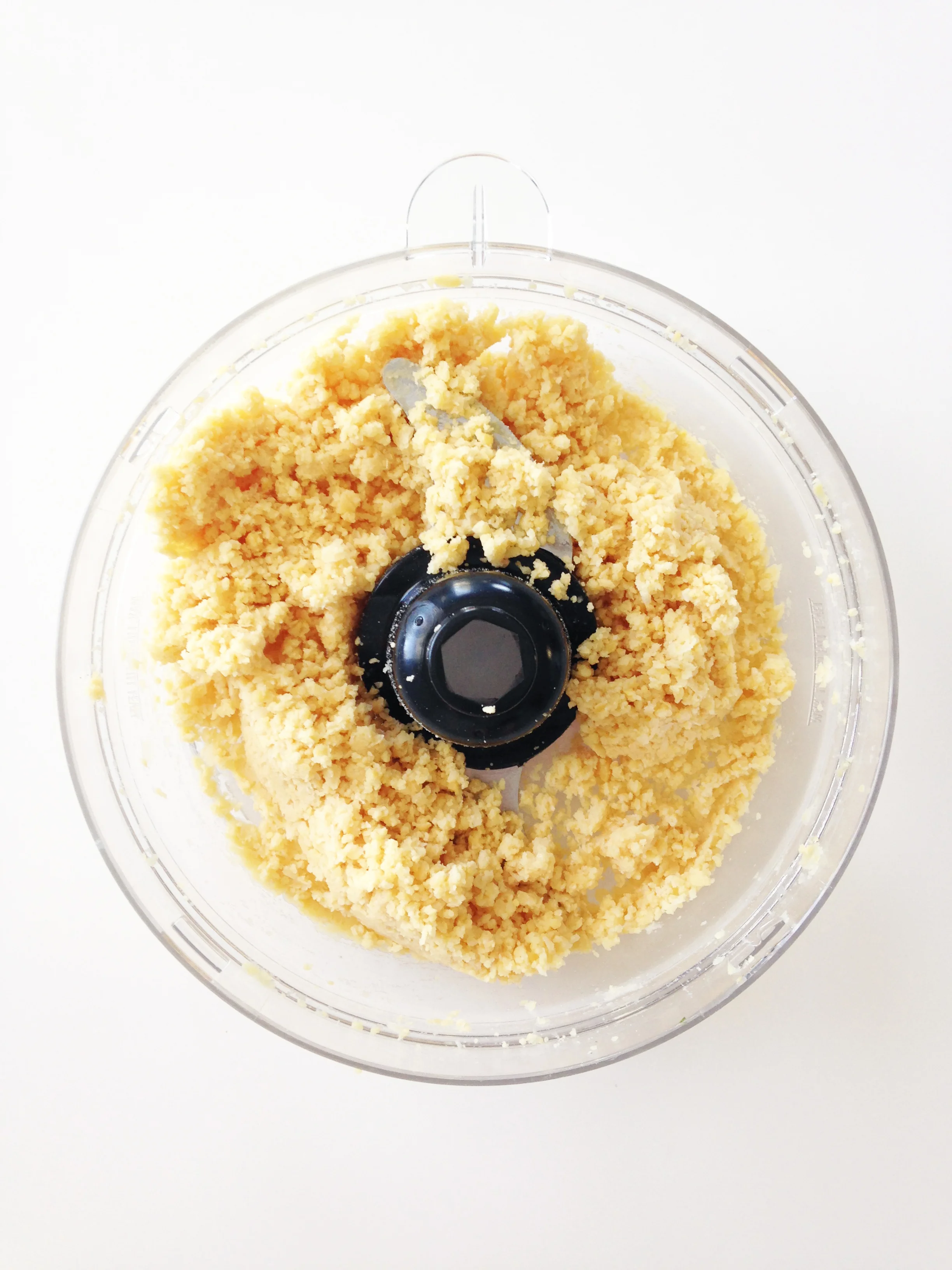 Set the cooked veggies aside and place the chickpeas and lemon juice into a food processor. Blend until crumbly sort of paste forms and all the chickpeas are smashed.