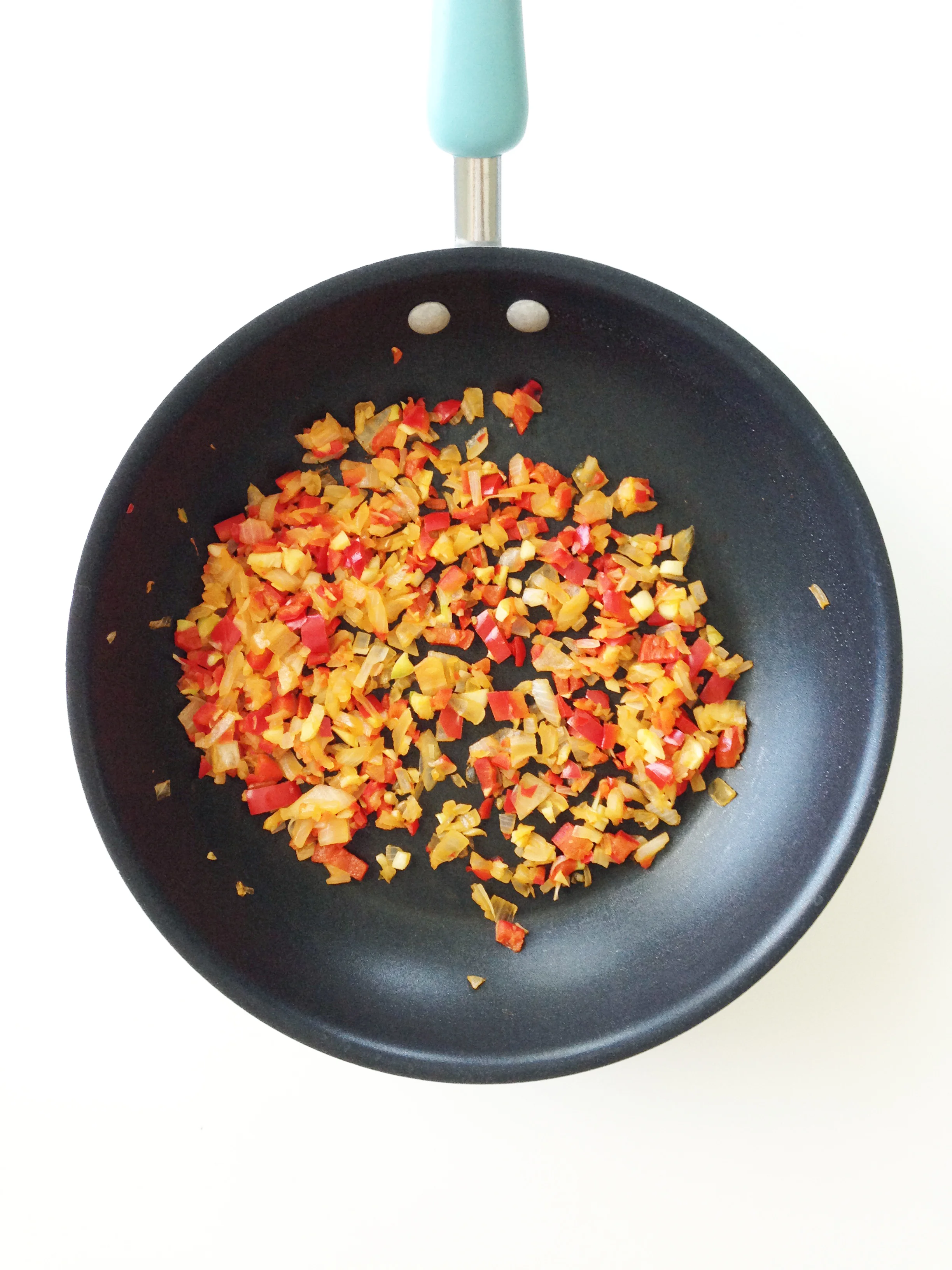 Lightly coat a skillet with some non-stick cooking spray and toss the onion, garlic, and red bell pepper into it. Cook over a medium heat until the veggies are tender; about 2-3 minutes.