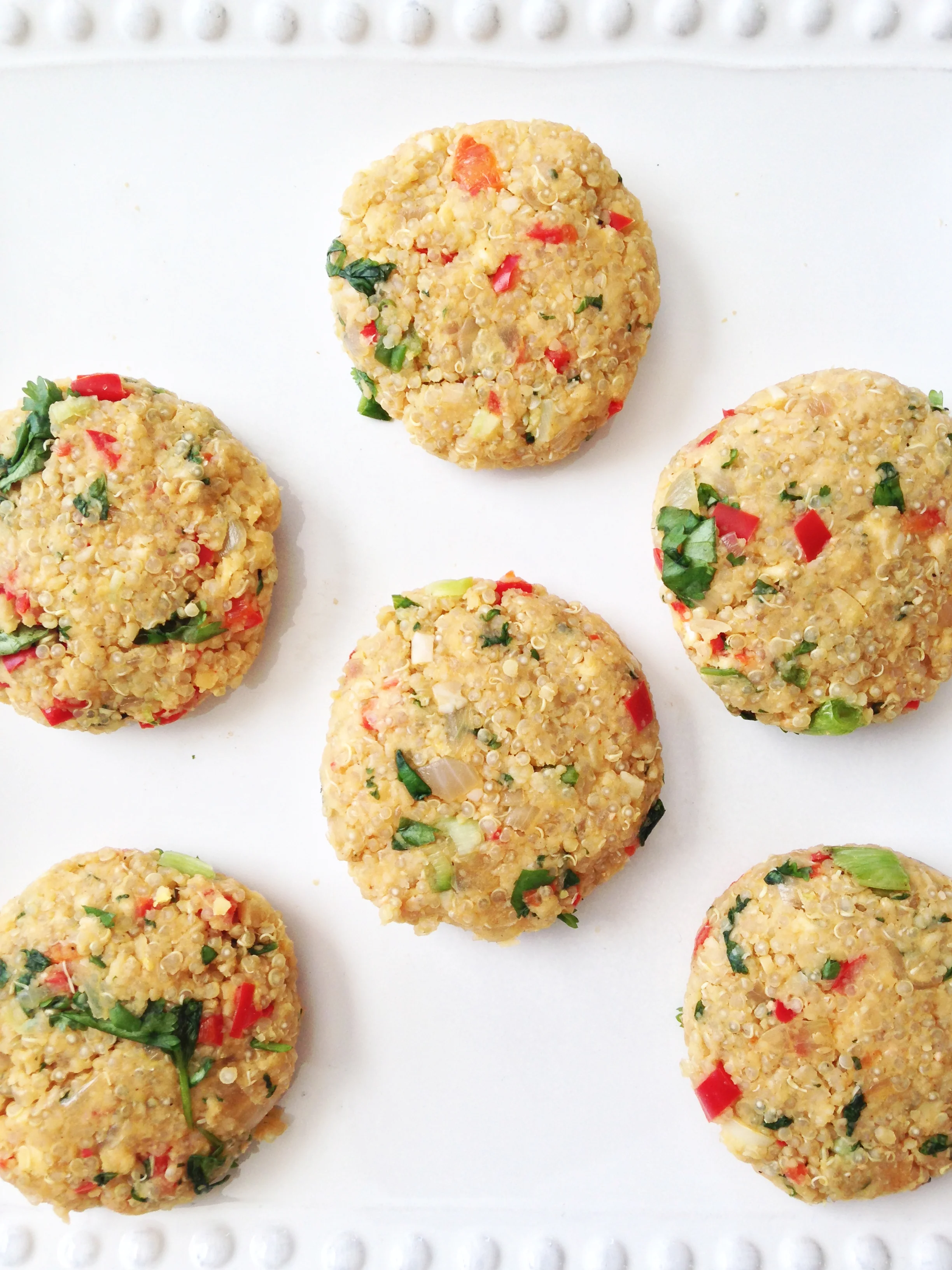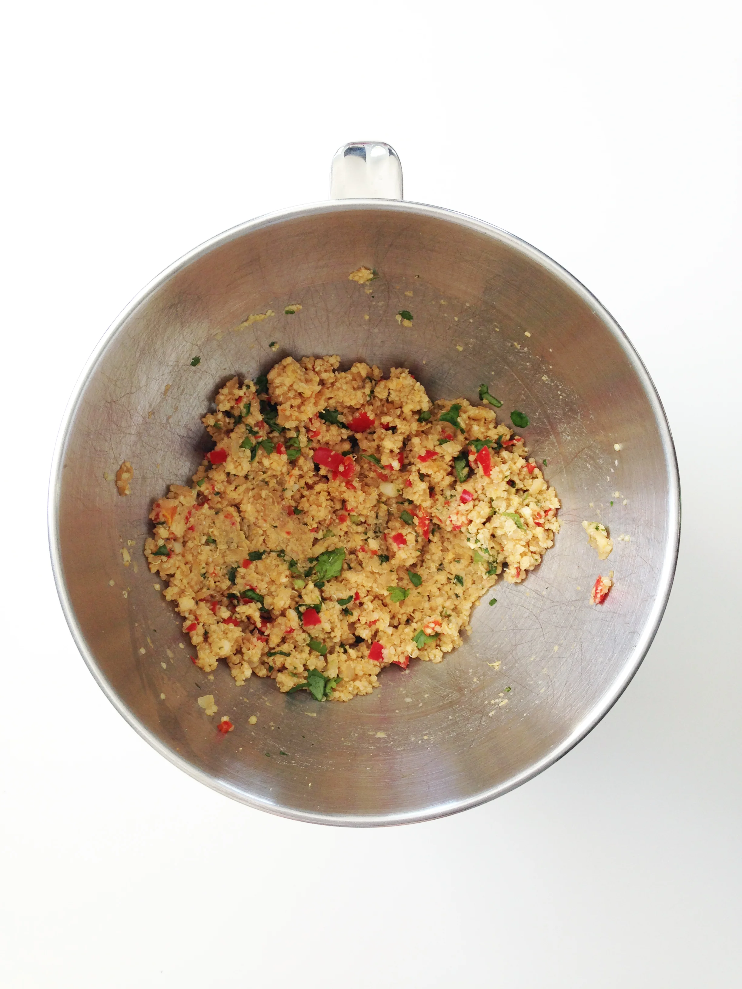 Combine all the ingredients (except for the bread crumbs) together into a large mixing bowl, including the cooked veggies and mashed chickpeas.
