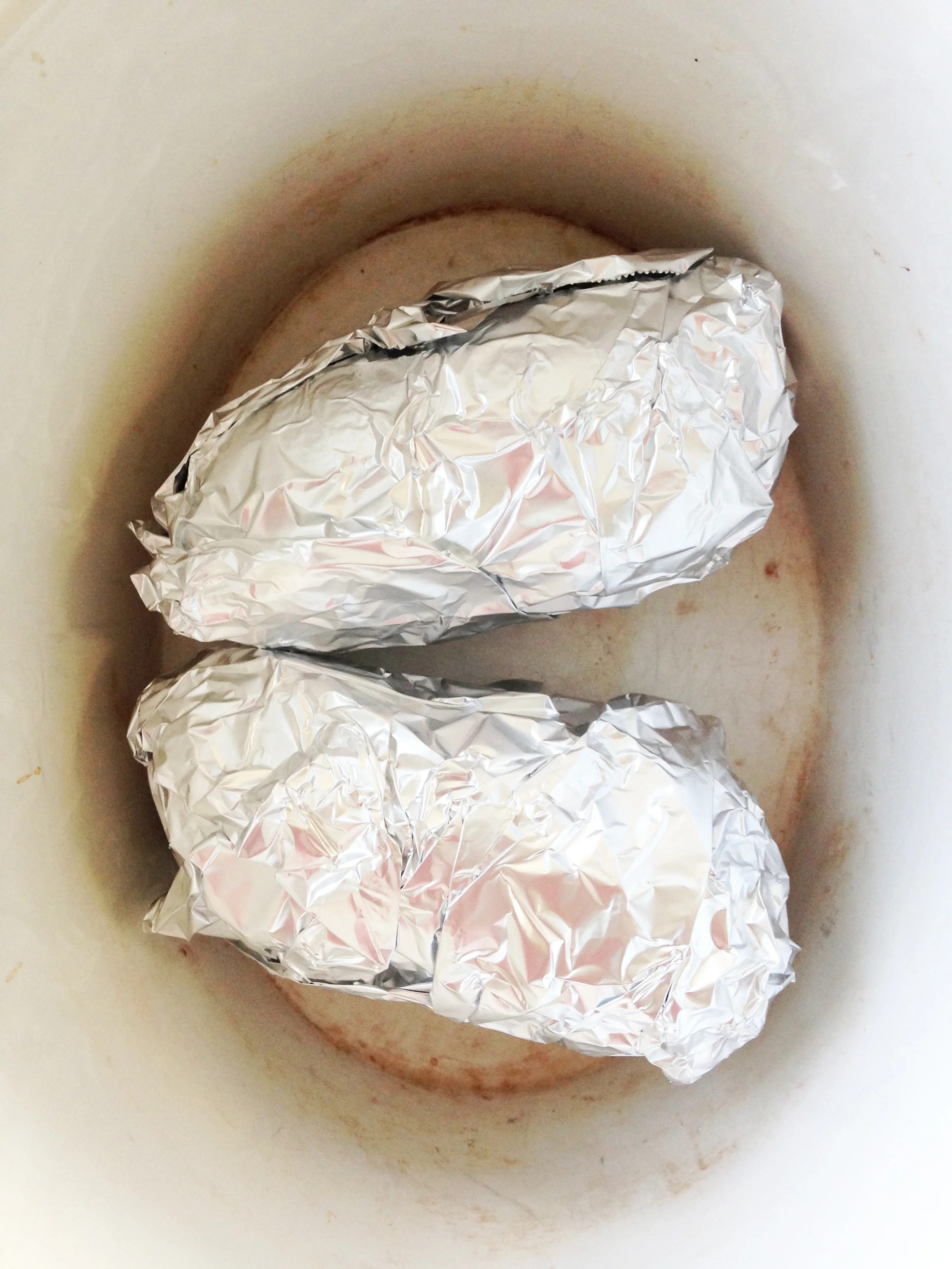 Get a little stab-happy with your potatoes. Pierce them all over with a fork and wrap them in foil before tossing into the slow cooker.