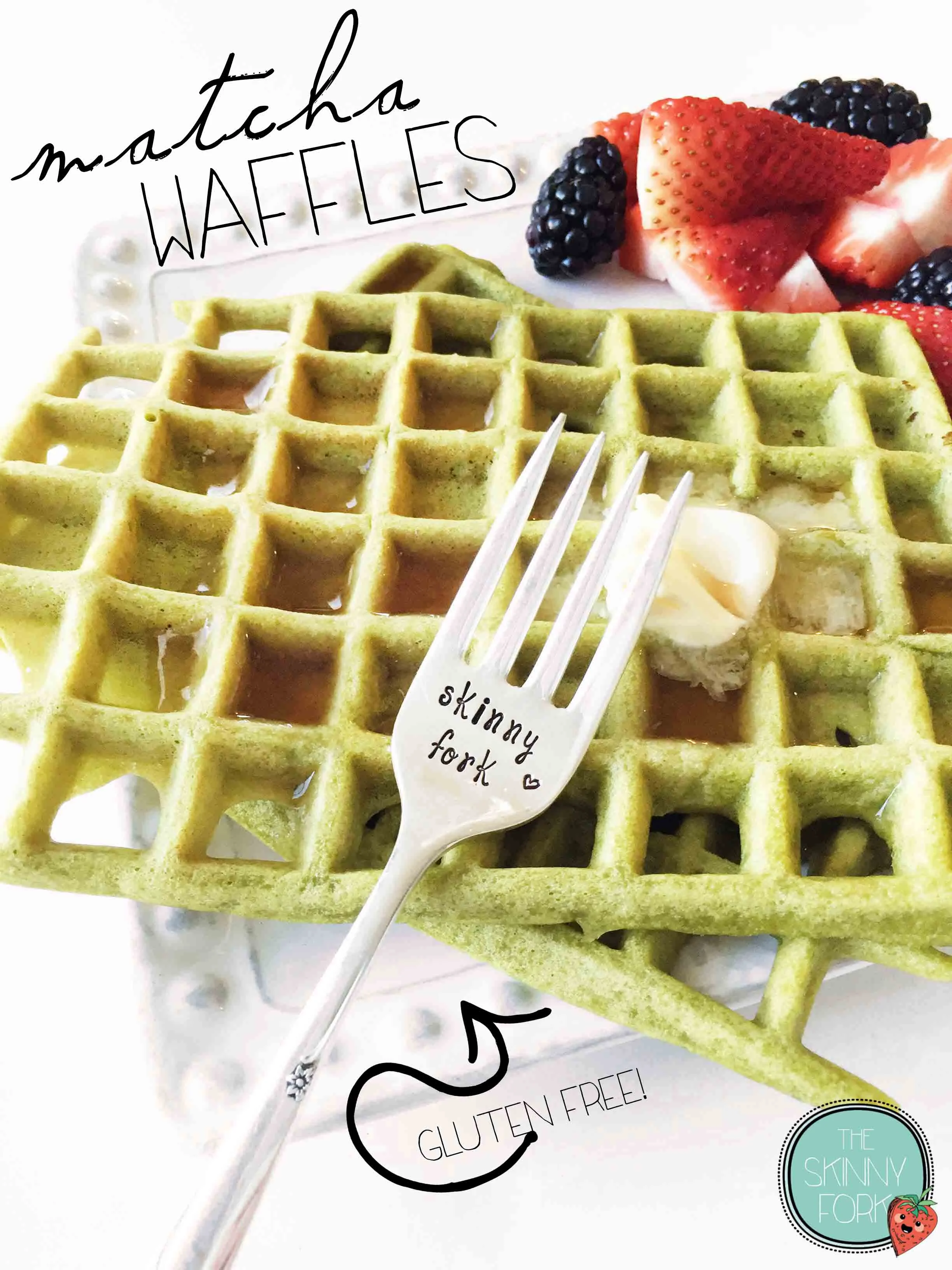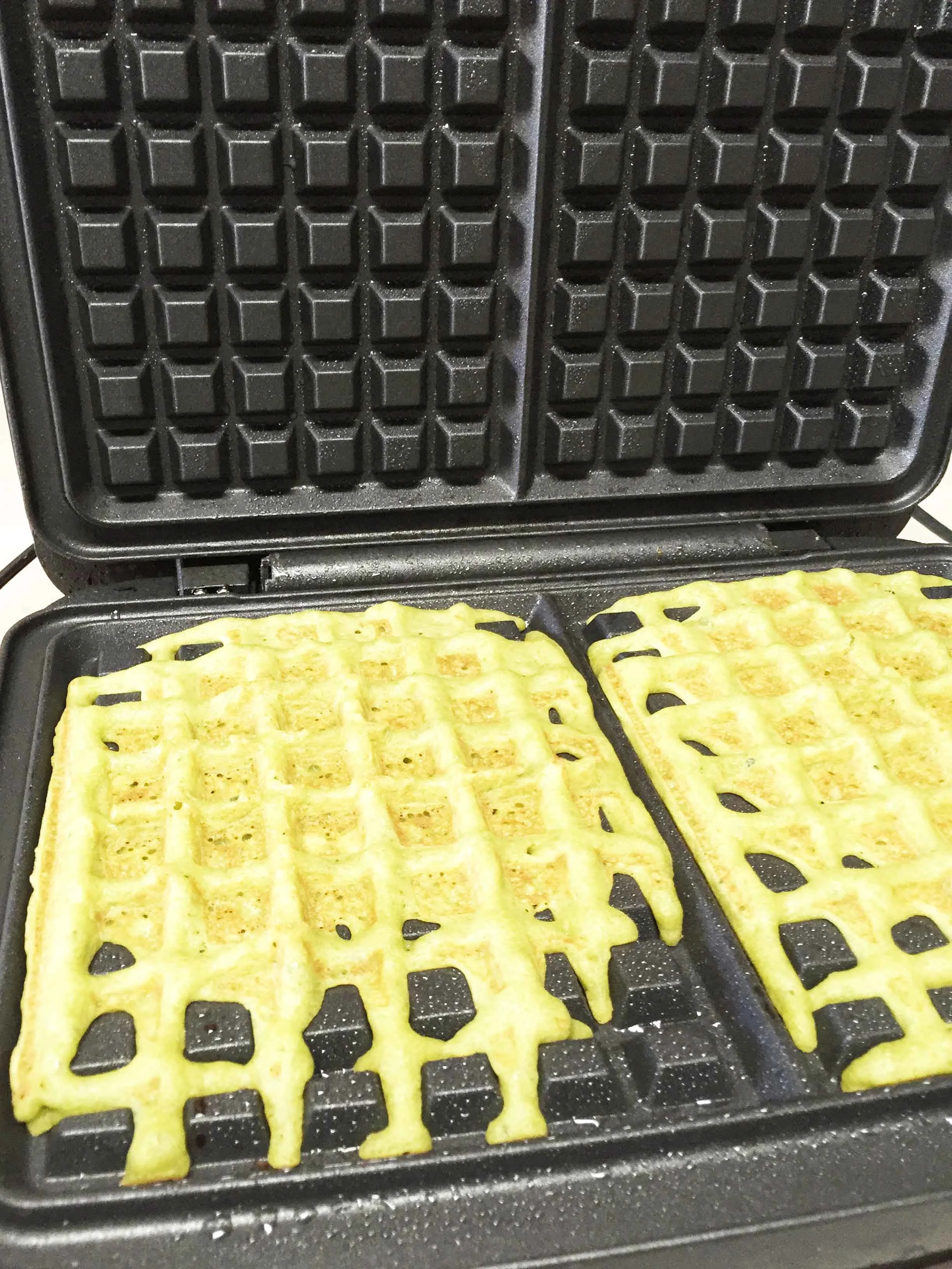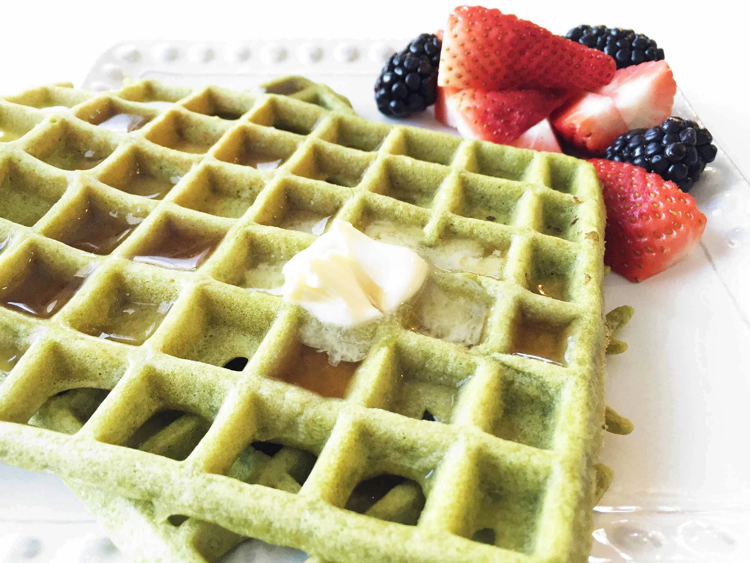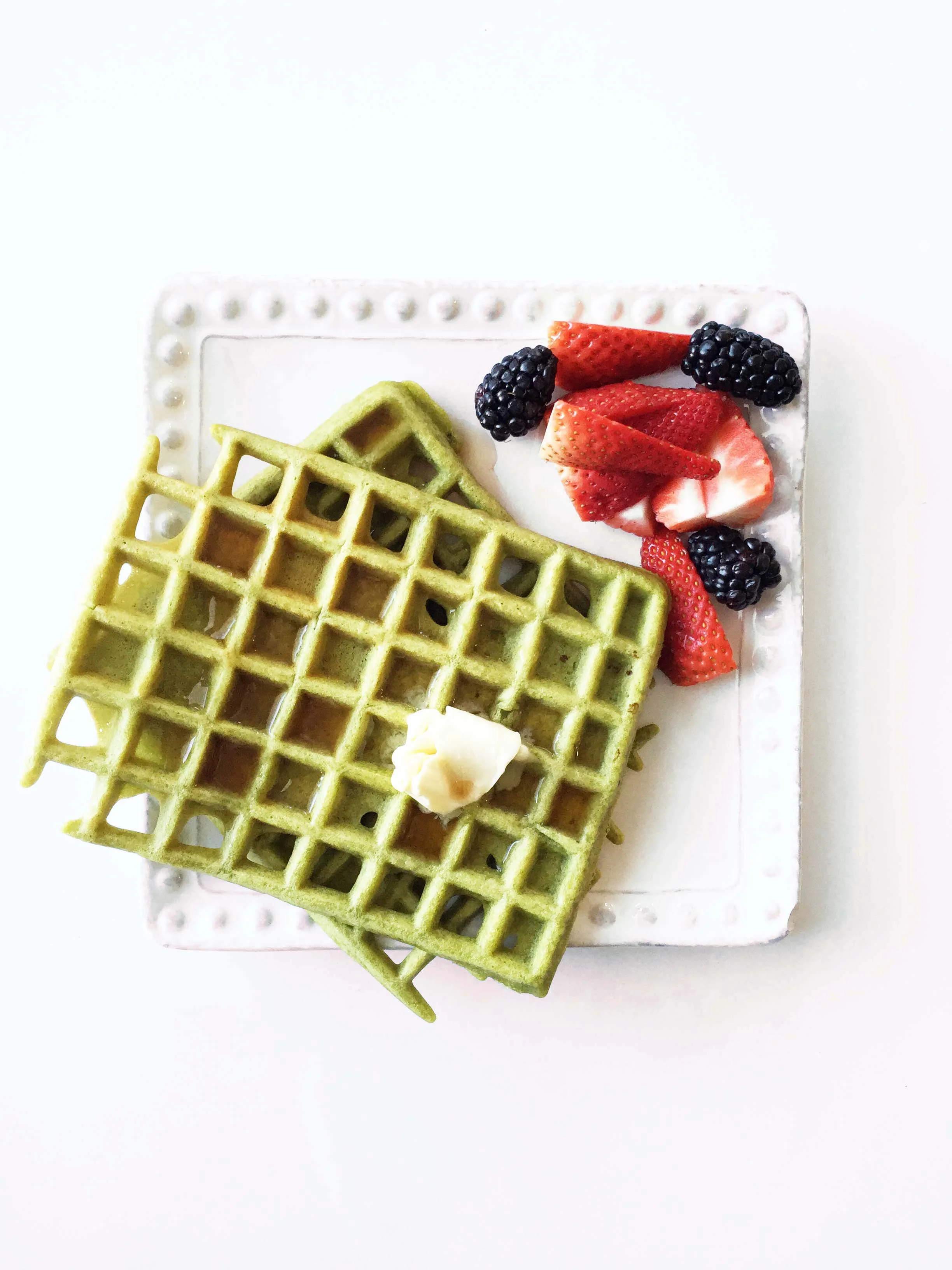 These waffles are packed with matcha, which is what gives them their beautiful green color. Matcha is a dried green tea powder concentrate that is amazingly good for you. It has less caffeine than regular green tea or coffee, but gives you the same much needed boost of energy which lasts for a longer time. You also don't get any caffeine jitters with matcha.