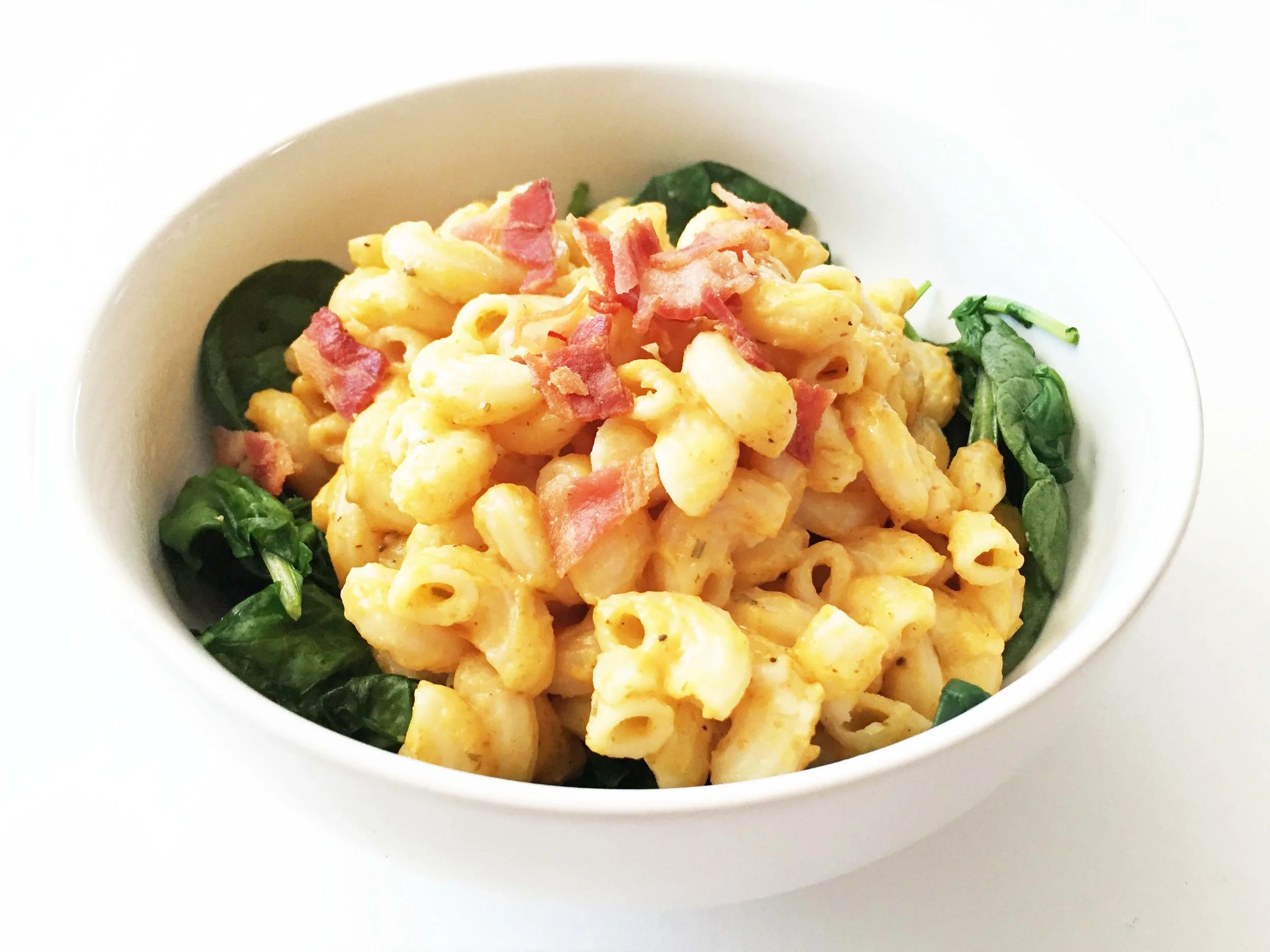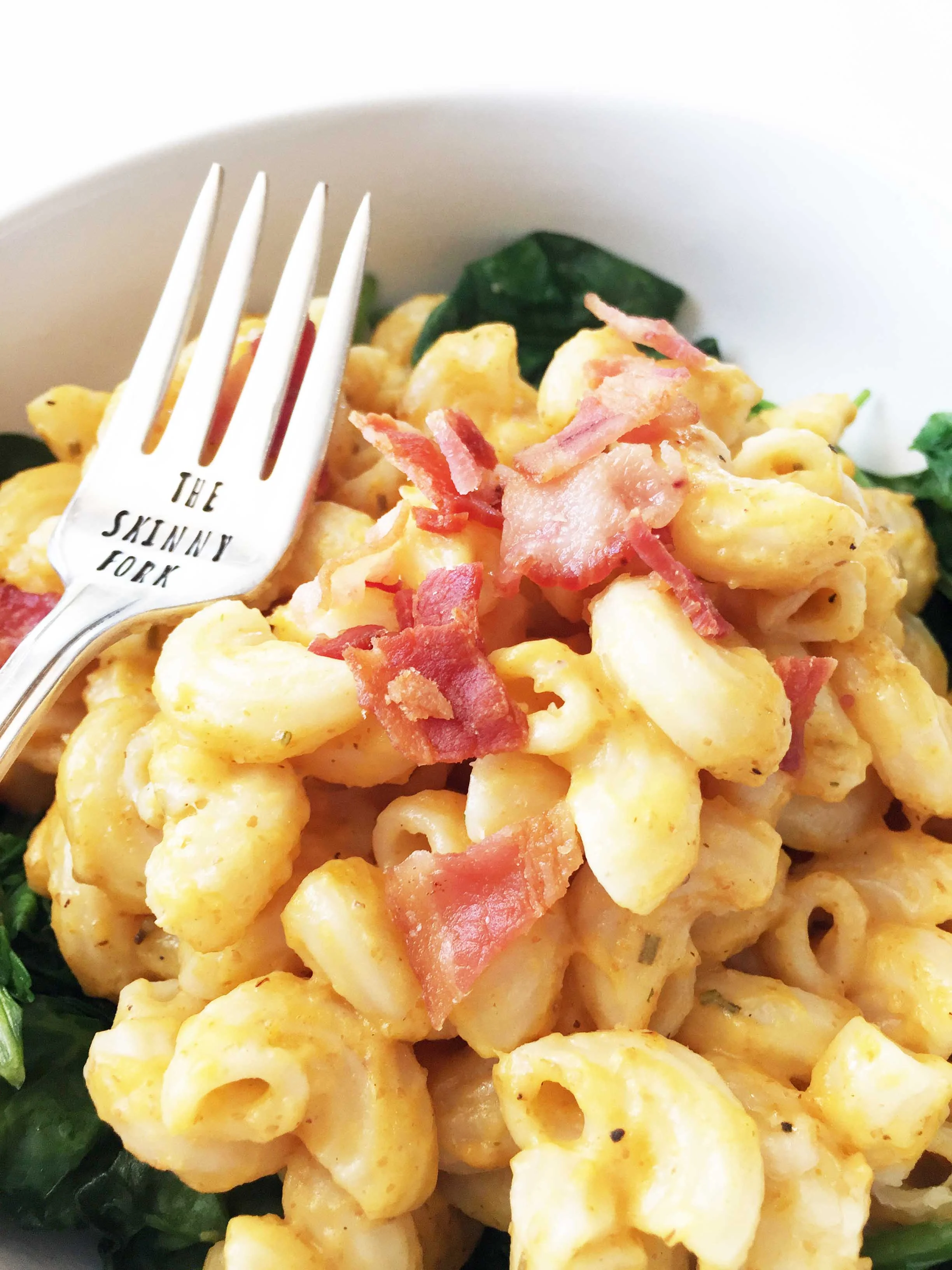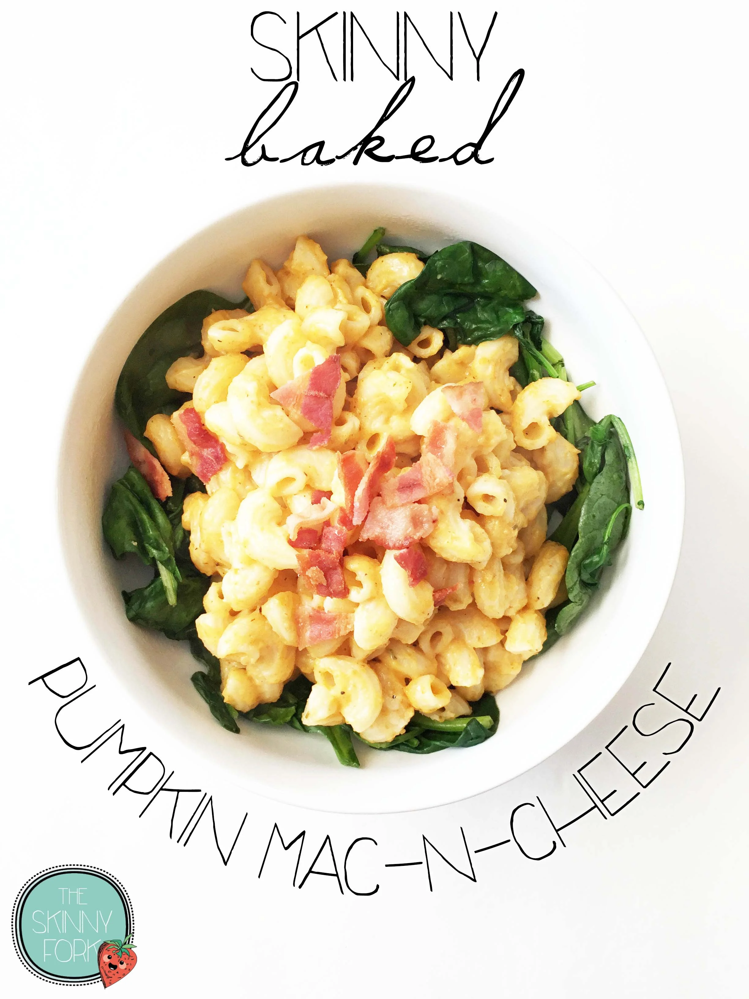 I served my Baked Pumpkin Mac-n-Cheese over some wilted baby greens and topped it all off with some reduced sodium center cut bacon crumbles for good measure.