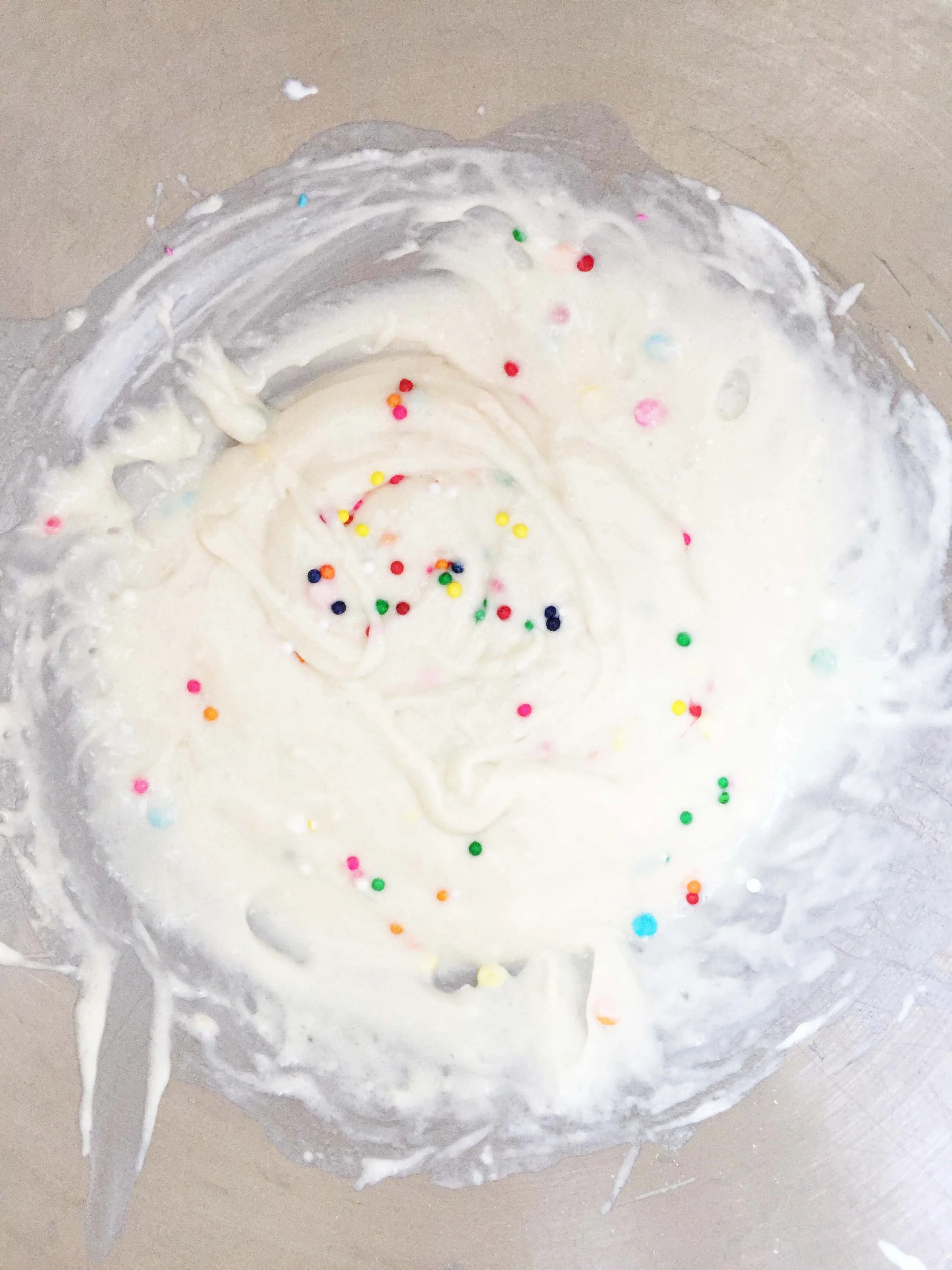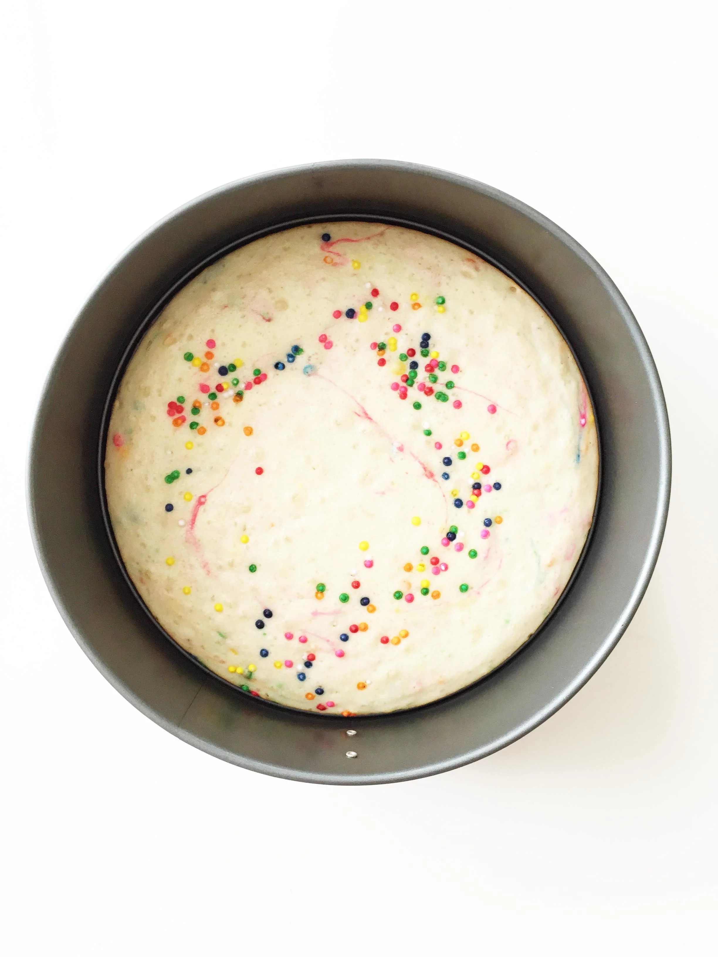 Add in some sprinkles if you want and pour into the bottom of the prepared cake pan.