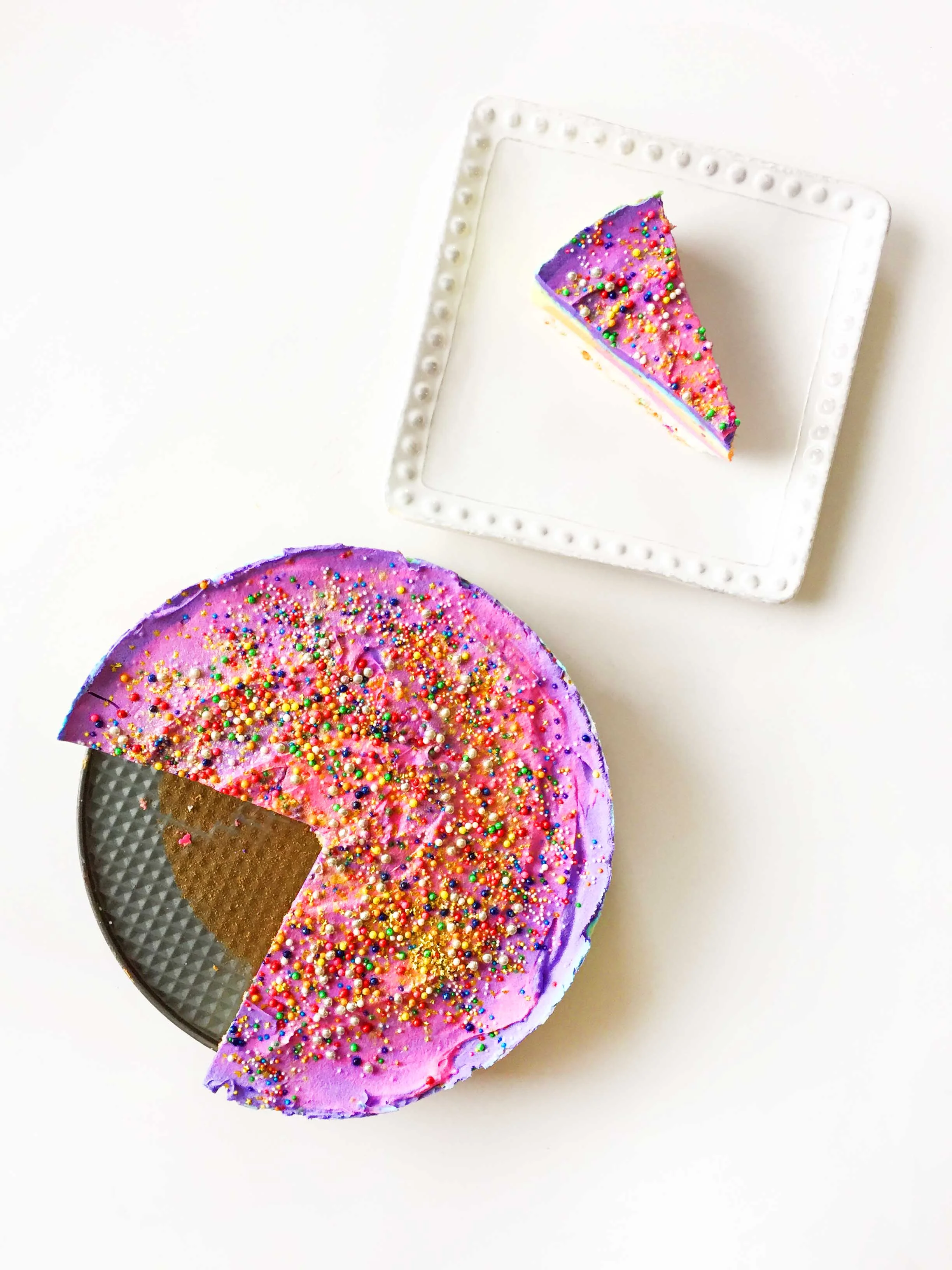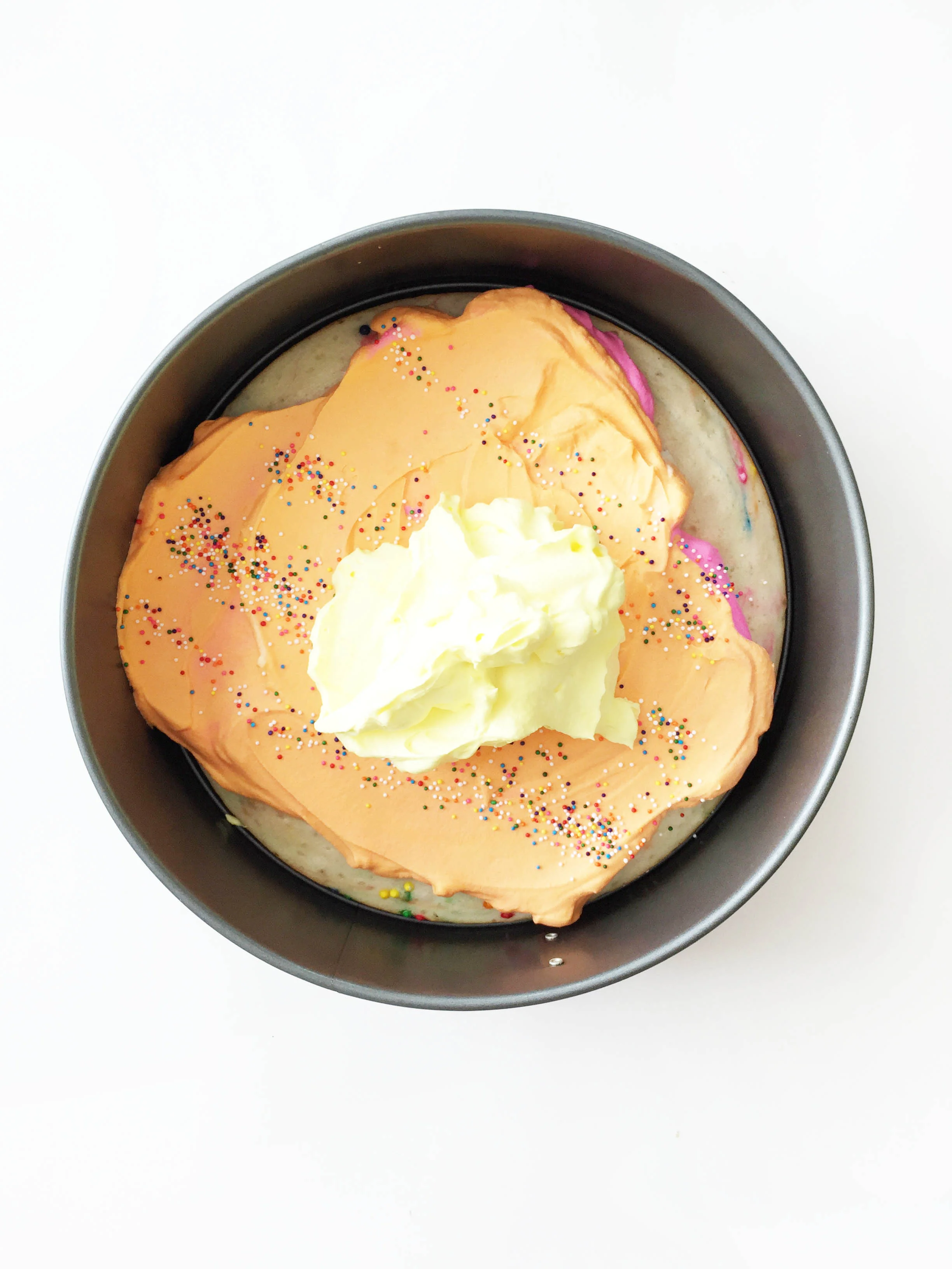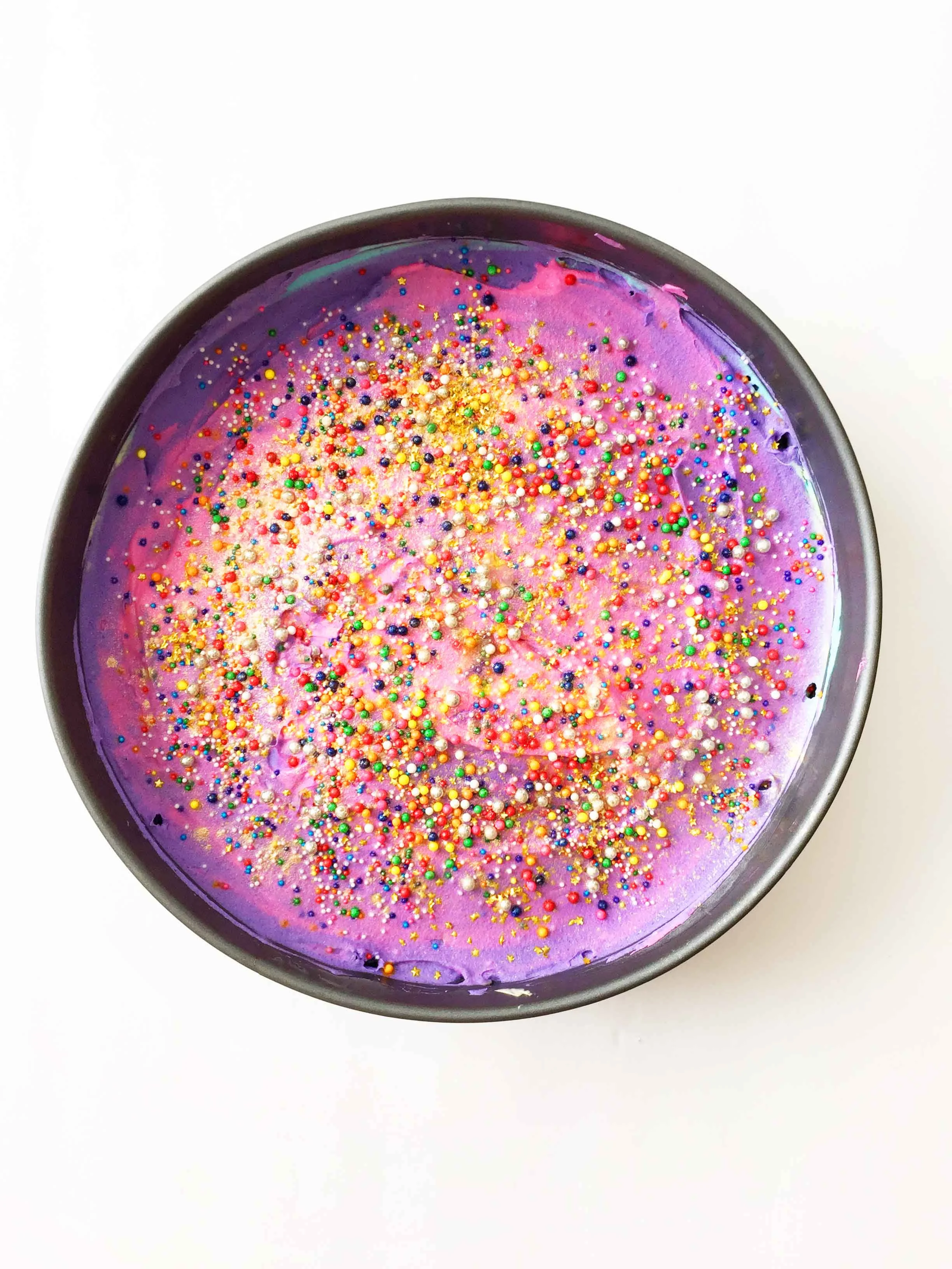 Spread the different colors in over the cake 'crust' layer. Top with plenty of sprinkles and sparkly goodness.