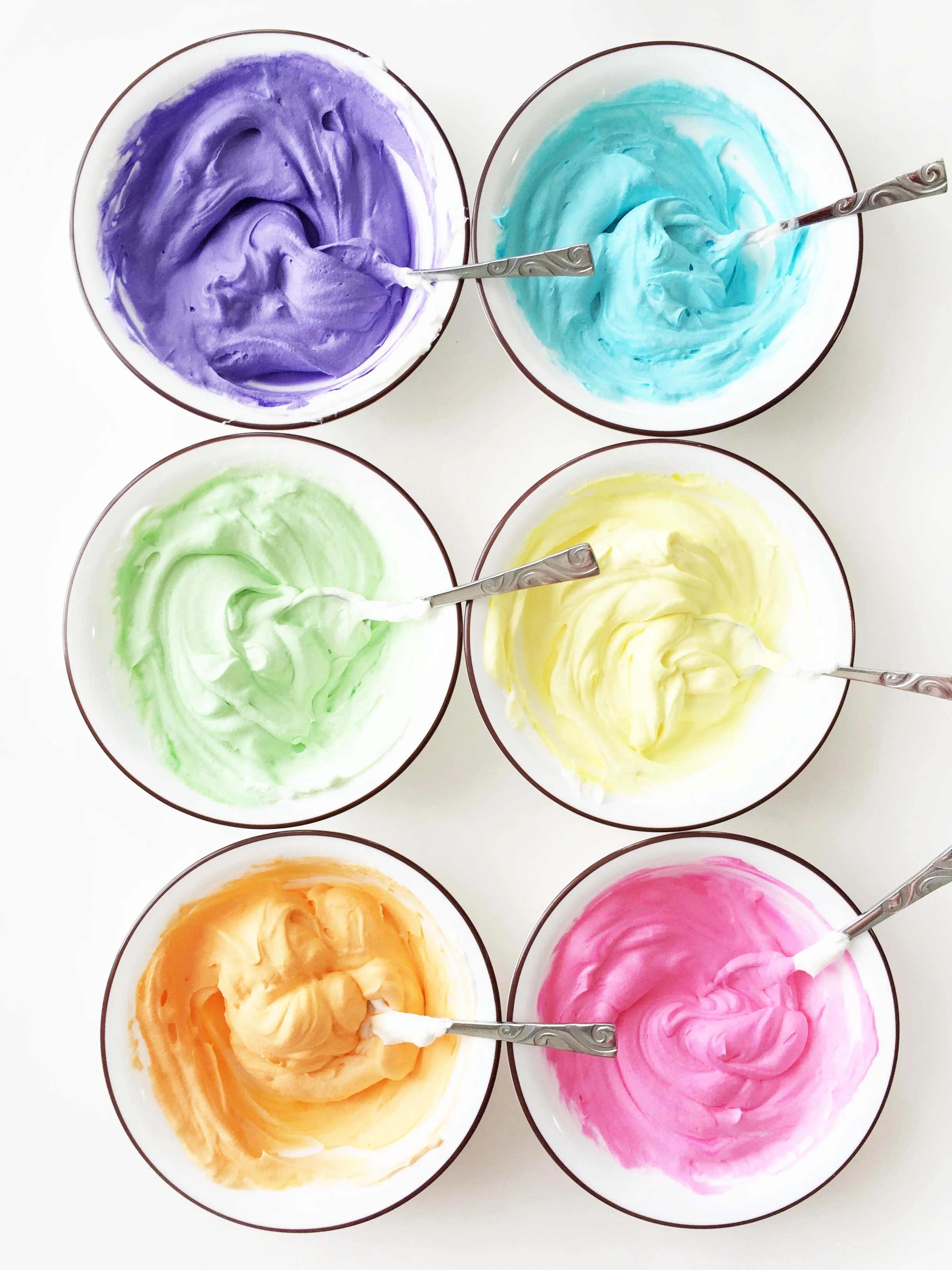To get the brightest colors possible, I used gel food colors with about 20 drops of coloring per bowl.