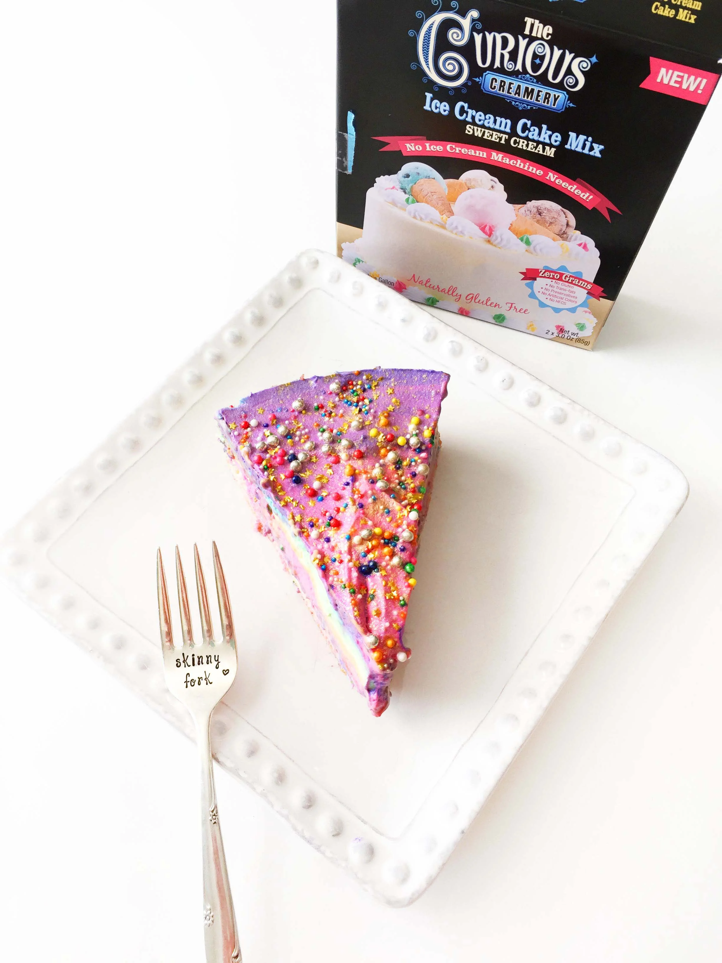 This Unicorn Ice Cream Cake is really simple to pull together. For the base 'crust' of the cake I used my traditional methods of lightening up a vanilla cake mix, and then halved it to give just enough for the 'crust'. The ice cream cake though, is made with The Curious Creamery Ice Cream Cake Mix.