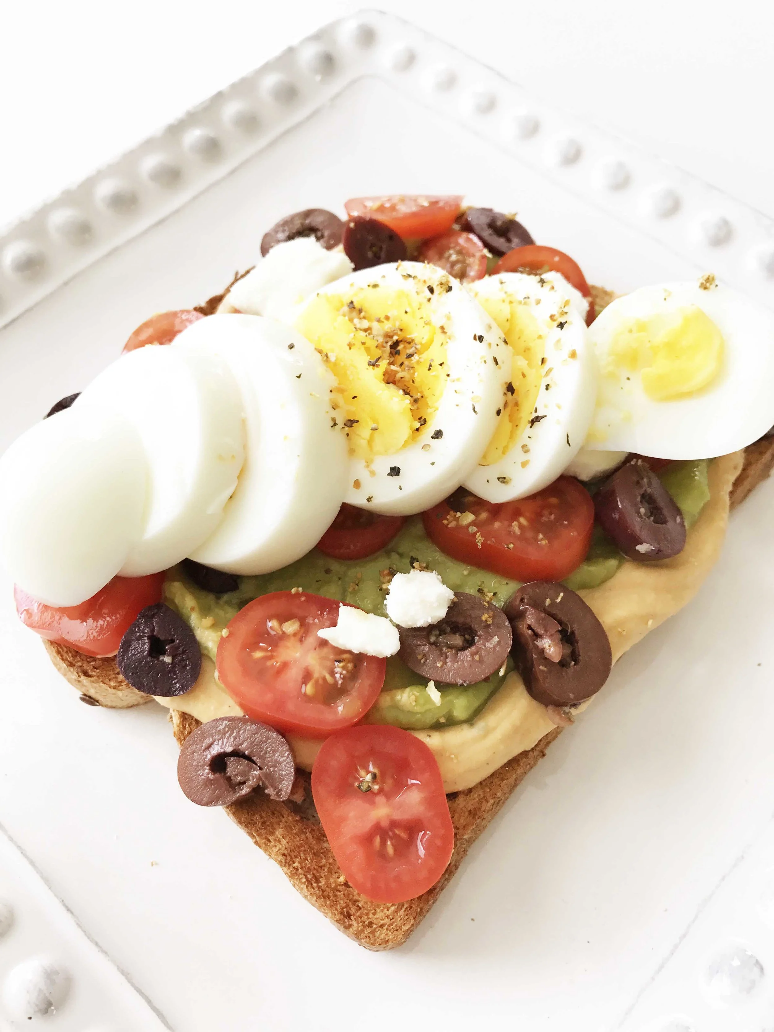 In Clean Eating, Greek, Meatless, Lunch, Snacks, Vegetarian Tags toast, avocado, hummus, olives, feta, tomatoes