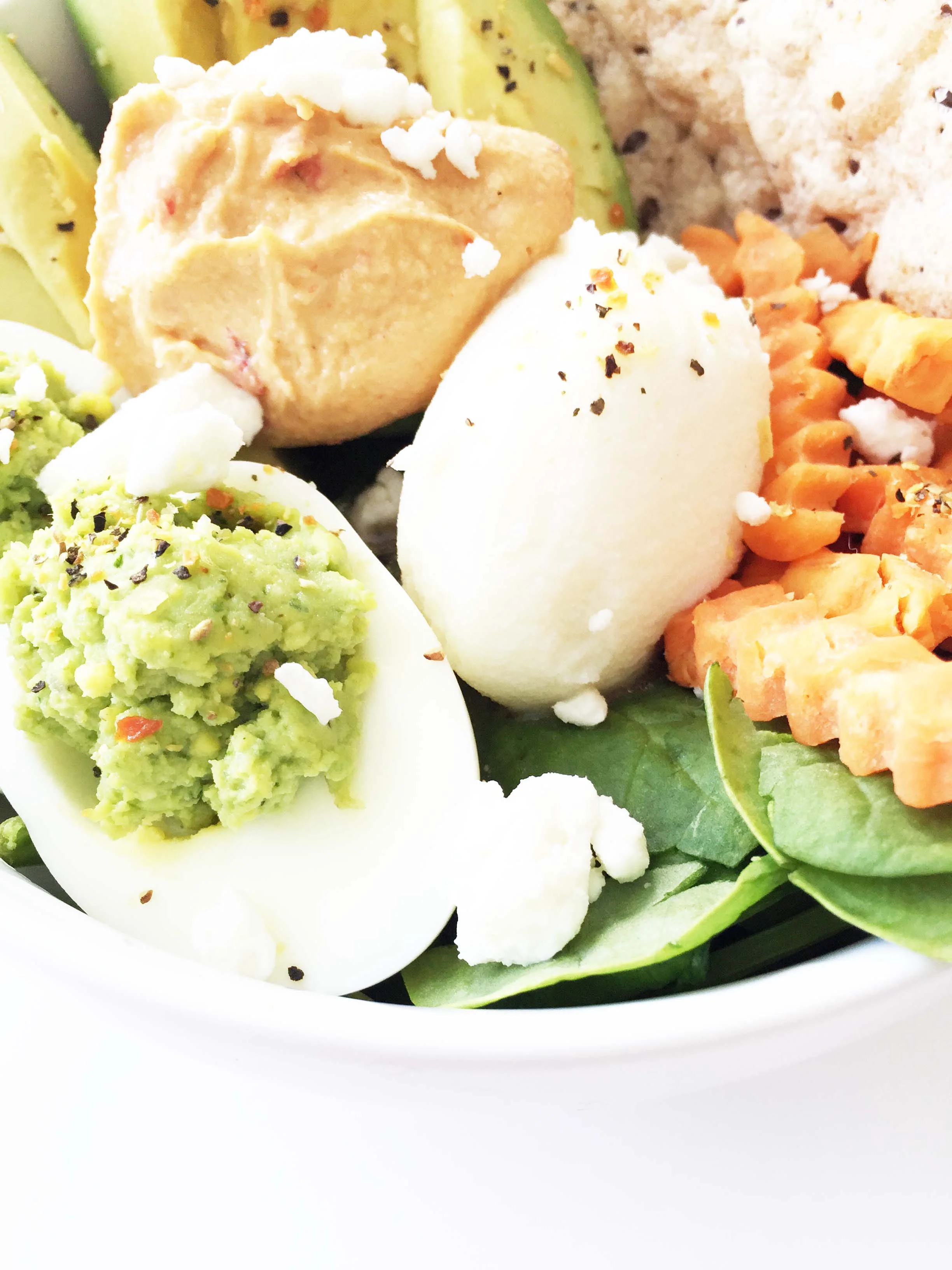 In Clean Eating, Gluten Free, Greek, Lunch, Meatless, Vegetarian Tags salad, bowl, lunch, greek, Mediterranean, egg, sweet potato, avocado, hummus, ricotta