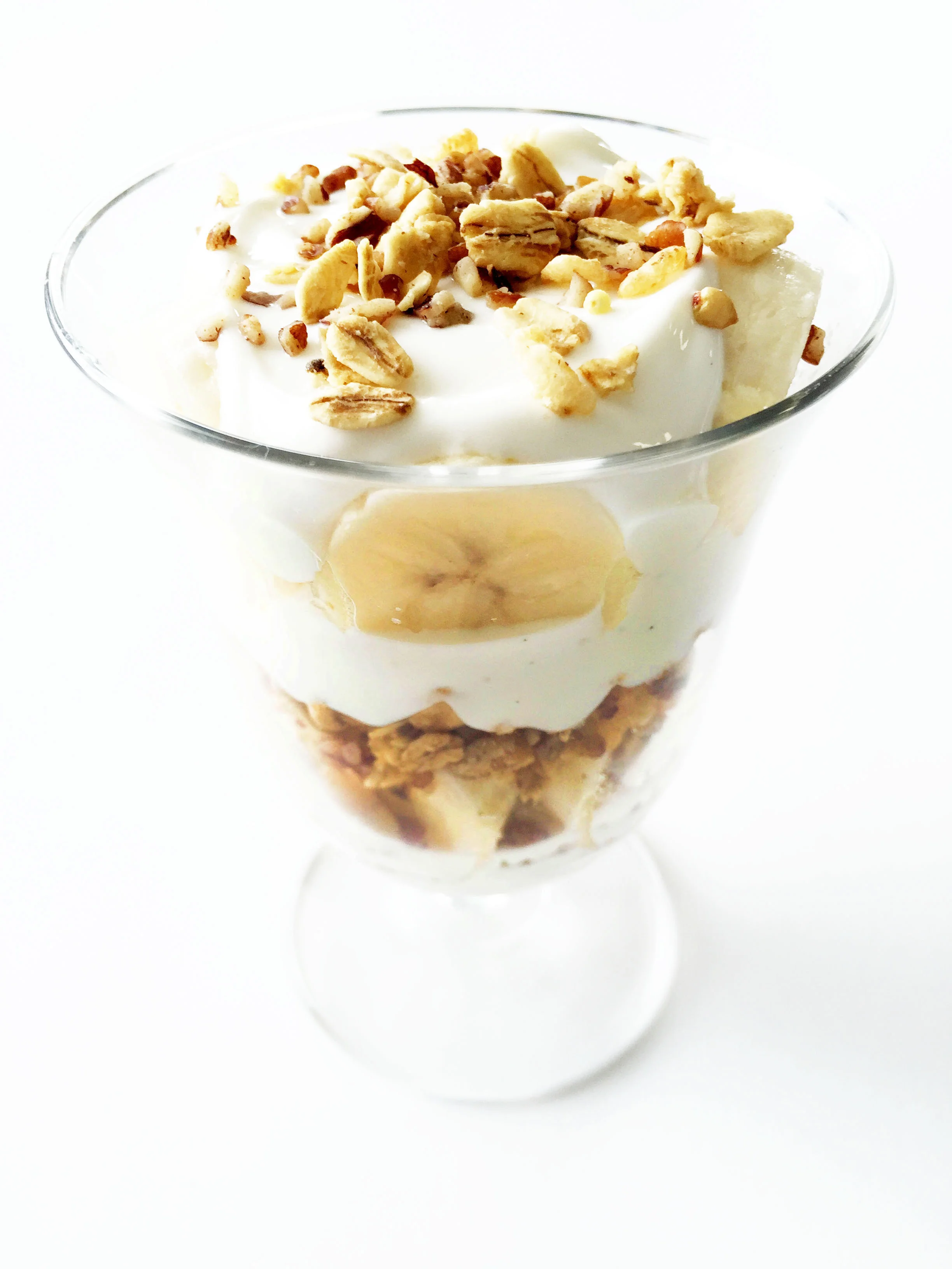 In Brunch, Breakfast, Desserts, Snacks, Vegetarian Tags Banana, nut, parfait, granola, yogurt, breakfast, easy