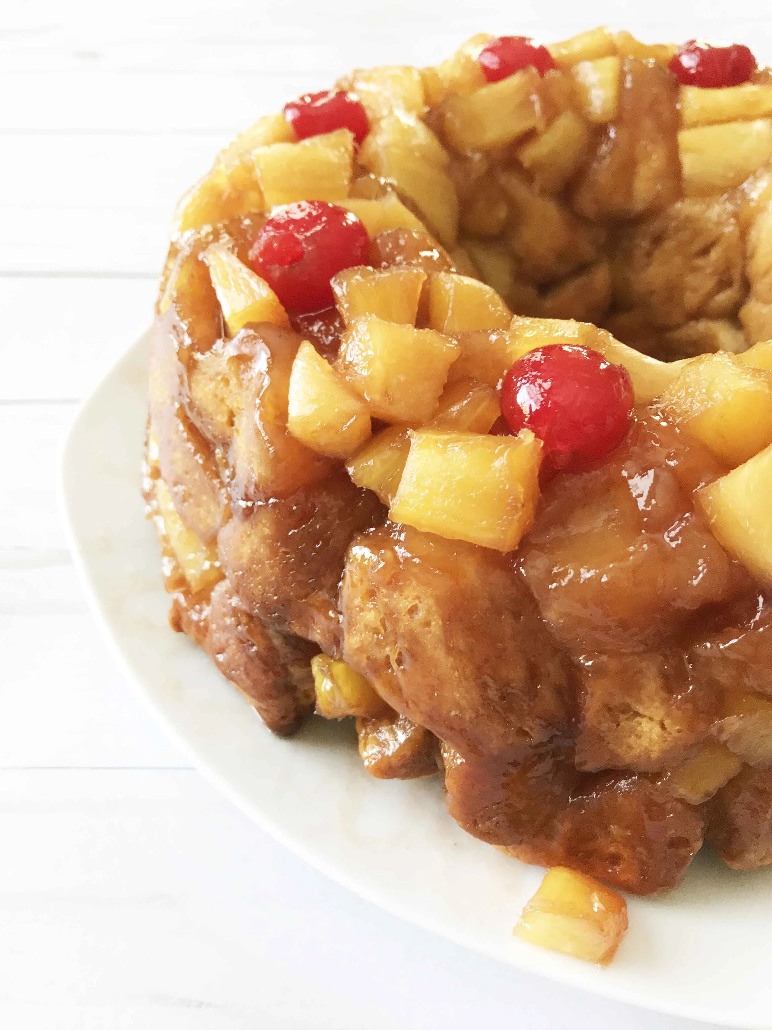 Pineapple upside-down cake is one of my favorites, and in keeping with the Hawaiian and pineapple theme of the week, I thought a fun Hawaiian themed take on monkey bread would be perfect! This week treat is relatively easy to make and tastes just like the cake. One of the best parts, is that with it being monkey bread, you automatically have an excuse to eat it for breakfast or brunch!