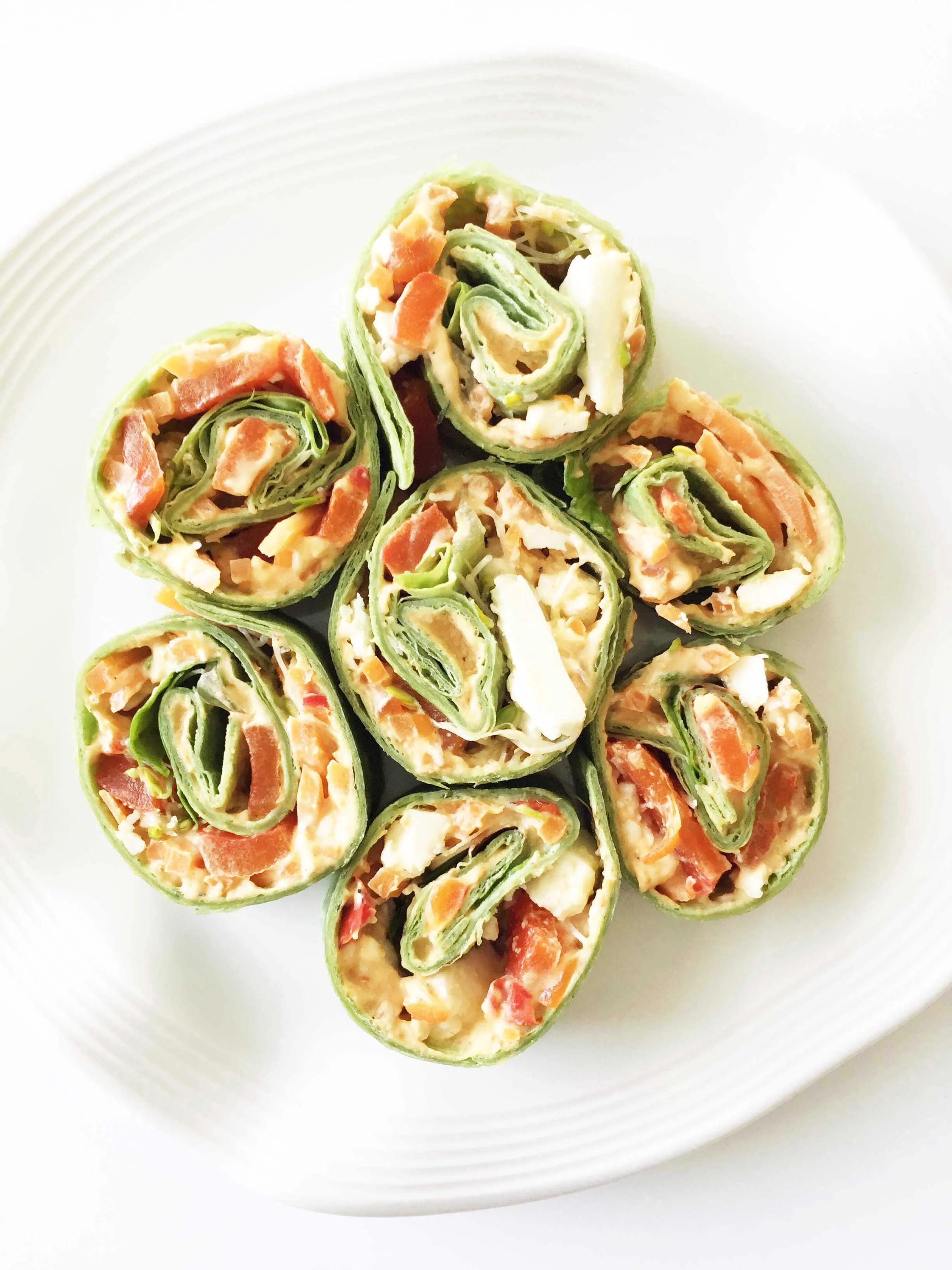 Last week I made my own homemade 5 Ingredient Roasted Red Pepper Hummus, and I made a pretty tasty wrap using it. Since the wrap got a really good response over on Facebook, I decided that I would go ahead and post my actual recipe for it. The only change that I've made is making the wrap into pinwheels so that it could be served as either an appetizer or a fun little 'snackable' lunch option. Plus, let's face it... they are so bright and colorful this way!