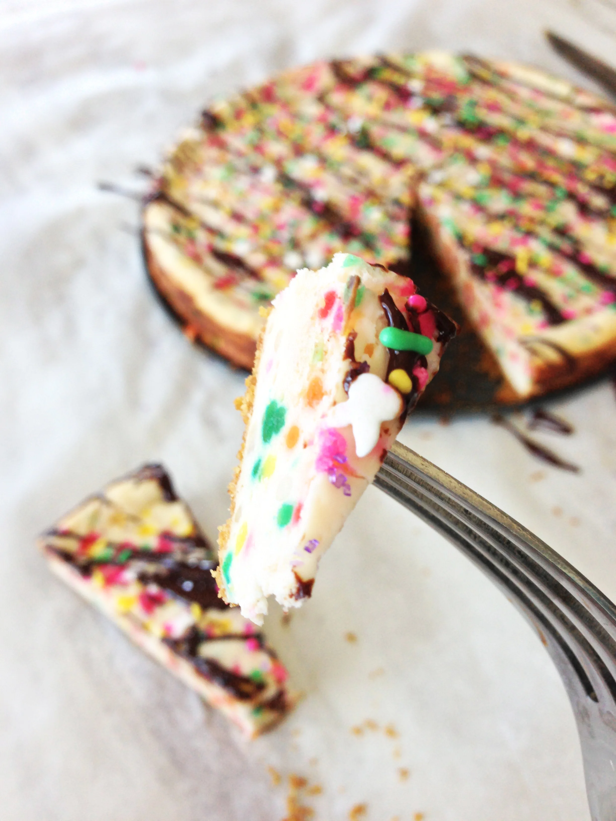 I'll admit. My first attempt at creating this skinny cheesecake recipe was a total flop. A catastrophe of epic proportions. It was ridiculous how sad I was to see all those fun little rainbow sprinkles in ruin.