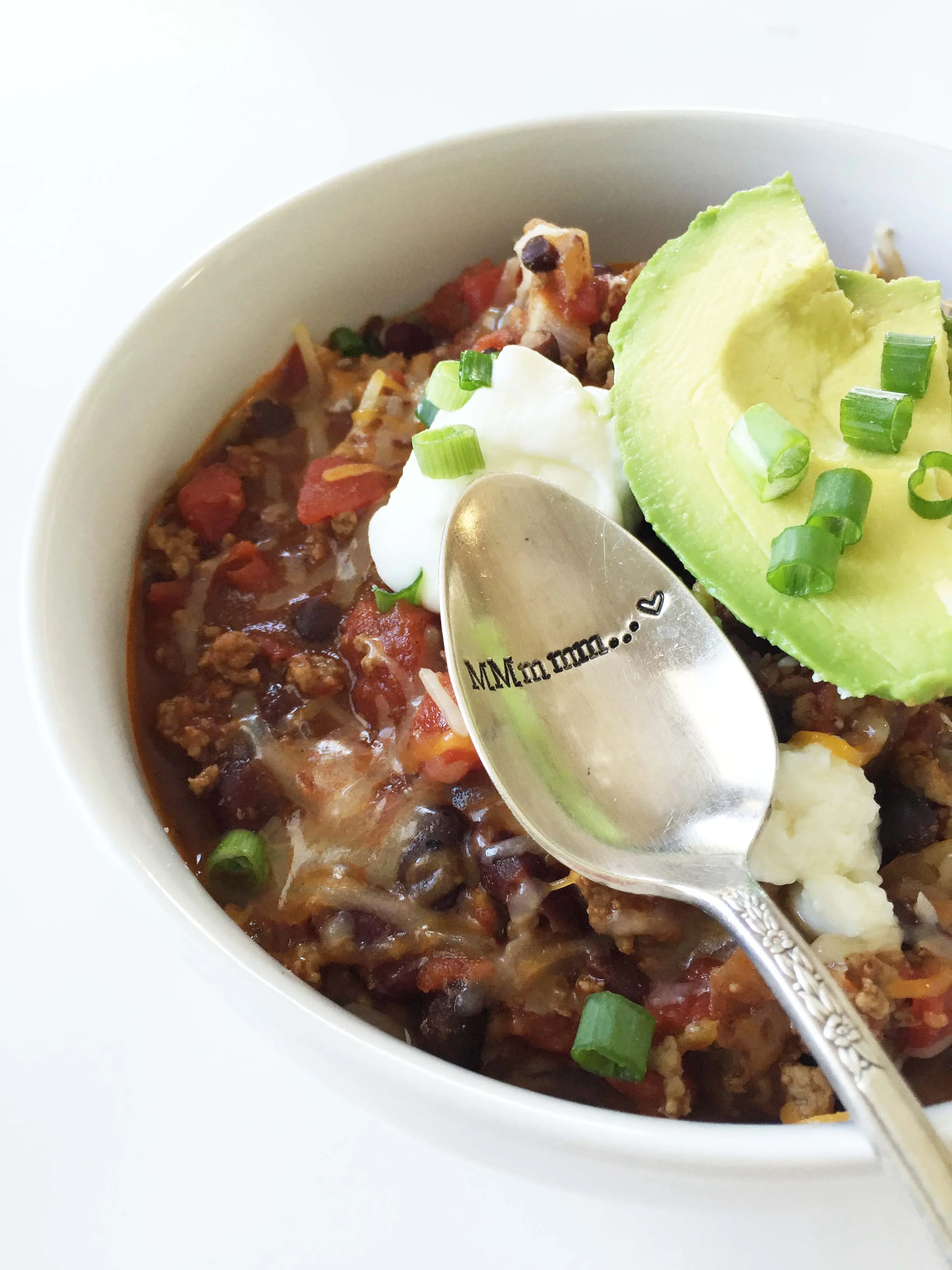 I topped my chili with some of my favorites; reduced fat shredded Mexican cheese, queso fresco, reduced fat plain greek yogurt, avocado, and green onions! Some fresh cilantro would also be a nice touch.