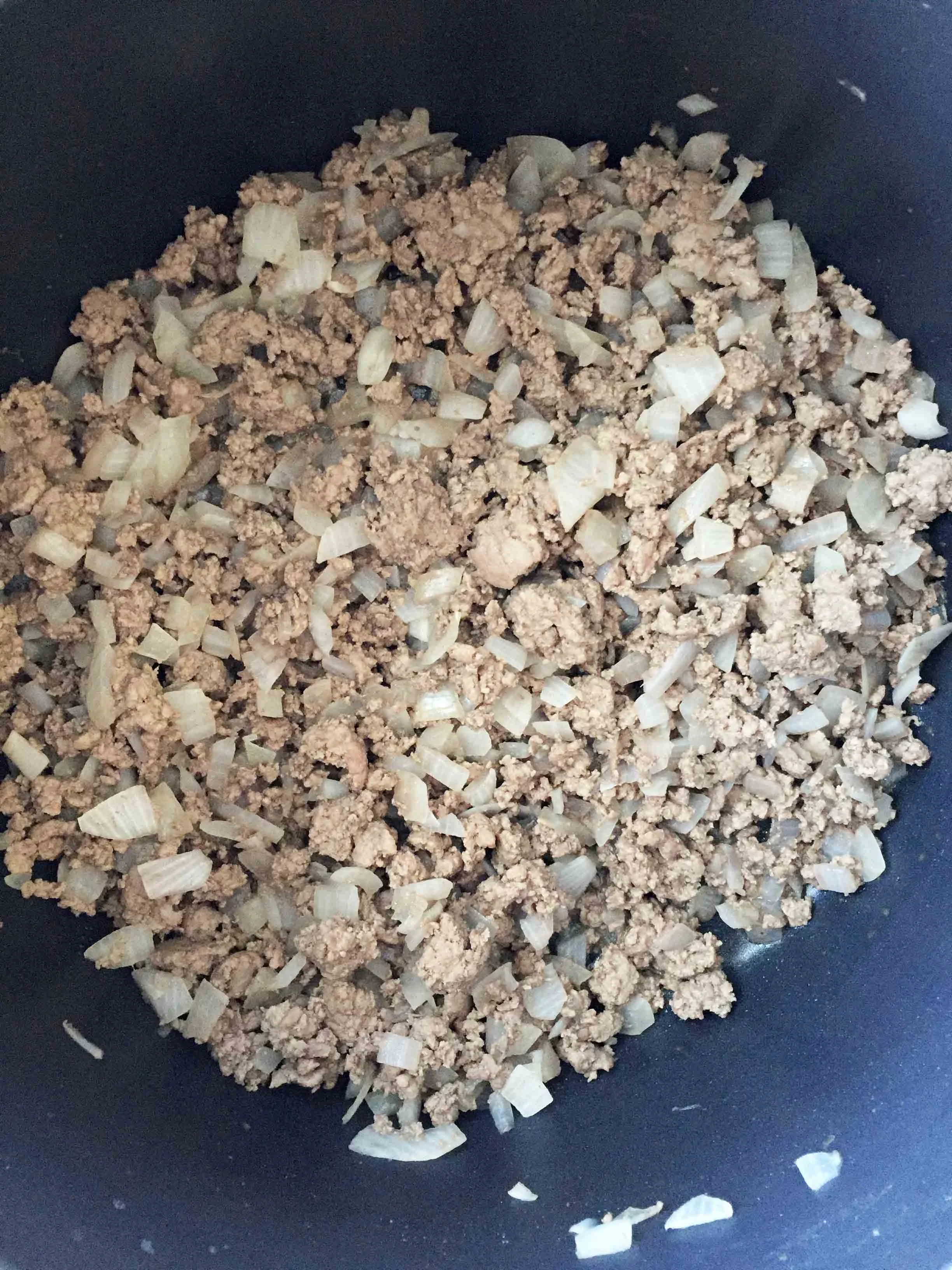 Place the beef and onion into a large stock/soup pot and cook over medium-high heat for 5-10 minutes or until the meat is cooked through and the onions are tender.