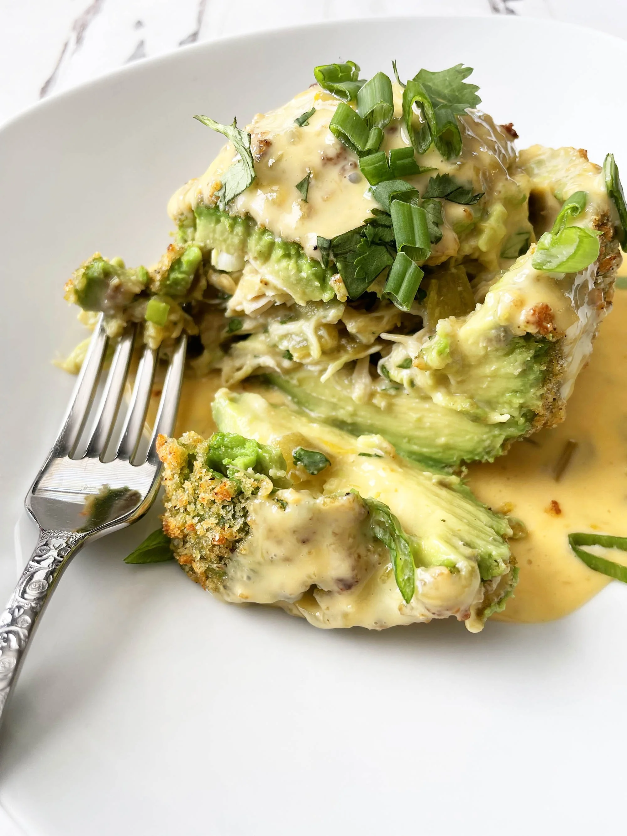 You can serve these stuffed avocados as-is or with salsa, queso, or any other Tex-Mex style sauce you might desire. There really isn’t a whole lot here that you can do to ‘lighten’ this dish up. I did use boneless skinless chicken breast and loaded it up with green onion, fresh herbs, and some cheesy goodness.