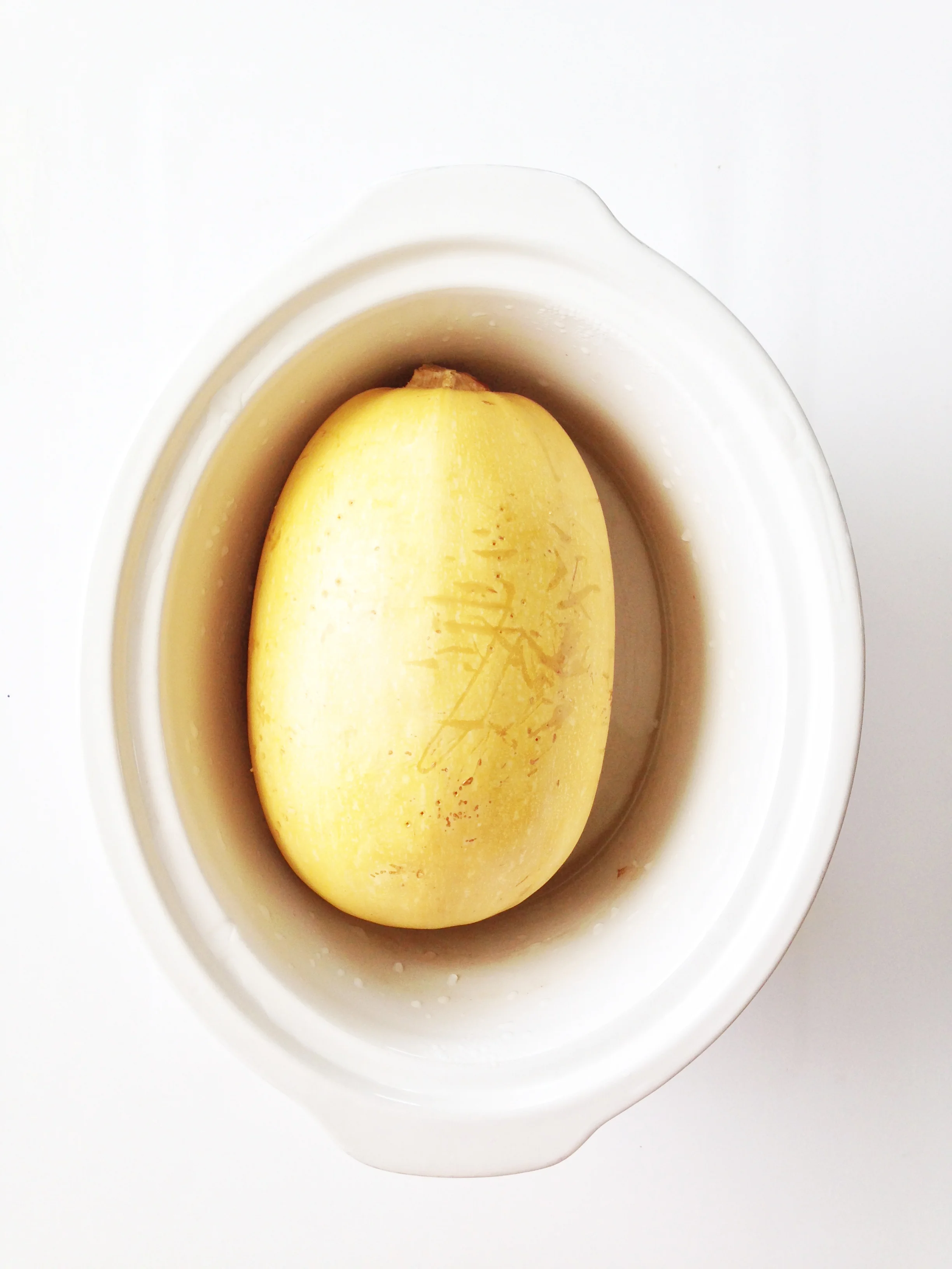 Pierce the squash all over (just as you would a potato before cooking) and place it whole into a crock pot. Add about 2 cups of water to the slow cooker and cook on high for 4-6 hours or low for 6-8 hours.