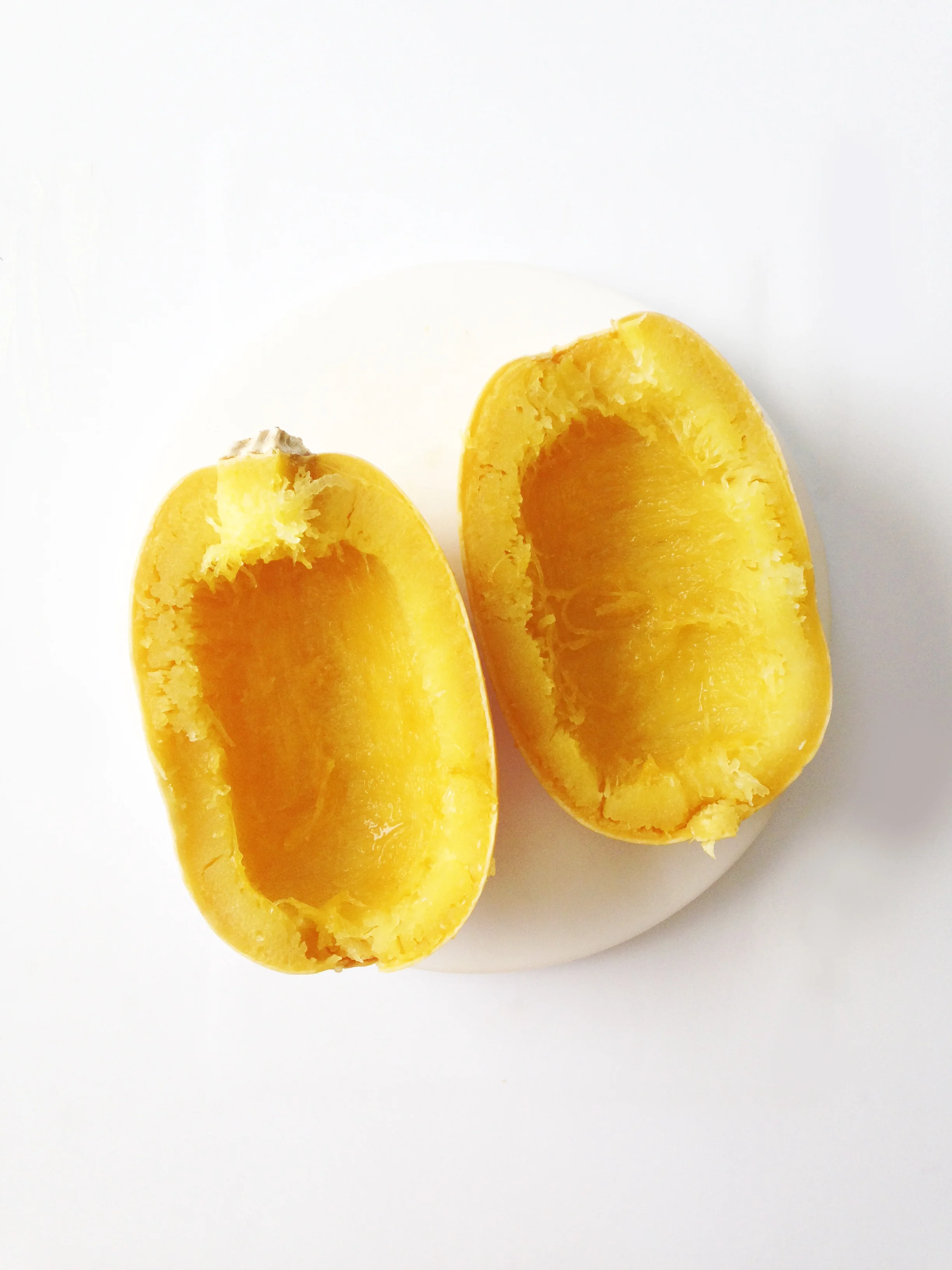 Once the squash is cooked, preheat the oven to 425 degrees and scoop out the pulp and seeds from the squash to discard or use for something else.