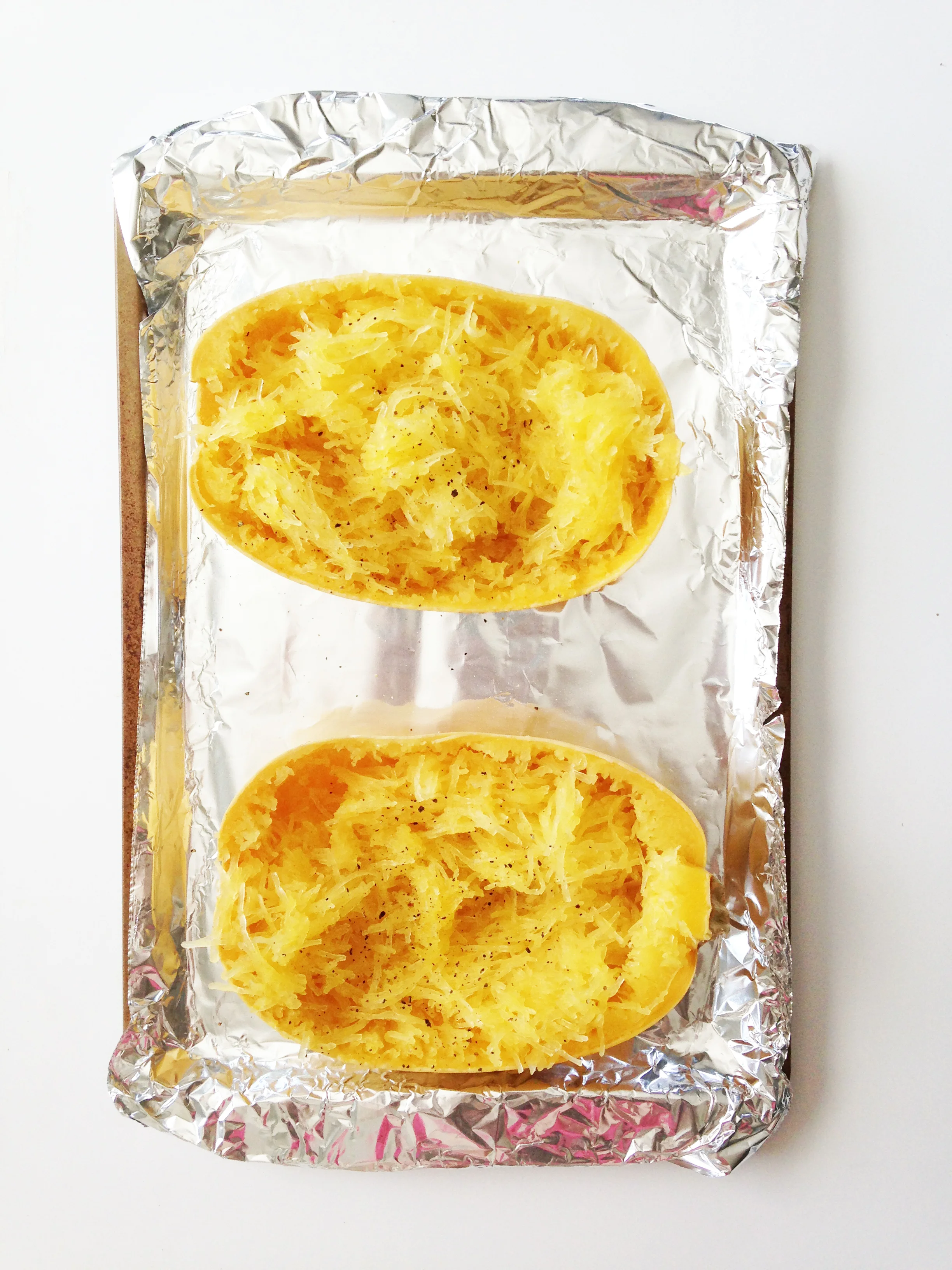 Preheat the oven to 350 degress F. Cut your spaghetti squash in half and scoop out all the pulp and seeds. Season with salt and pepper to taste. Bake for an hour until the meat of the squash is tender and gives at the touch of a fork.