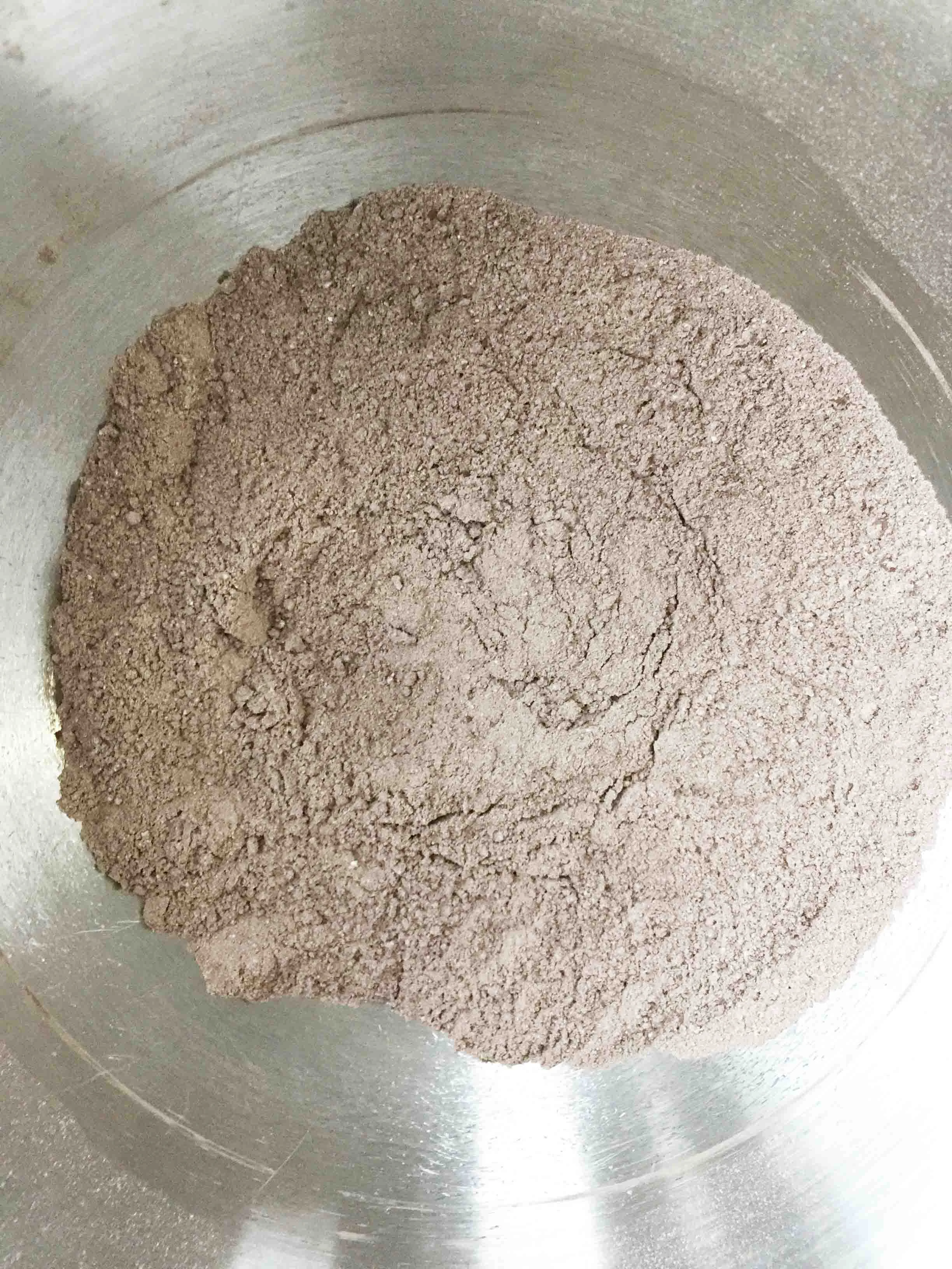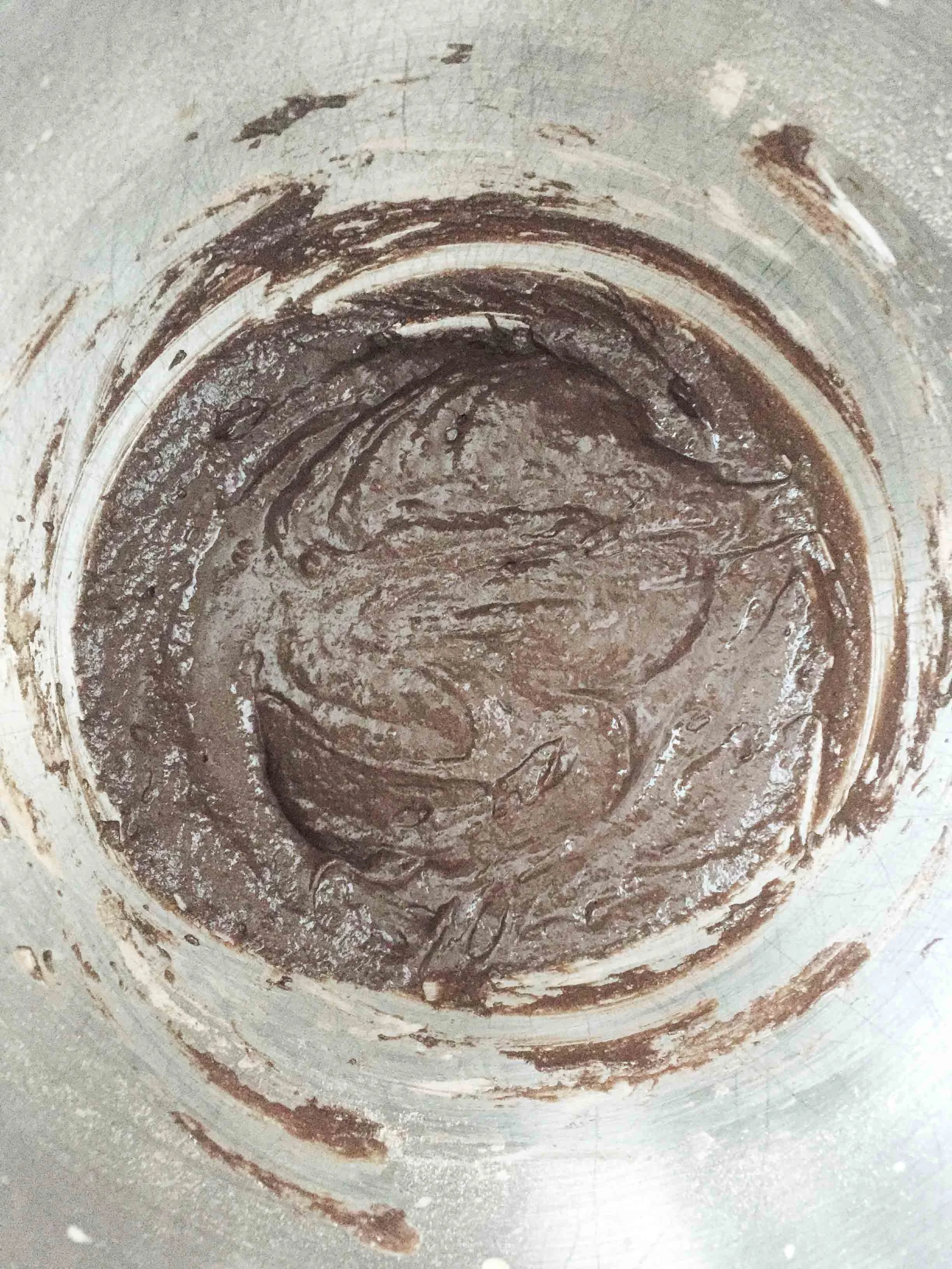 Whisk together the flours, cocoa powder, sugar, sweetener, baking powder, and baking soda into a medium bowl.