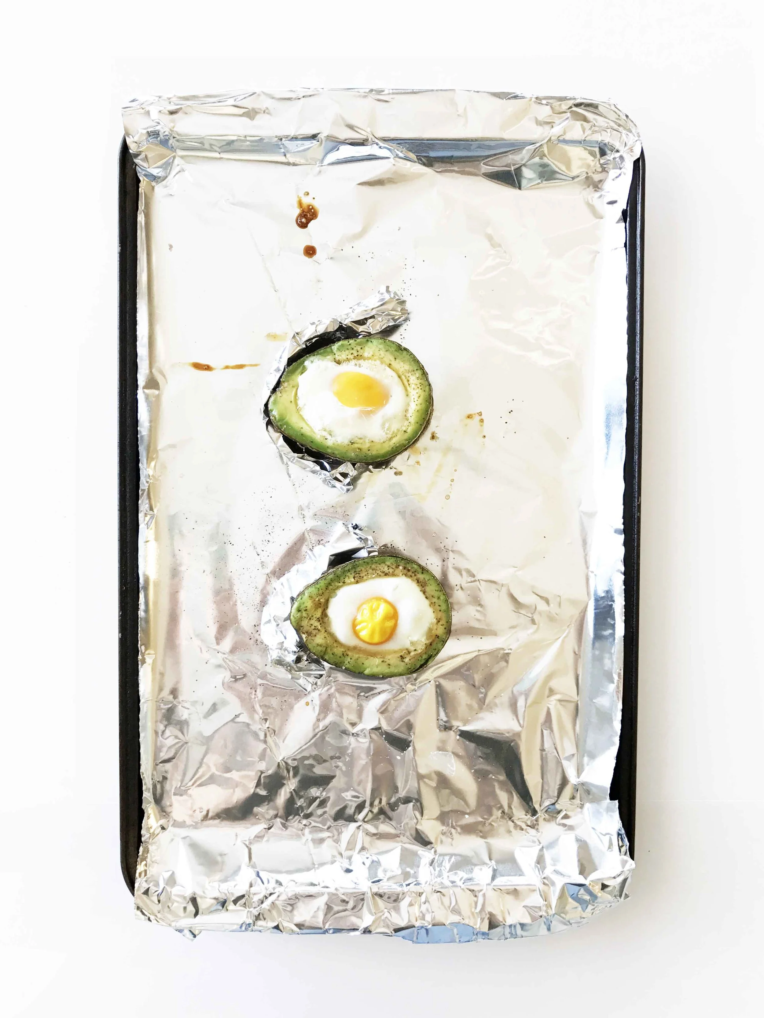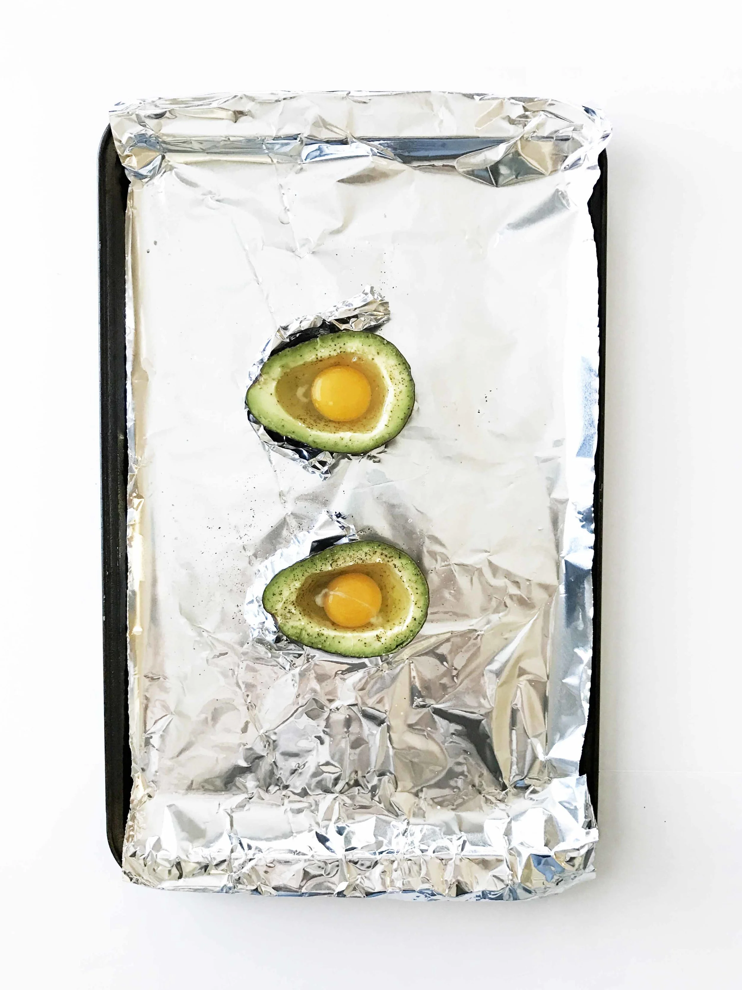 Pour the eggs into the avocado halves and place into the oven to bake for about 20 minutes or until the eggs are nearly cooked through to your liking.
