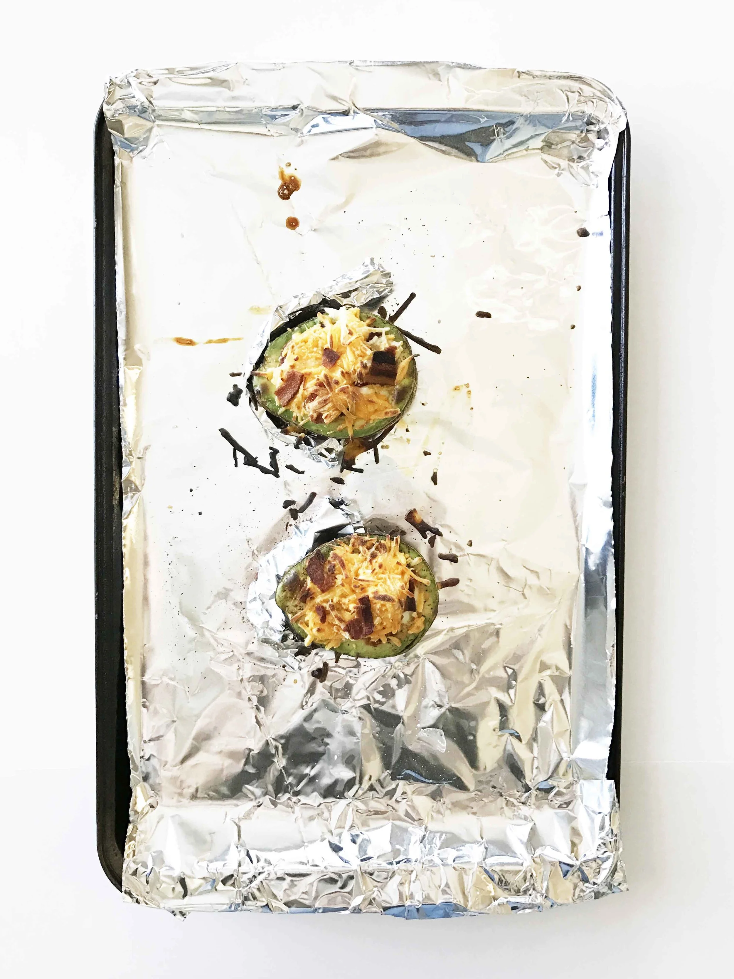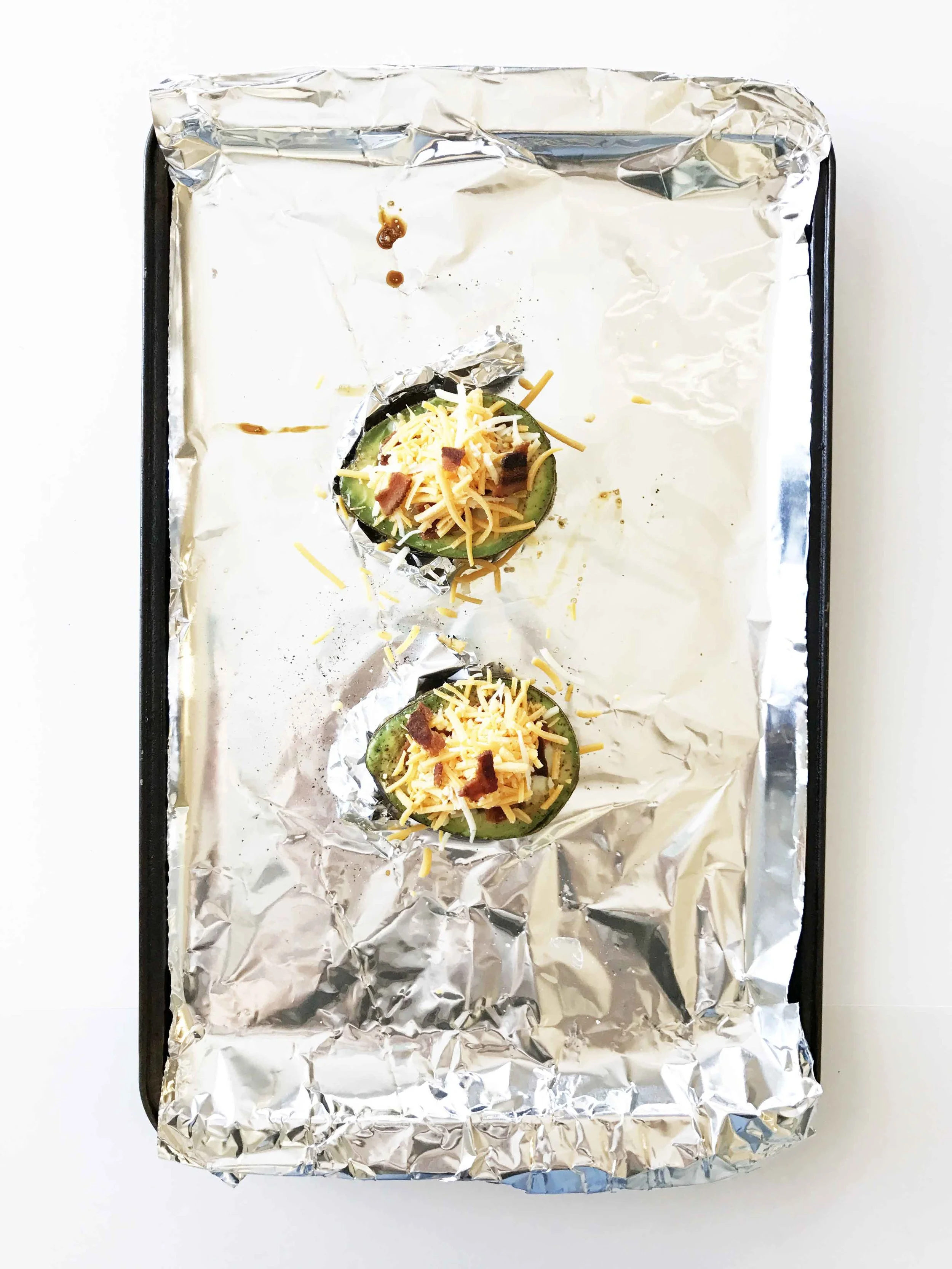 Once nearly done, remove the pan from the oven and sprinkle each avocado half with 2 Tbsp. cheese and one piece of crumbled up bacon.