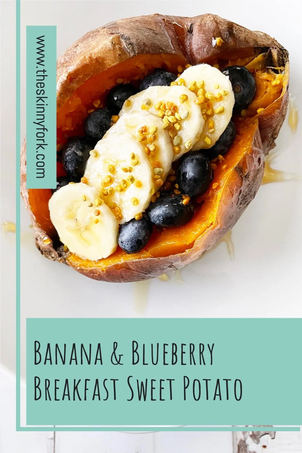 These sweet potatoes are baked and then simply stuffed with fresh blueberries, a touch of butter, banana, and honey! I added a touch of bee pollen to mine too for an extra bit of bitter and a little more of a sweet note.