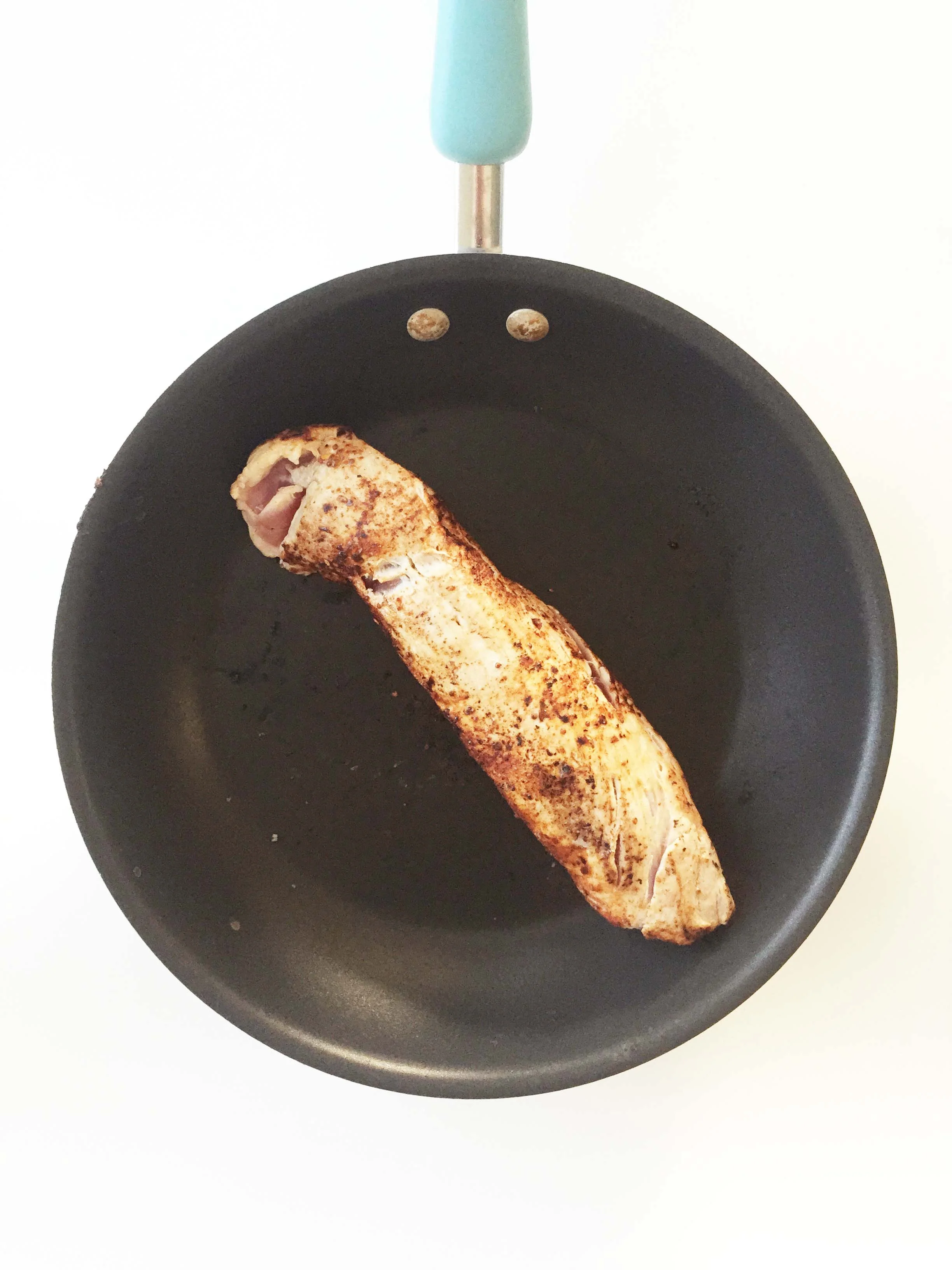 Coat the tenderloin with the pork rub and place it into the skillet once the pan is good and hot.