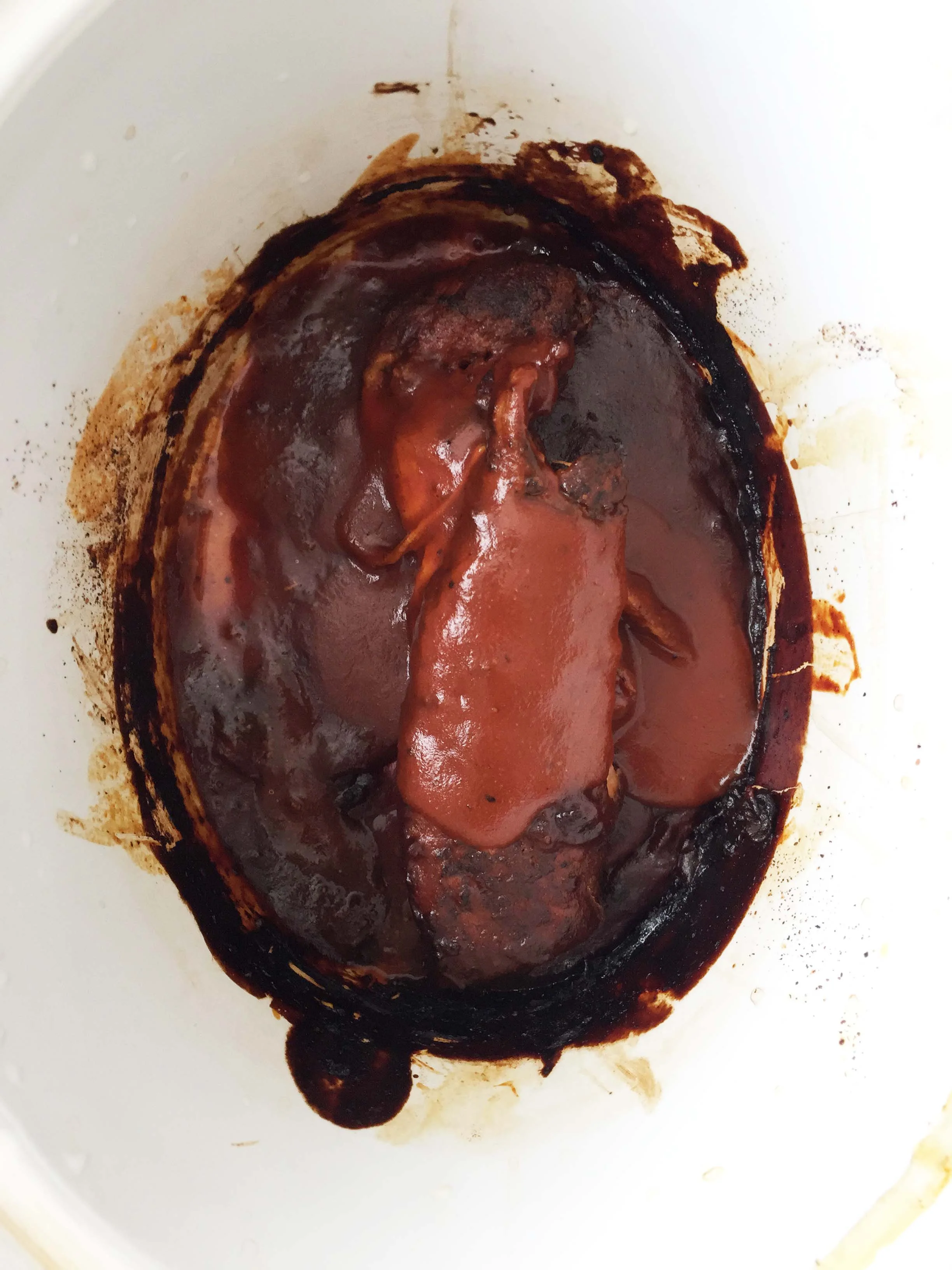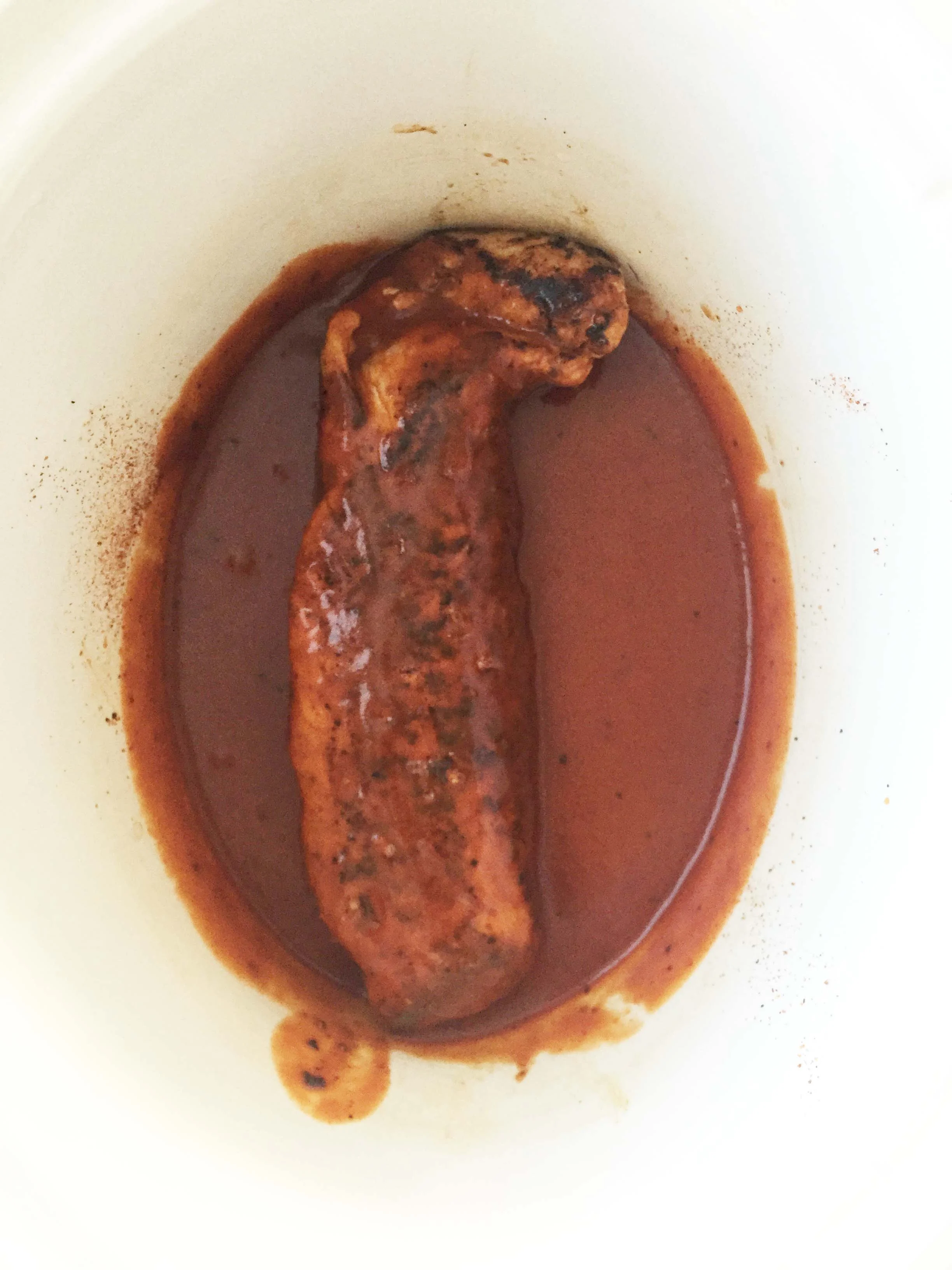 Place the tenderloin into the base of a crock pot with about 1/2 of the bottle of BBQ sauce poured over it.