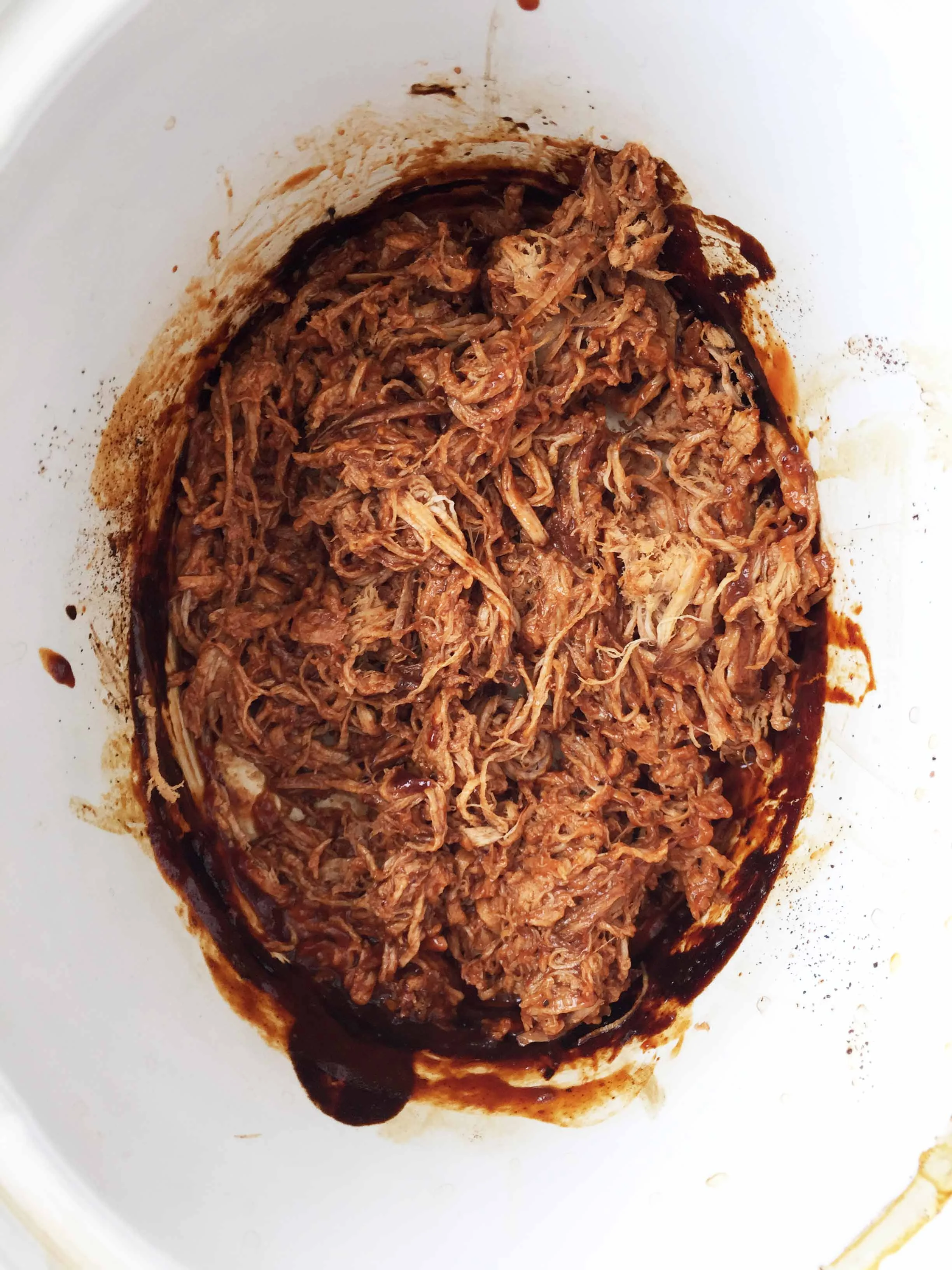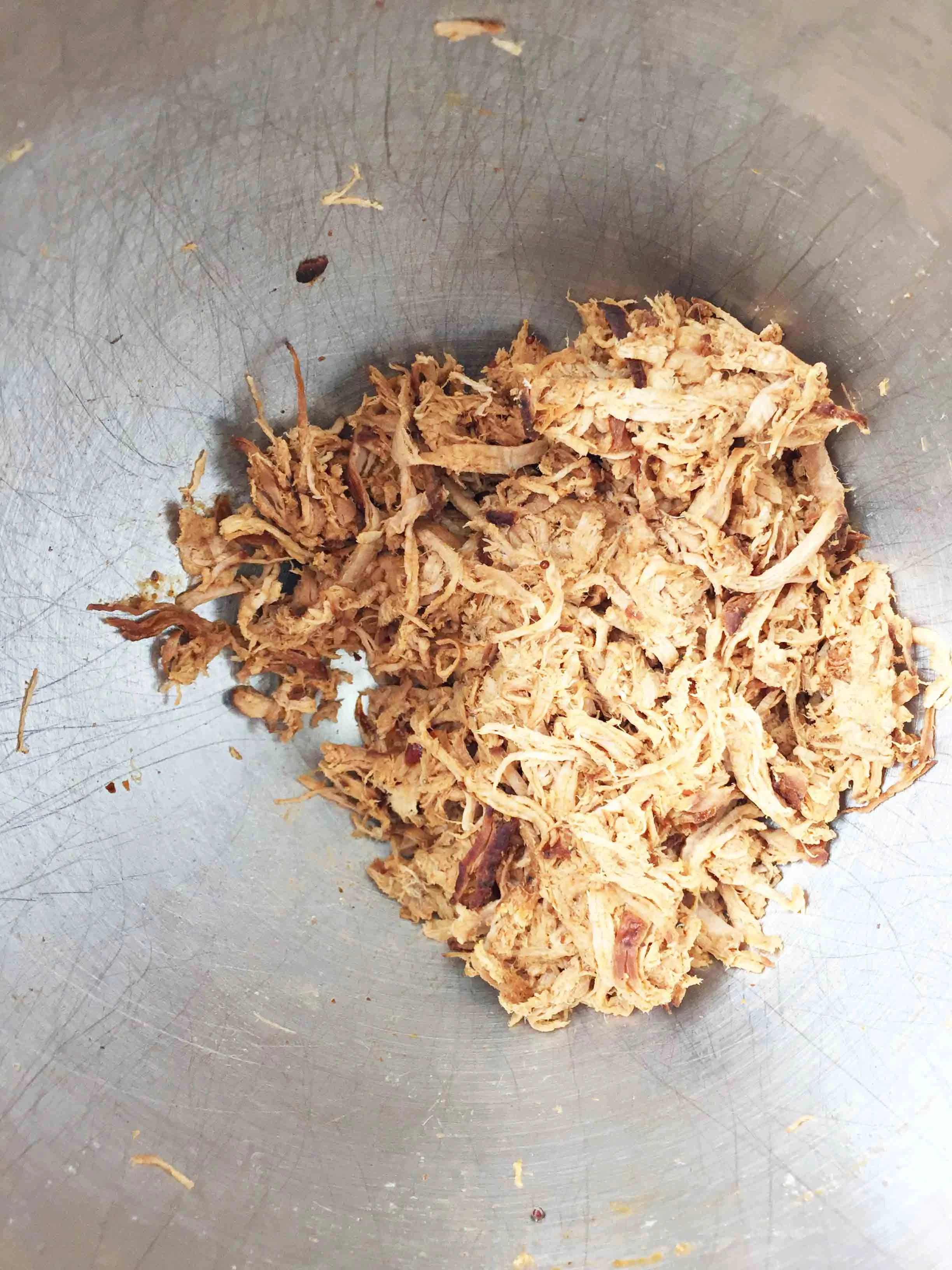 Once the meat is done, transfer it to a large bowl and shred with a fork or with the paddle attachment of a stand mixer.