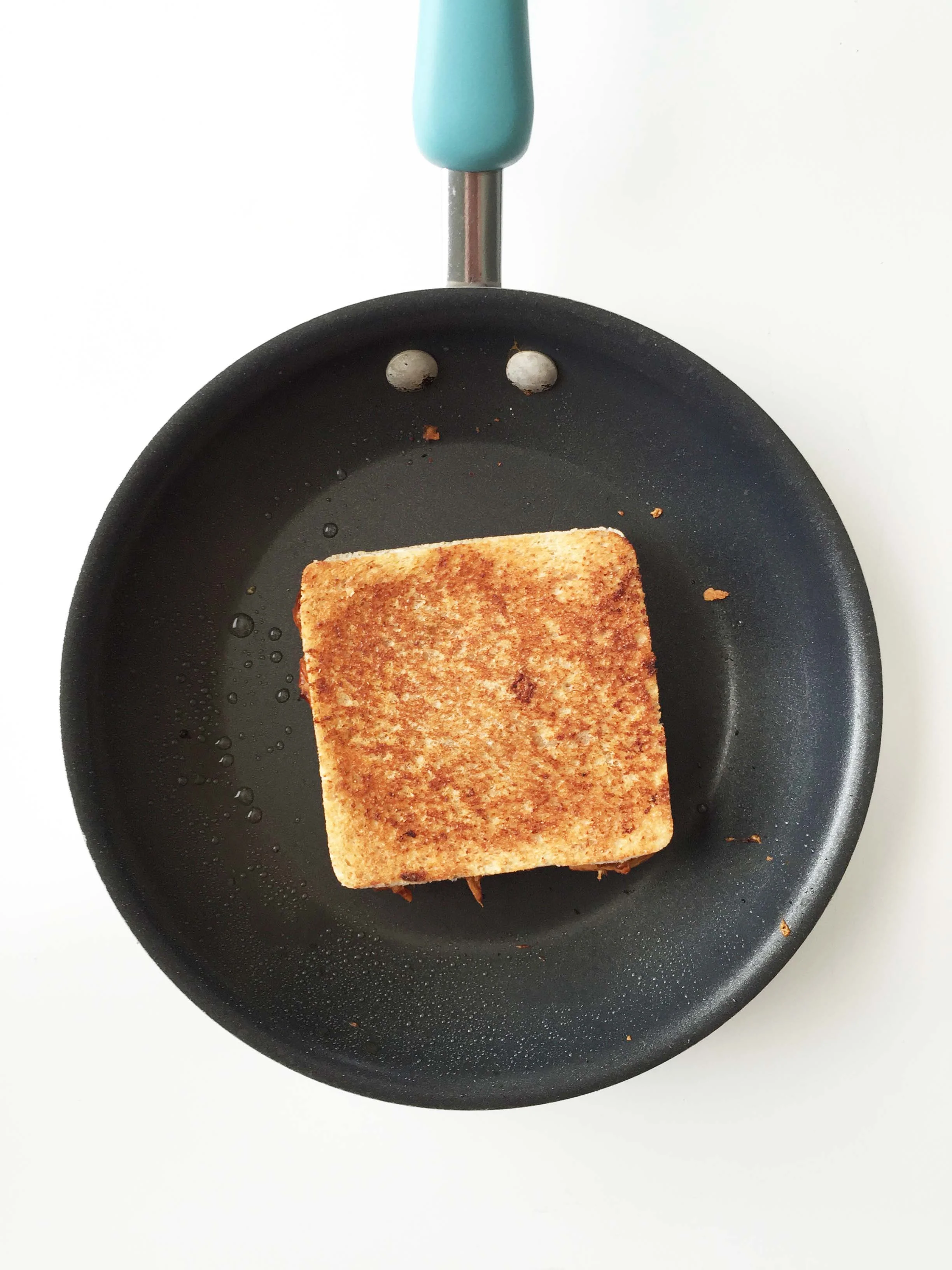 Place the sandwich down carefully into the skillet and allow to brown on one side before flipping over to brown the other side.