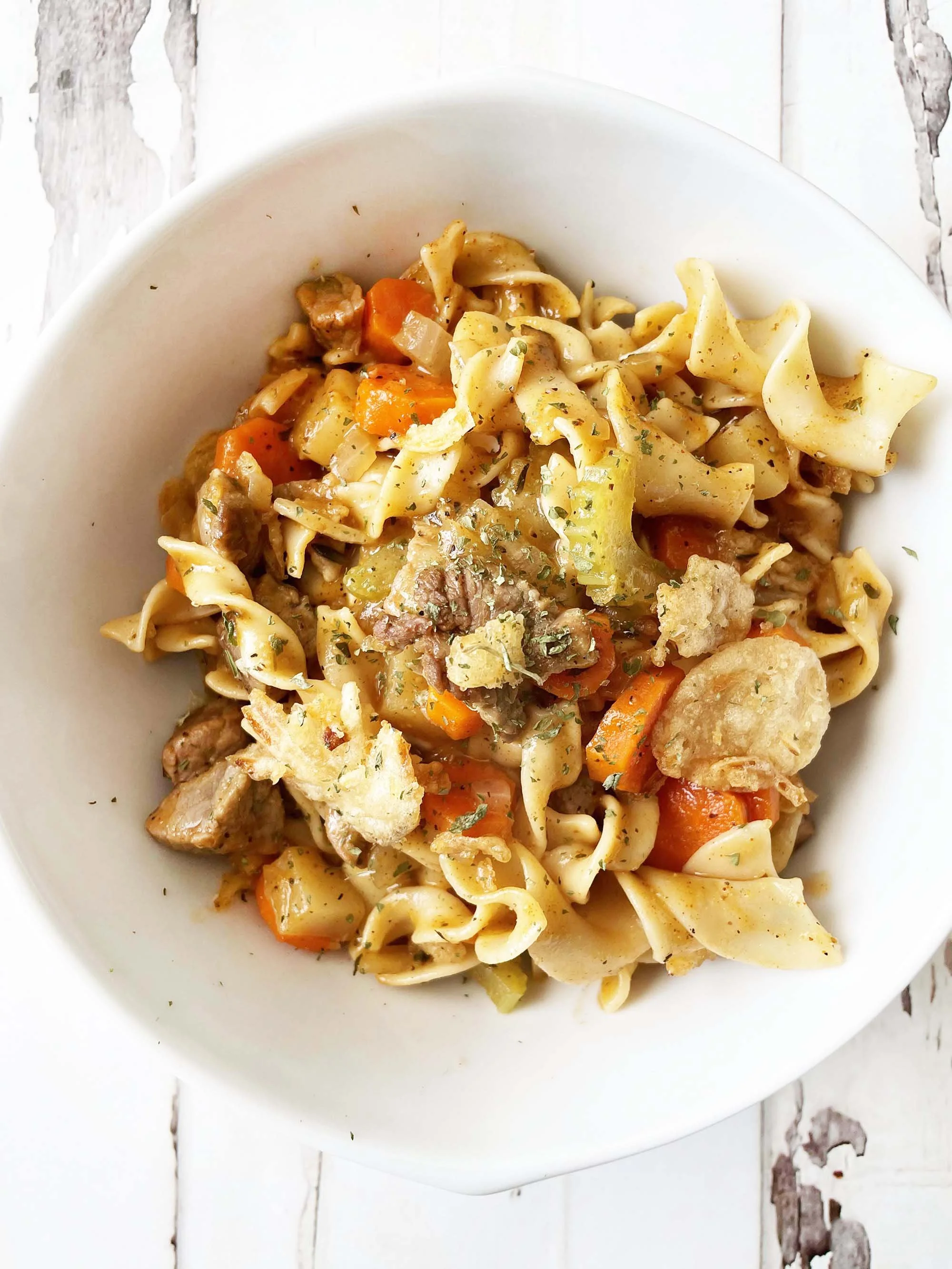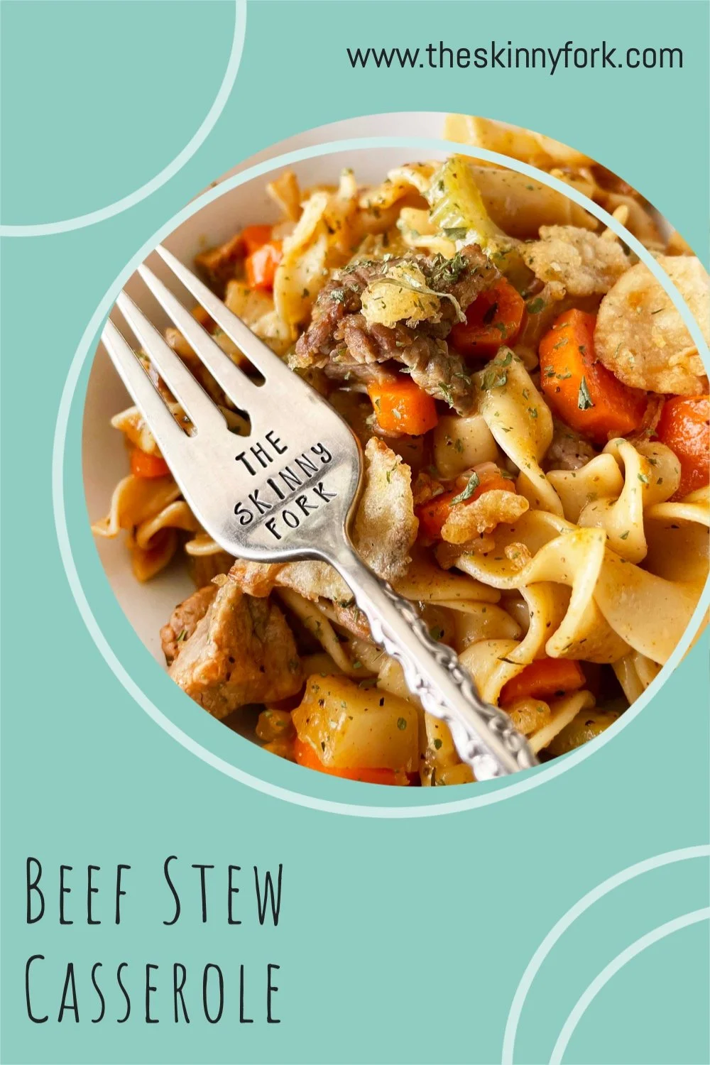 Everything you love about beef stew traditionally is here; beef, carrots, potatoes, celery, onion. All the goods. And to make this a casserole, it’s tossed together and baked with some tasty egg noodles! The noodles soak up a lot of the broth goodness as it bakes together and you end up with a delicious pasta dish that the whole family will love.