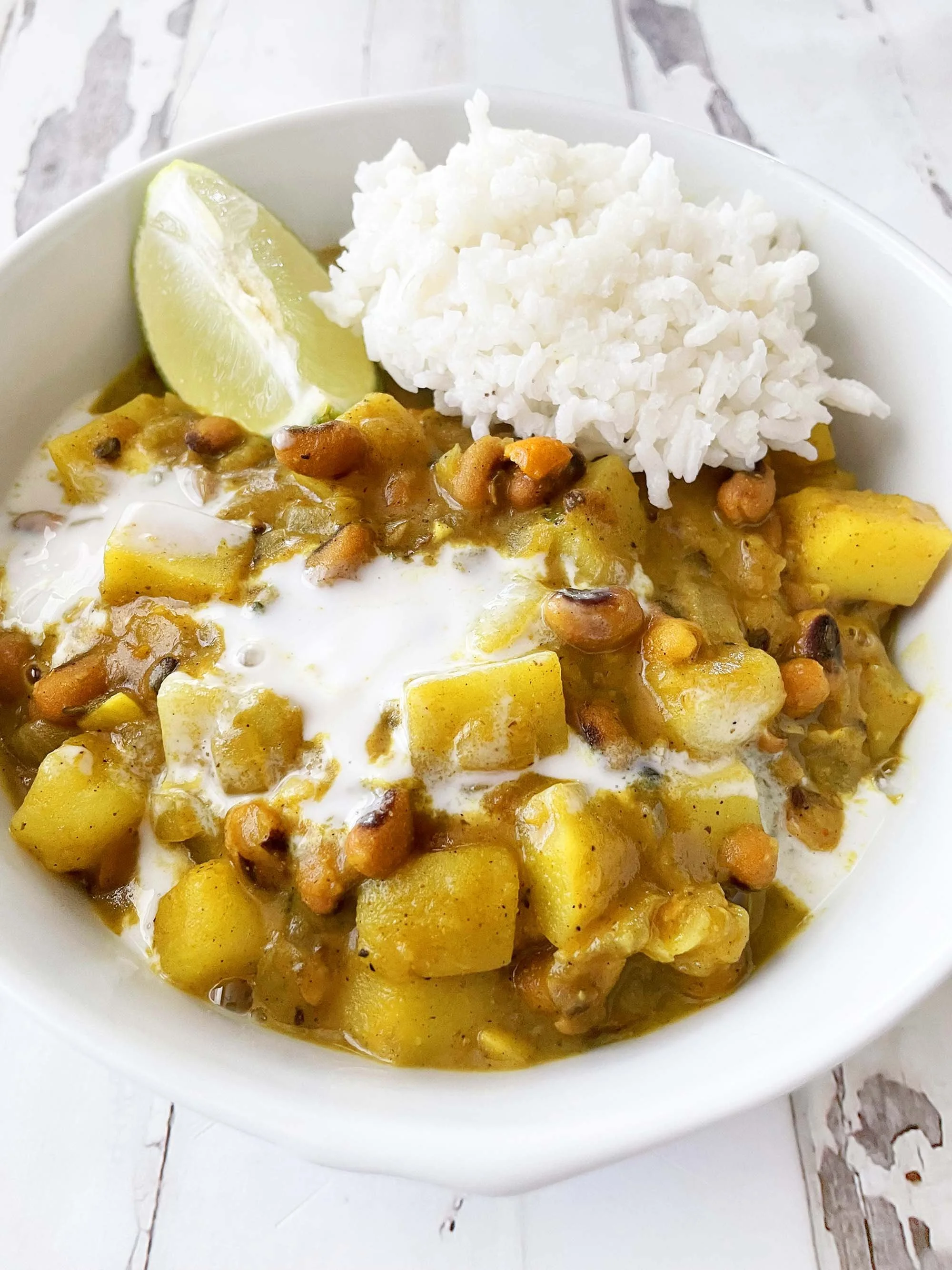 With every spoonful, you'll be captivated by the rich and velvety texture of the curry, showcasing the marriage of tender black-eyed peas, luscious coconut milk, and a harmonious blend of lively Indian spices. Each ingredient works in unison, creating a symphony of flavors that dance on your palate.