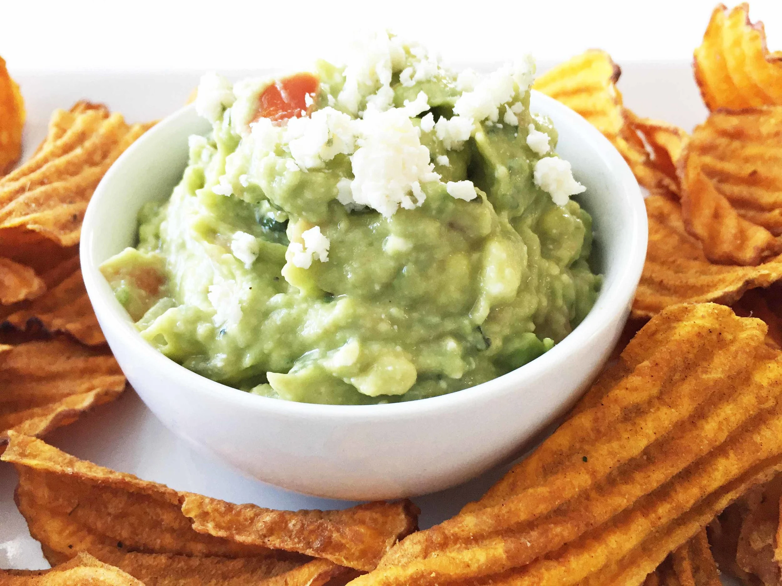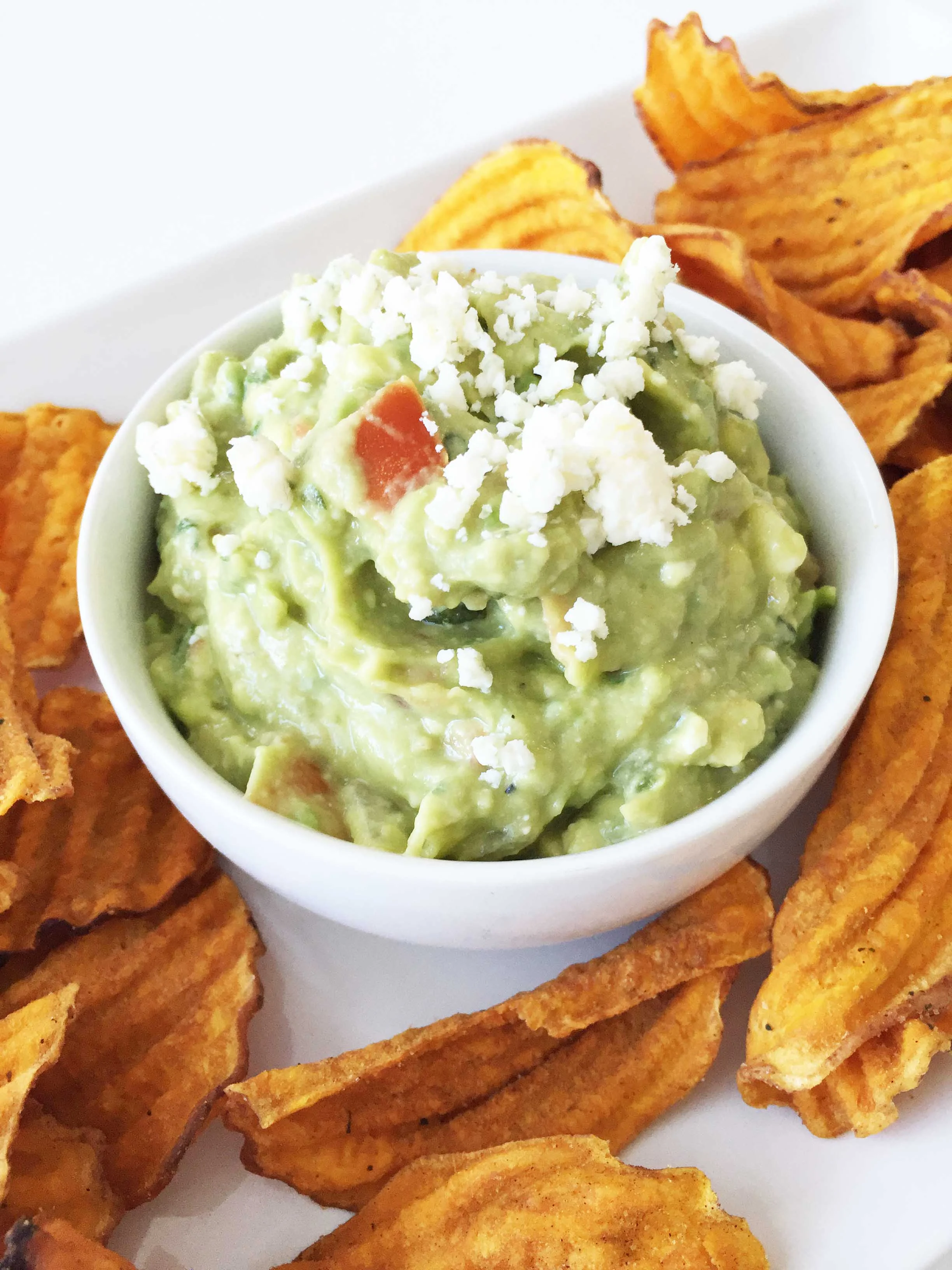 I served my guacamole with some spiced sweet potato chips that were perfect for dipping and also fall in line perfectly to make this even more of a festive holiday appetizer. Pun totally intended.