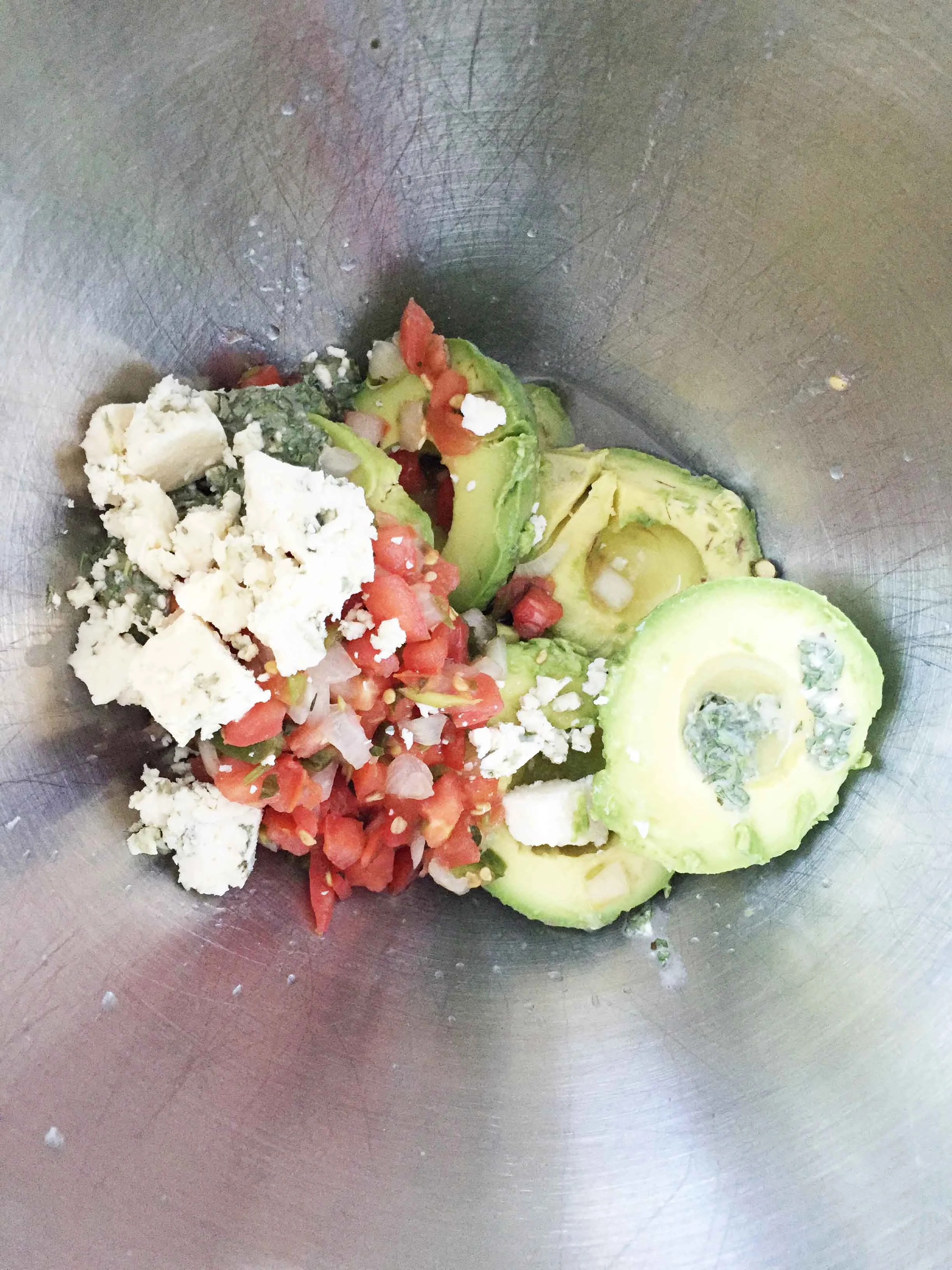 Add the basil and blue cheese vinaigrette mixture into a medium bowl with the two avocados, juice of one lime, 1/4 c. blue cheese crumbles, jalapeño, tomato, and onion.