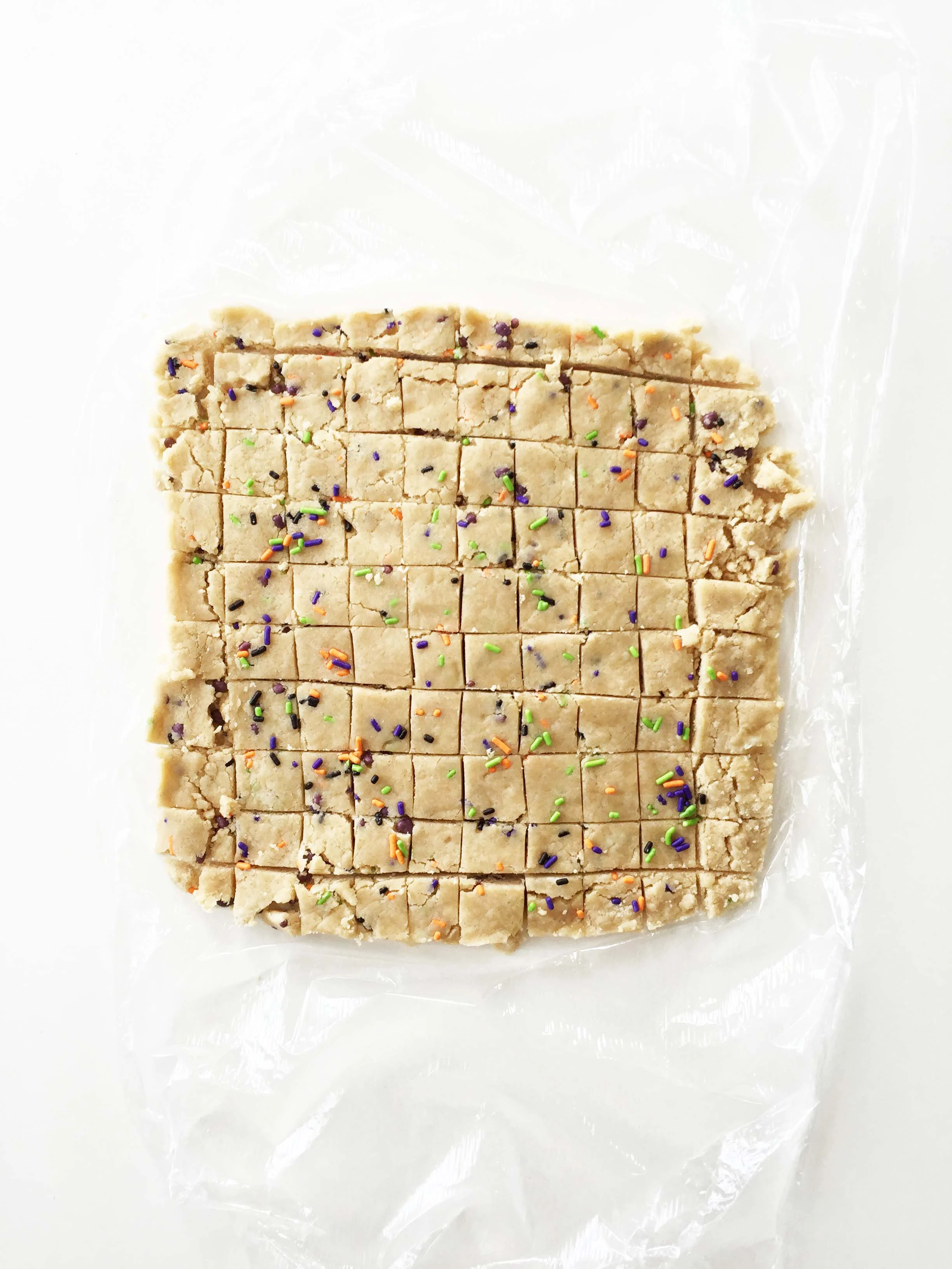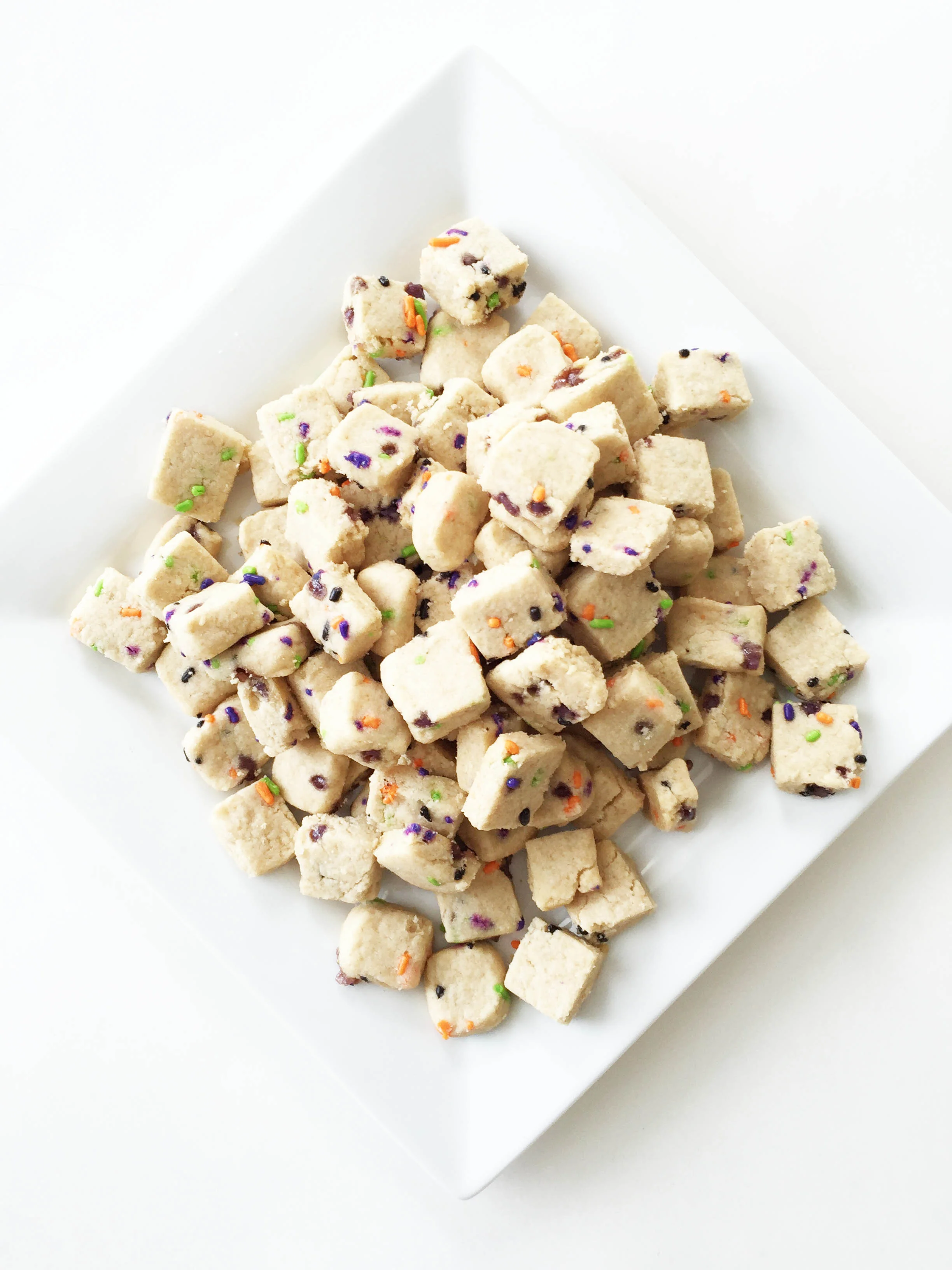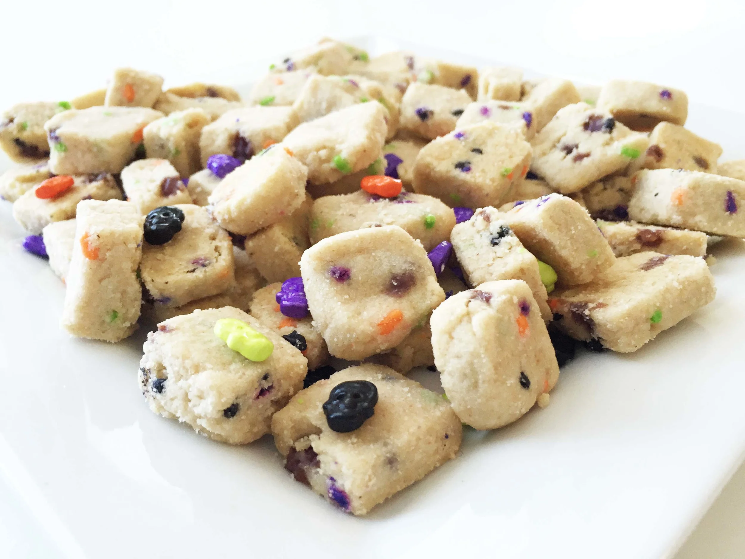 Sugar skulls and their bright beautiful colors were my inspiration for these fun little Boo Bite cookies! To keep with the sugar skull colors, I used festive sprinkles and some NERDS®. I really love the addition of the NERDS® candy since they added a little pop of tang and flavor among the otherwise soft and subtle shortbread style cookies.