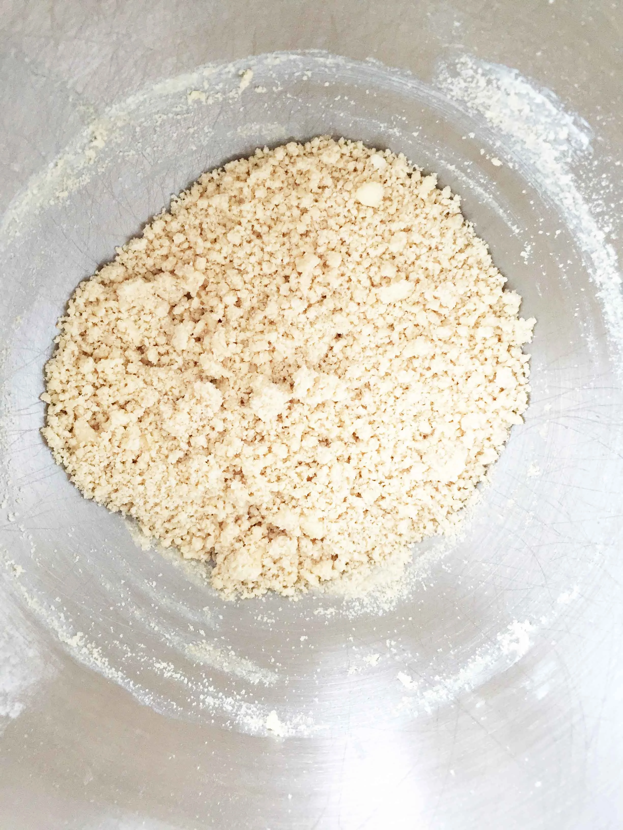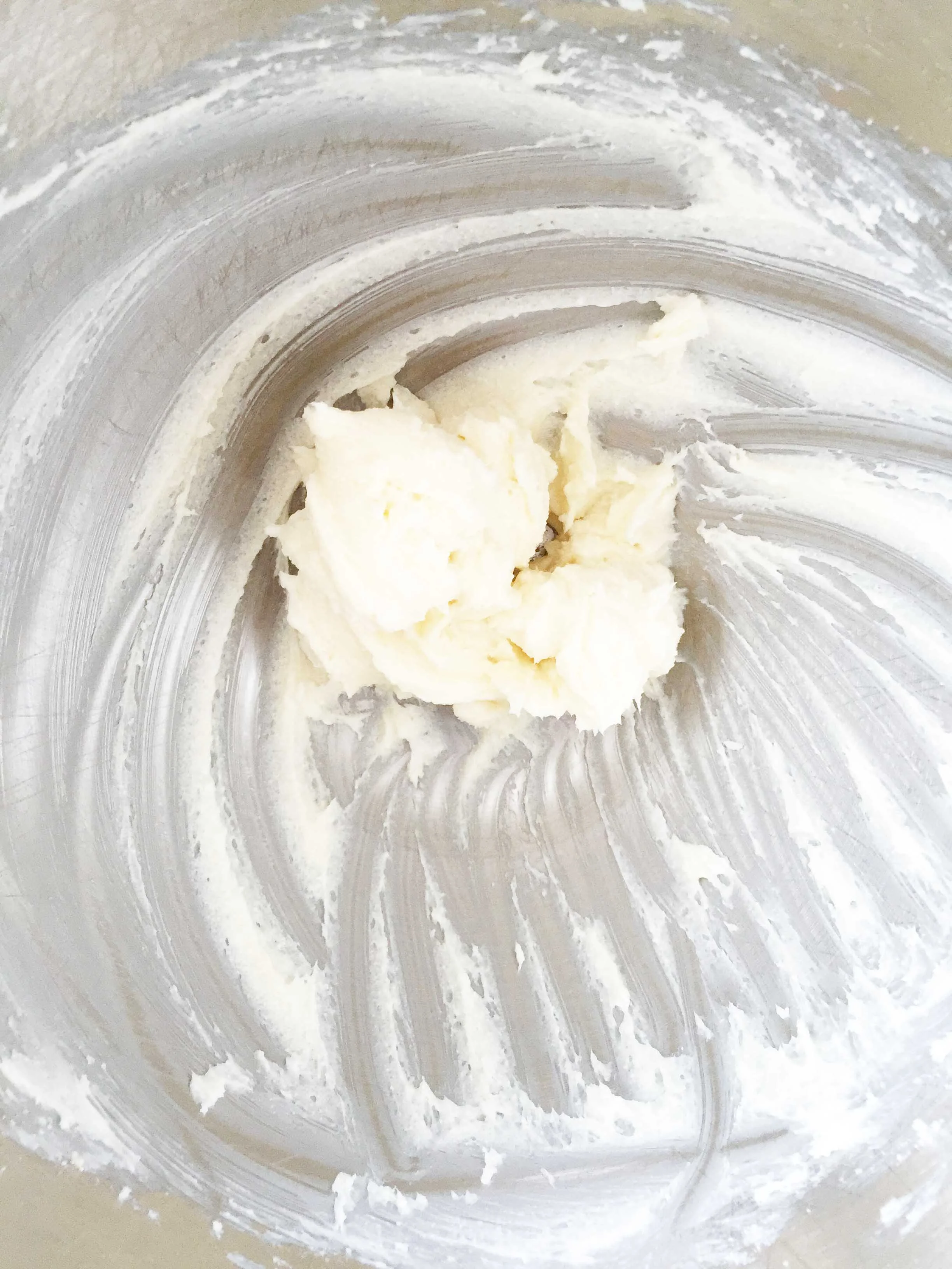 In a large bowl beat together the butter, sugar, sweetener, almond extract, and vanilla extract until smooth and creamy ad a medium speed.
