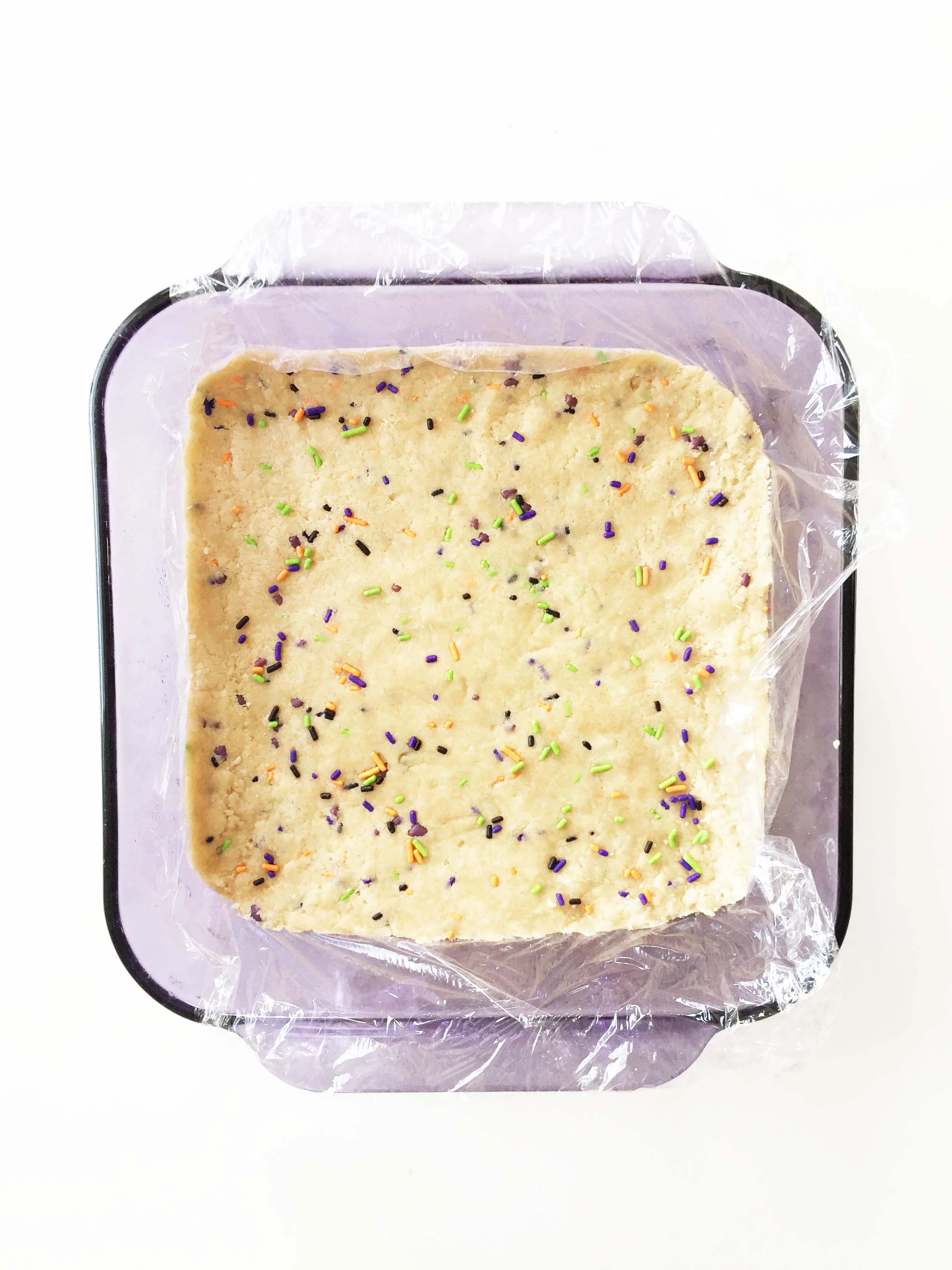 Carefully transfer the dough to the prepared baking dish and press it down into the dish to sort of mold the dough into the square shape and get it all as even and level as possible.