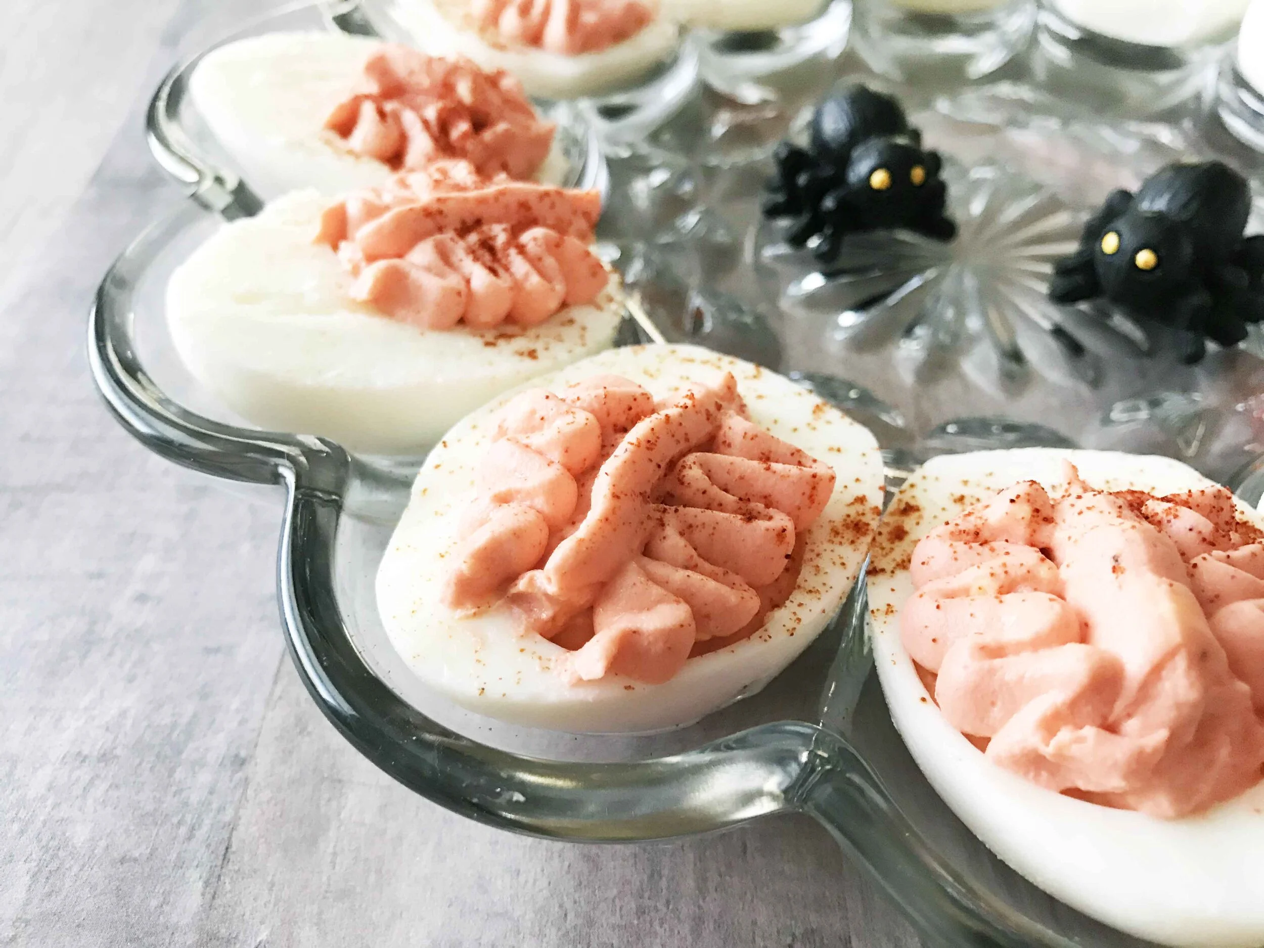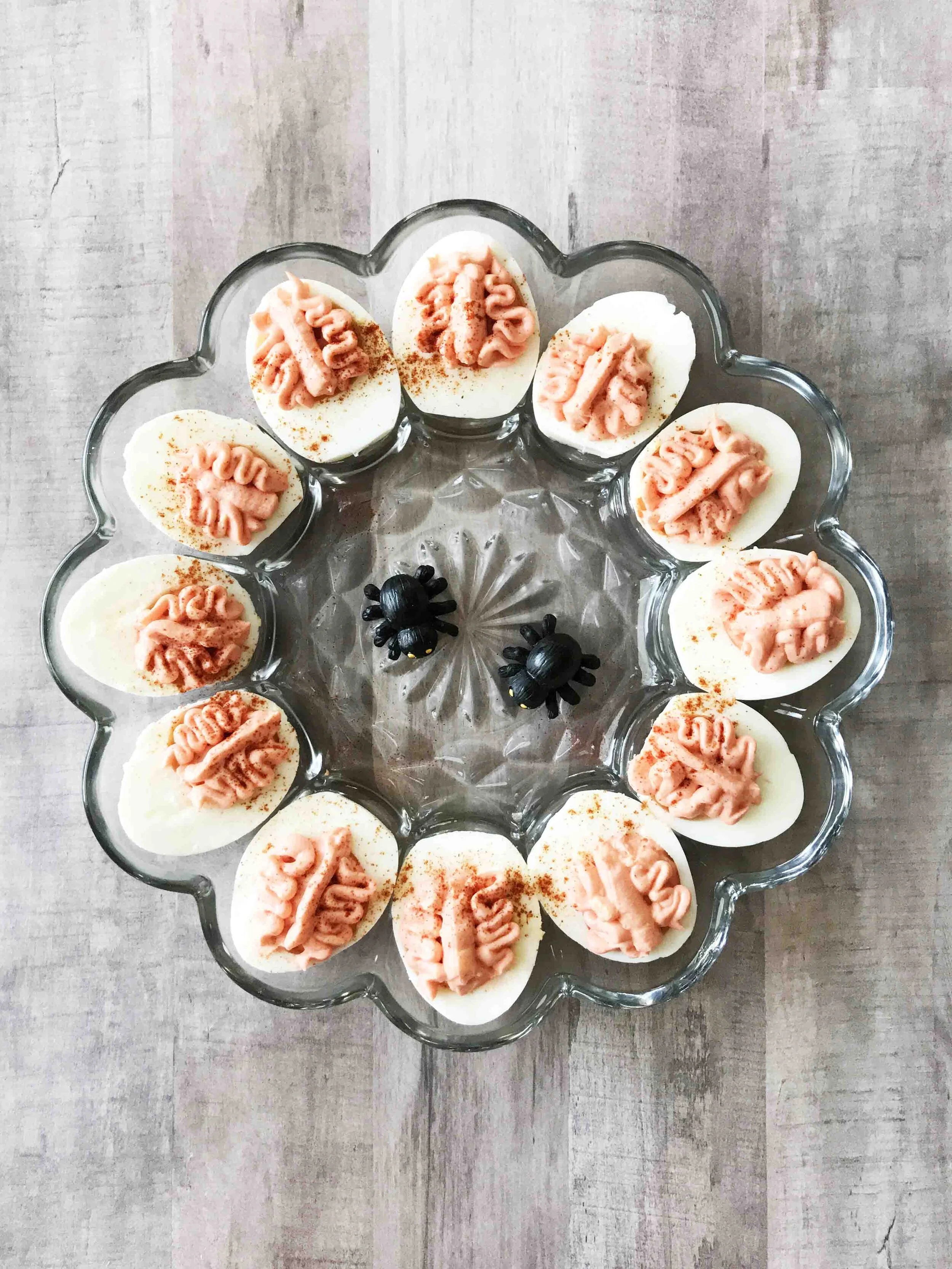 You can make these 'Brain' Deviled Eggs ahead of time by a couple of days, if you cover them and keep them in the fridge. They would be a fun addition to any Halloween spread or even as part of a spooky Halloween themed lunch box.