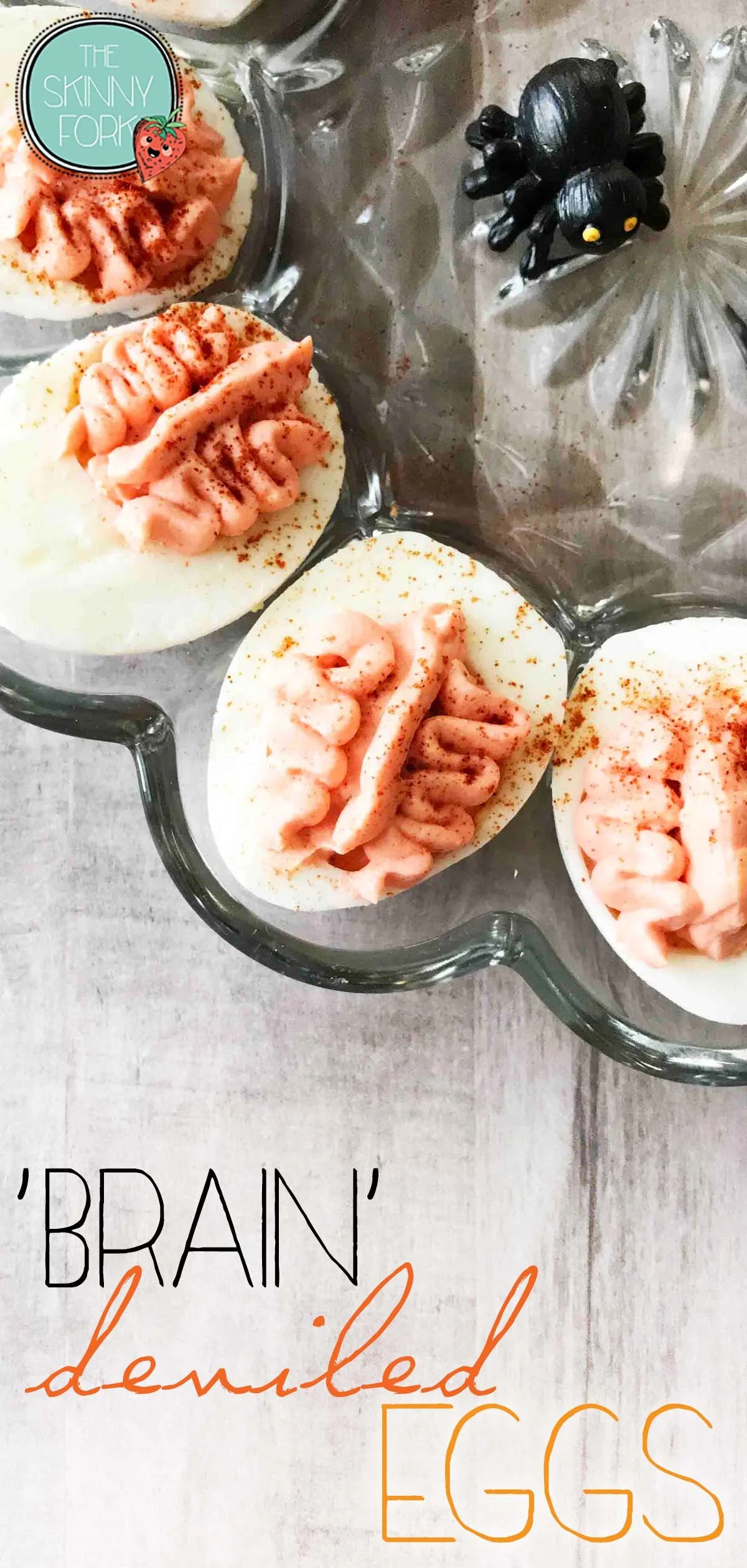 TheSkinnyFork.com Lightened up deviled eggs that are dressed up for brains for Halloween! Pefect for a snack or spooky appetizer. Prep Time: 10 Minutes • Cook Time: 0 Hours