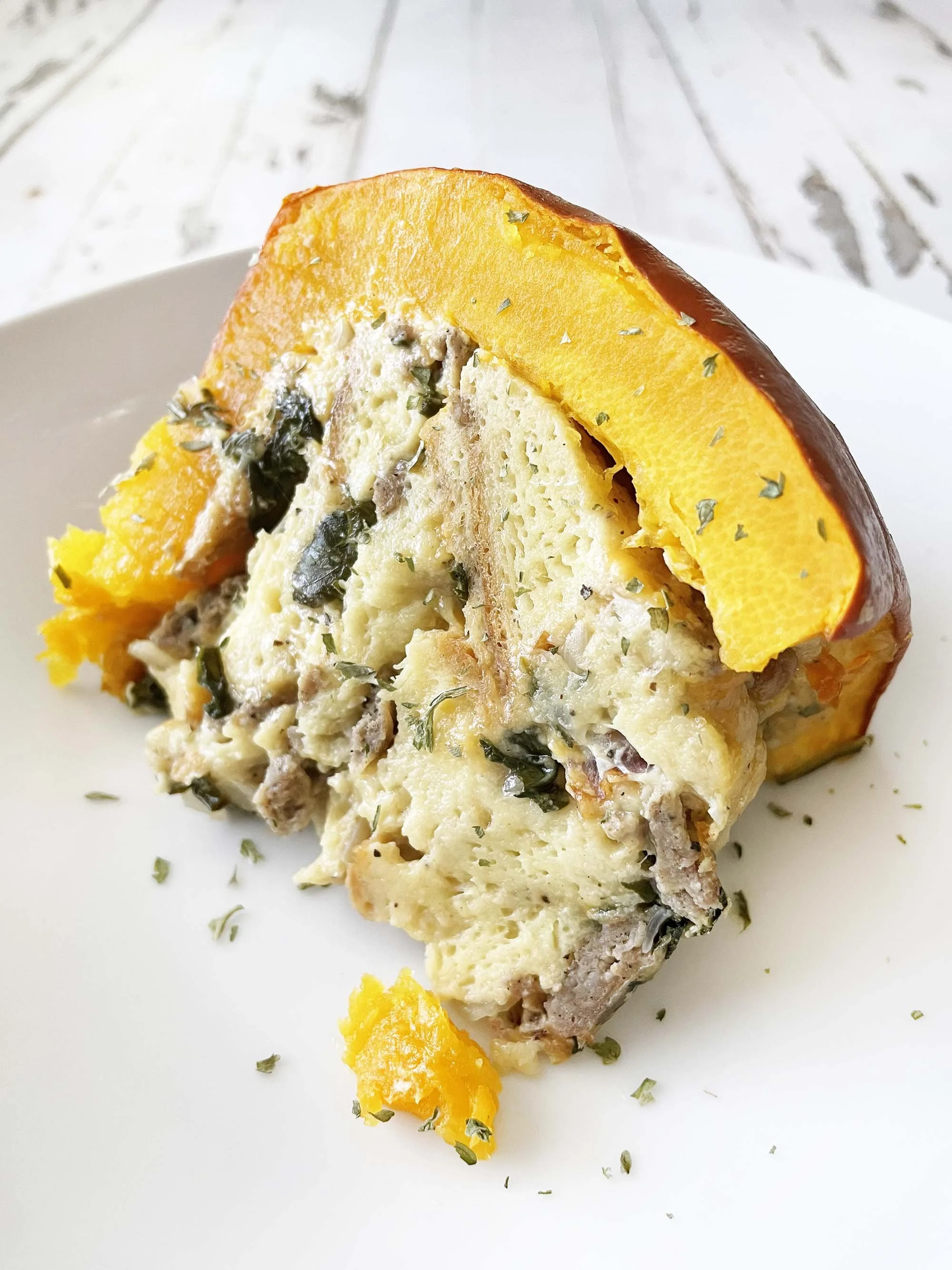 If you don’t like spinach or prefer another veggie instead, feel free to sway that in and make this stuffed pumpkin all your own. And YES the pumpkin is edible too. Though I wouldn’t so much suggest the skin as I would the meat of the pumpkin