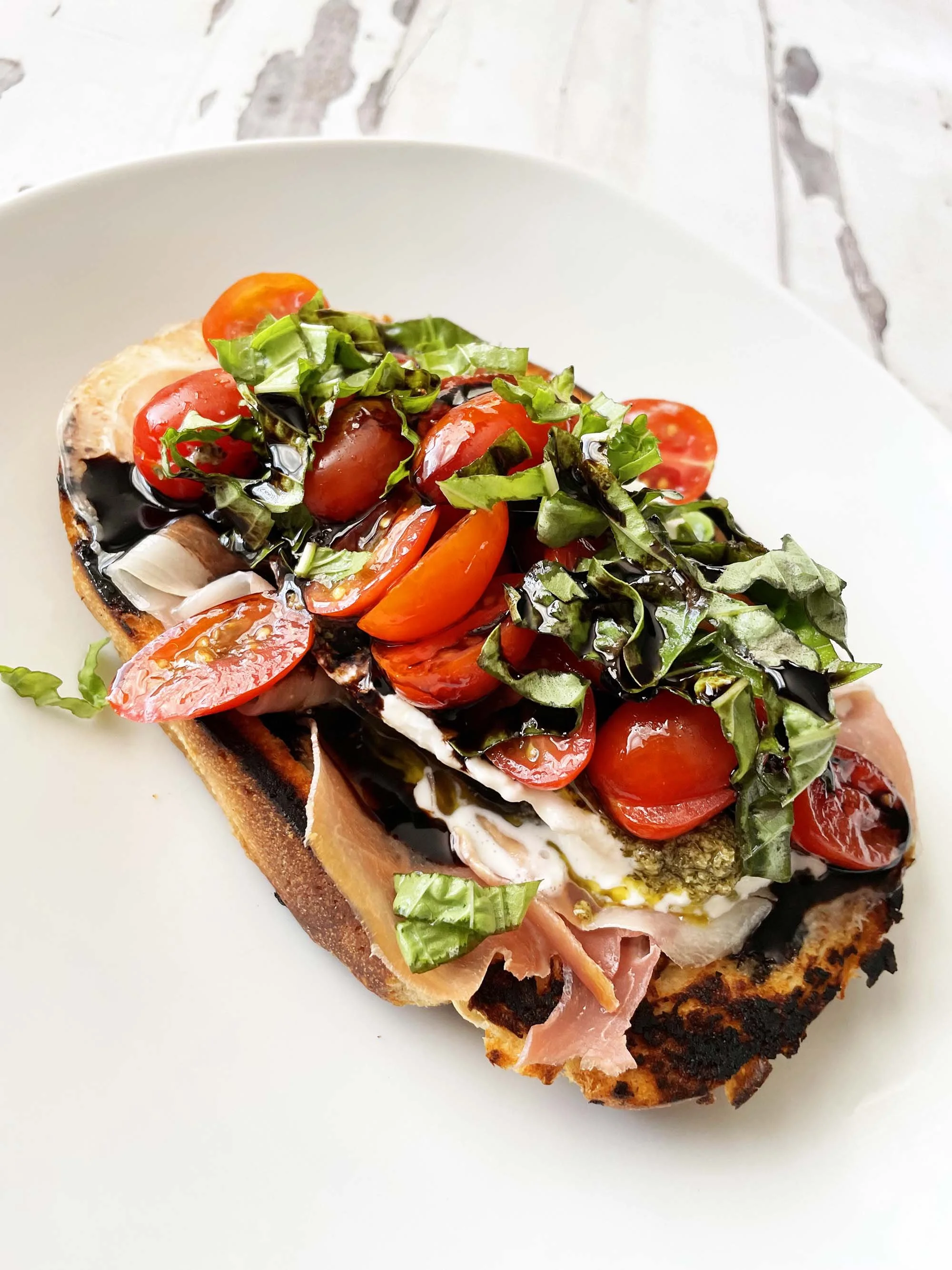 But the true star of the show is the luxurious burrata cheese, which boasts a creamy, velvety texture that oozes decadently with every luscious morsel. To further elevate this toast to greatness, it is adorned with gorgeous, vibrant ripe tomatoes that burst with a juicy sweetness. The fragrant basil leaves lend their herbaceous notes, adding a refreshing element to the whole ensemble. And let's not forget the final touch—the elegant drizzle of balsamic glaze, which creates a beautiful contrast of tangy and slightly sweet flavors.