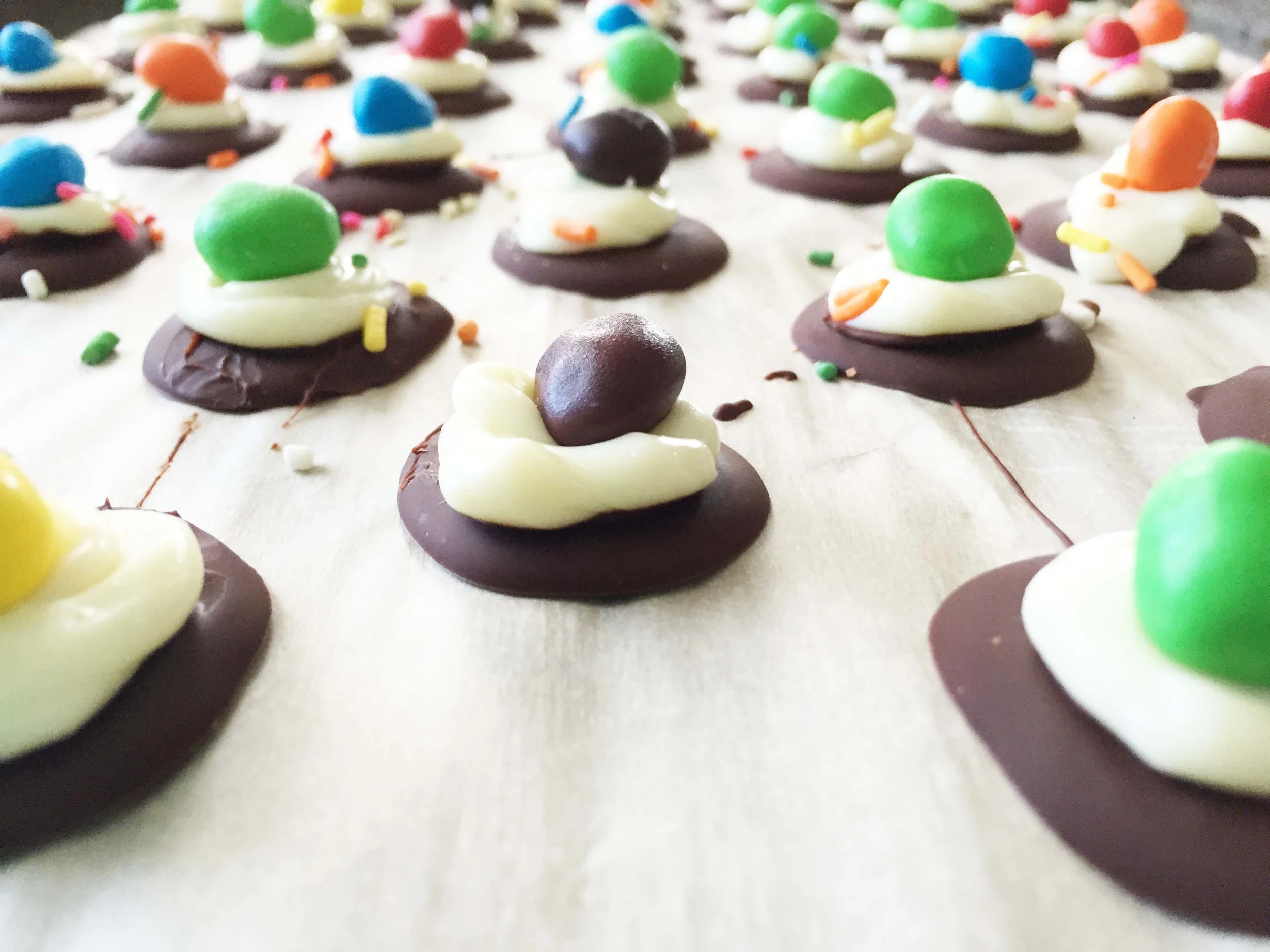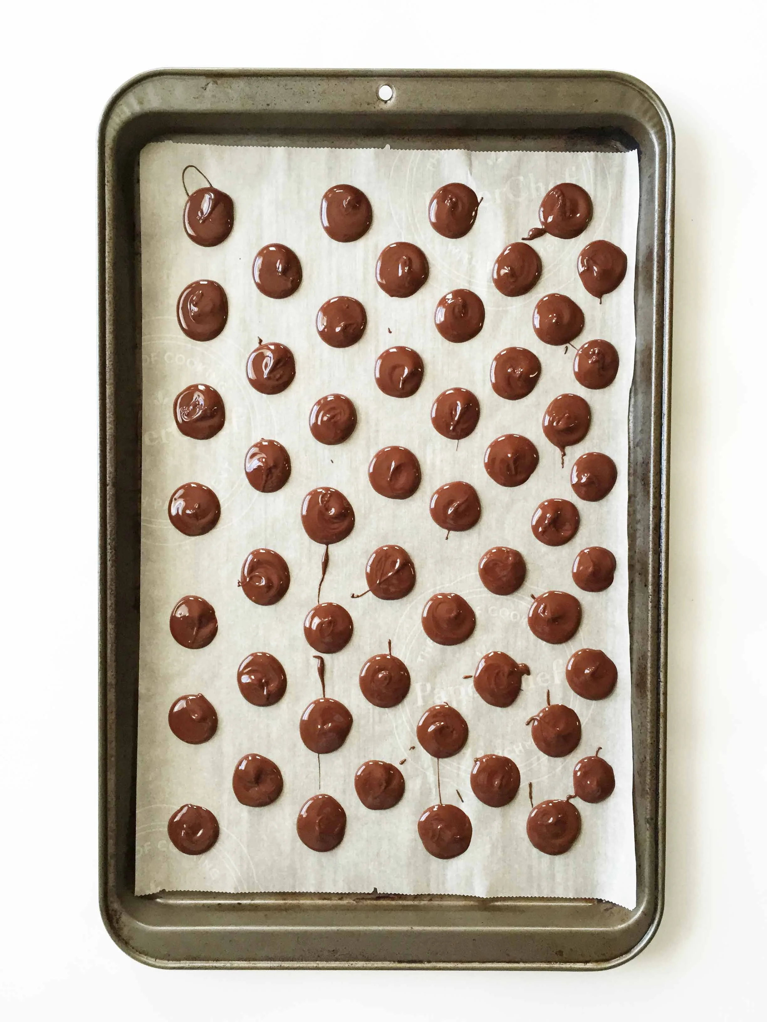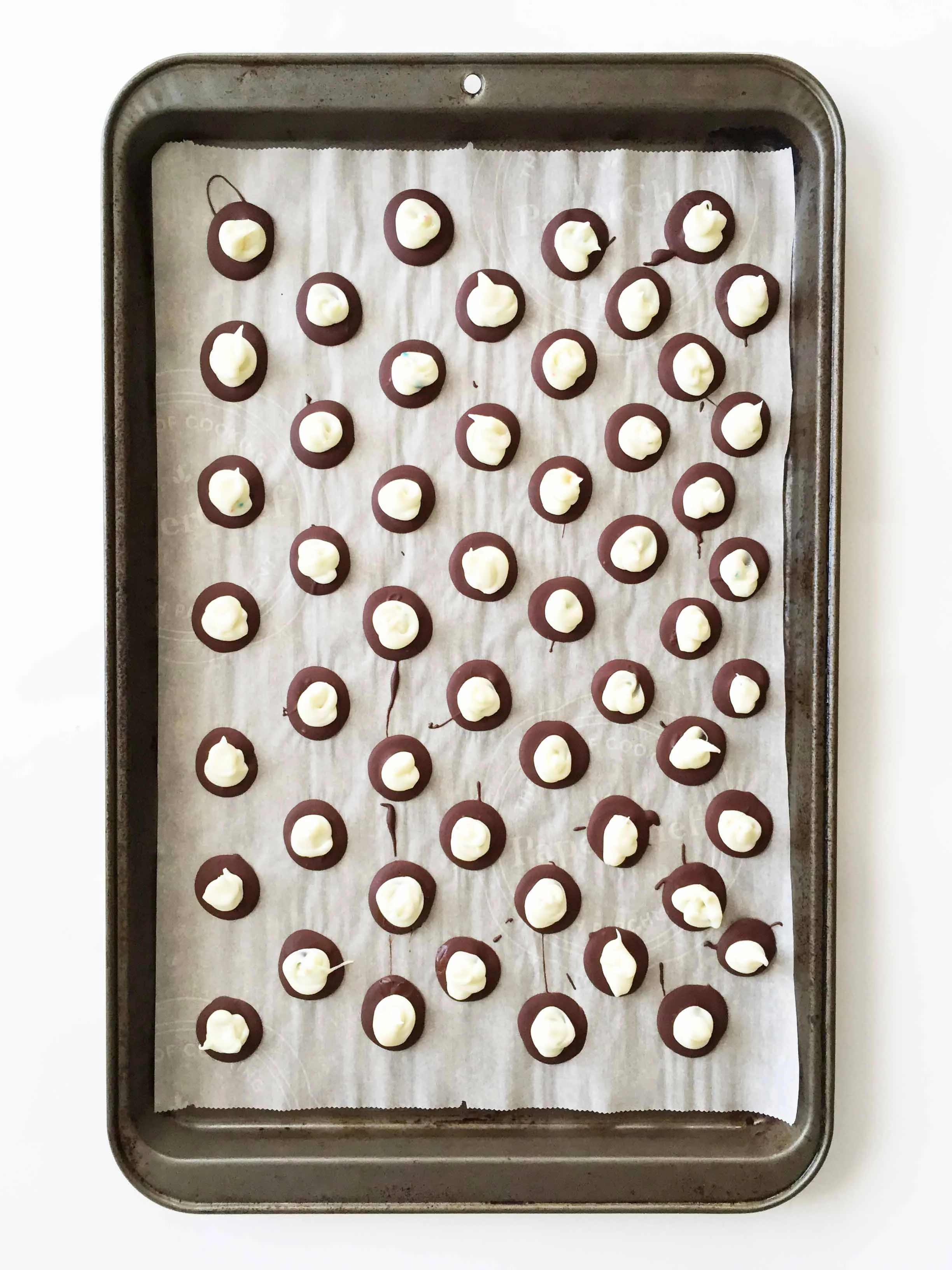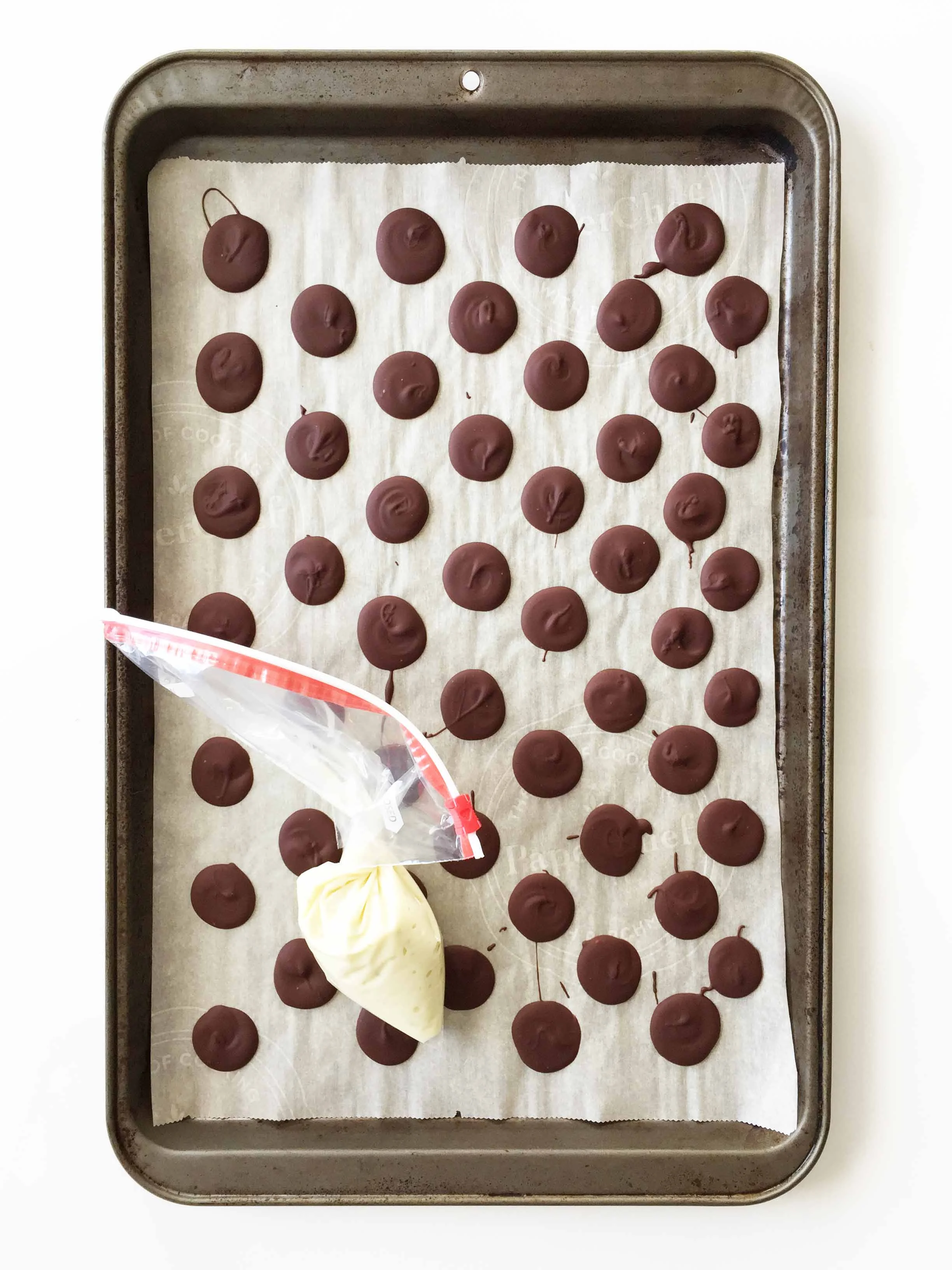 Once melted transfer the dark chocolate into a frosting bag or ziplock and create 52 'dots' on the prepared baking sheet.