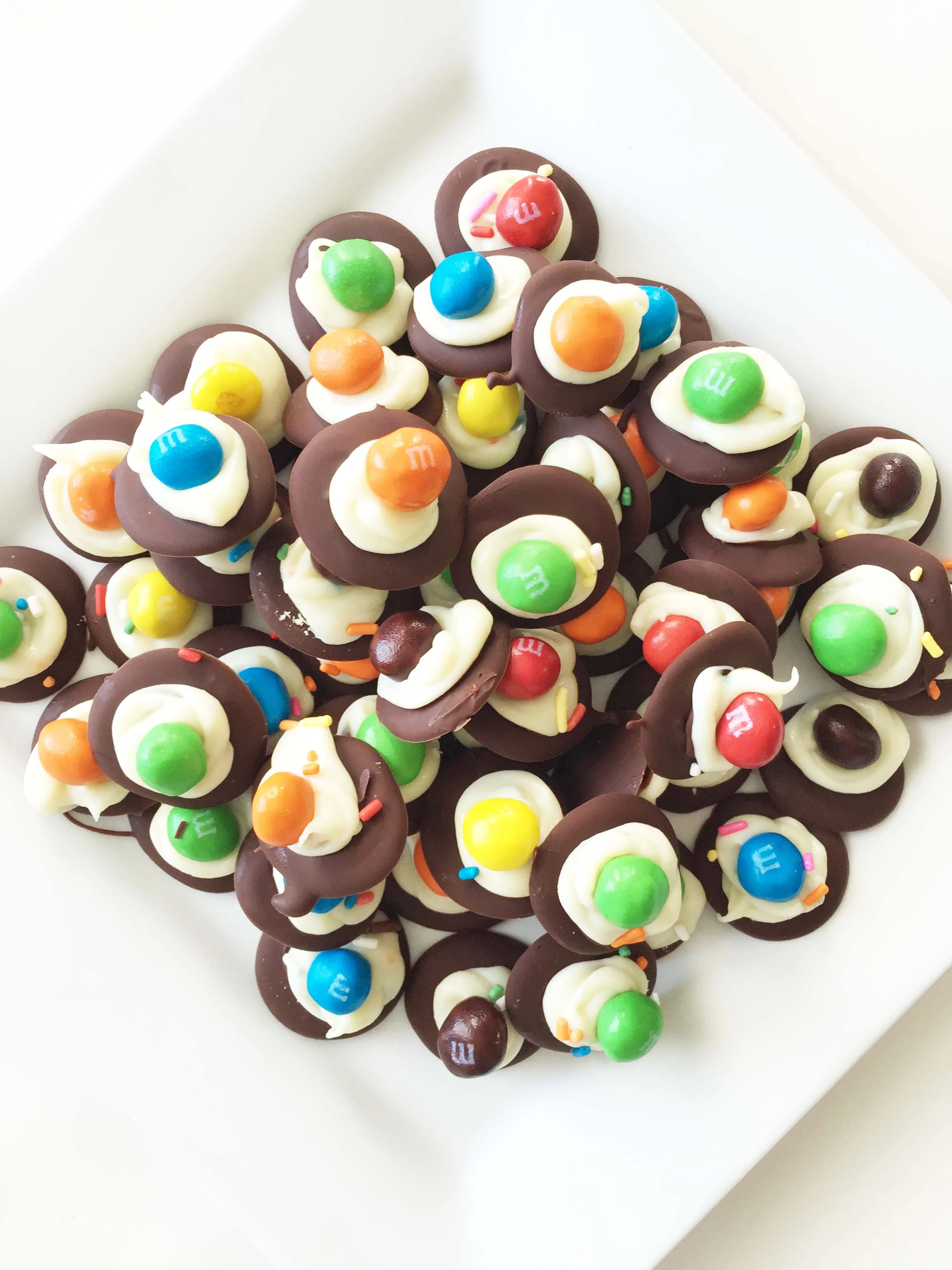 Top with a few sprinkles and place one M&M's® Crispy onto of each bite; press down slightly to set it in the white chocolate
