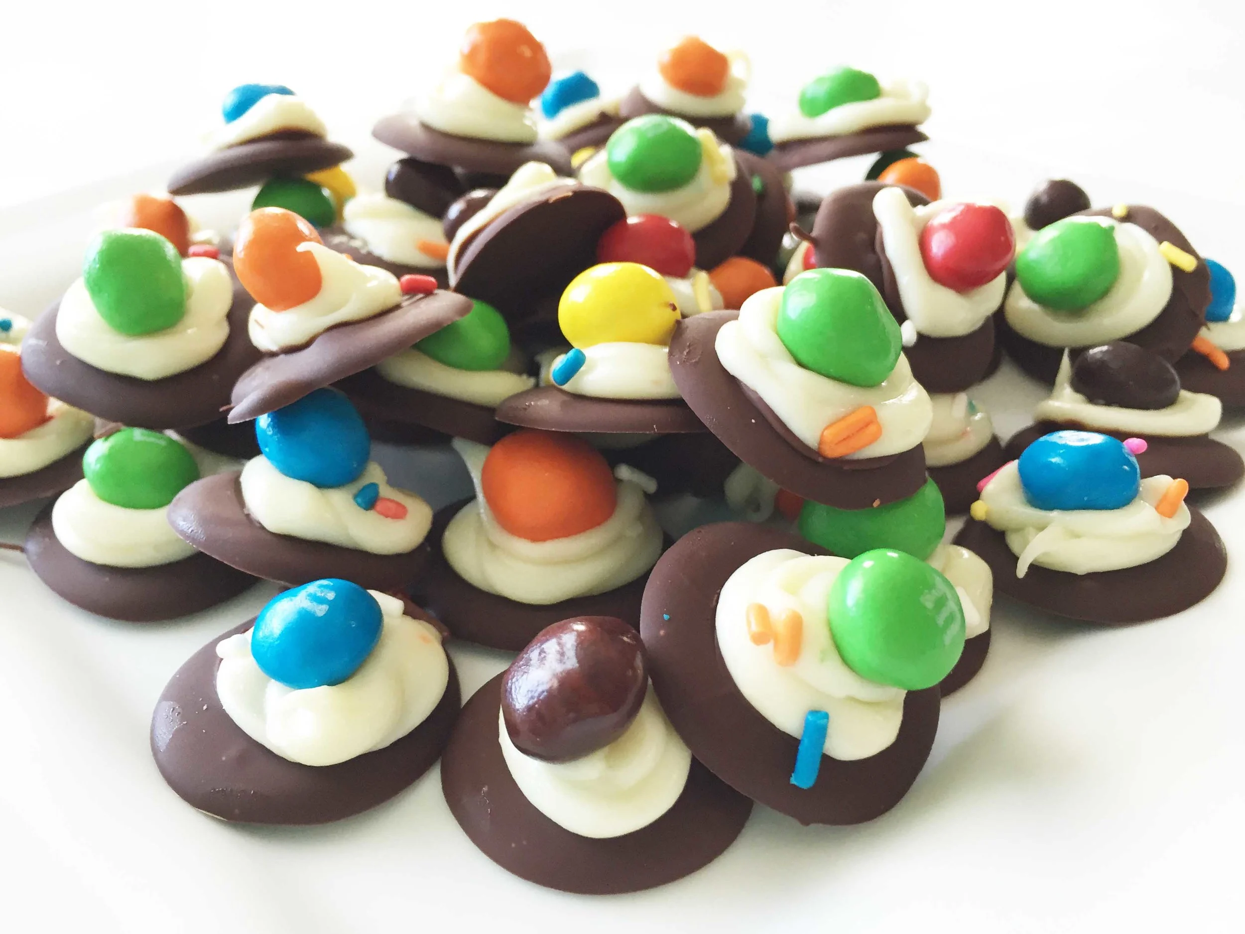 Remove the baking sheet from the freezer and 'dot' the white chocolate and yogurt mixture over the top of each set dark chocolate bite.