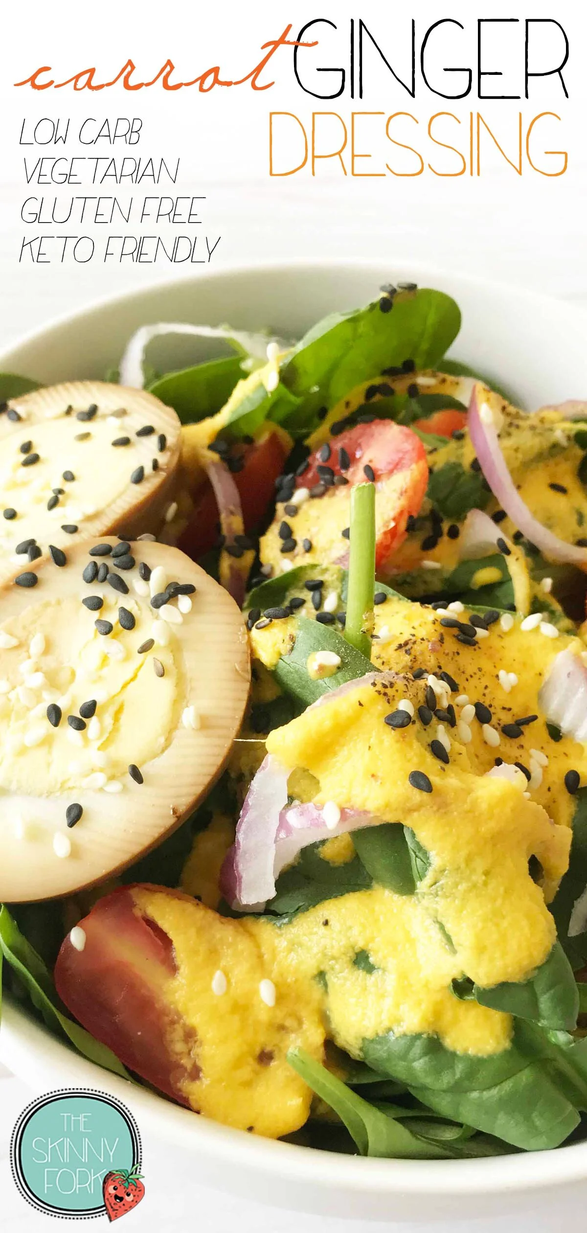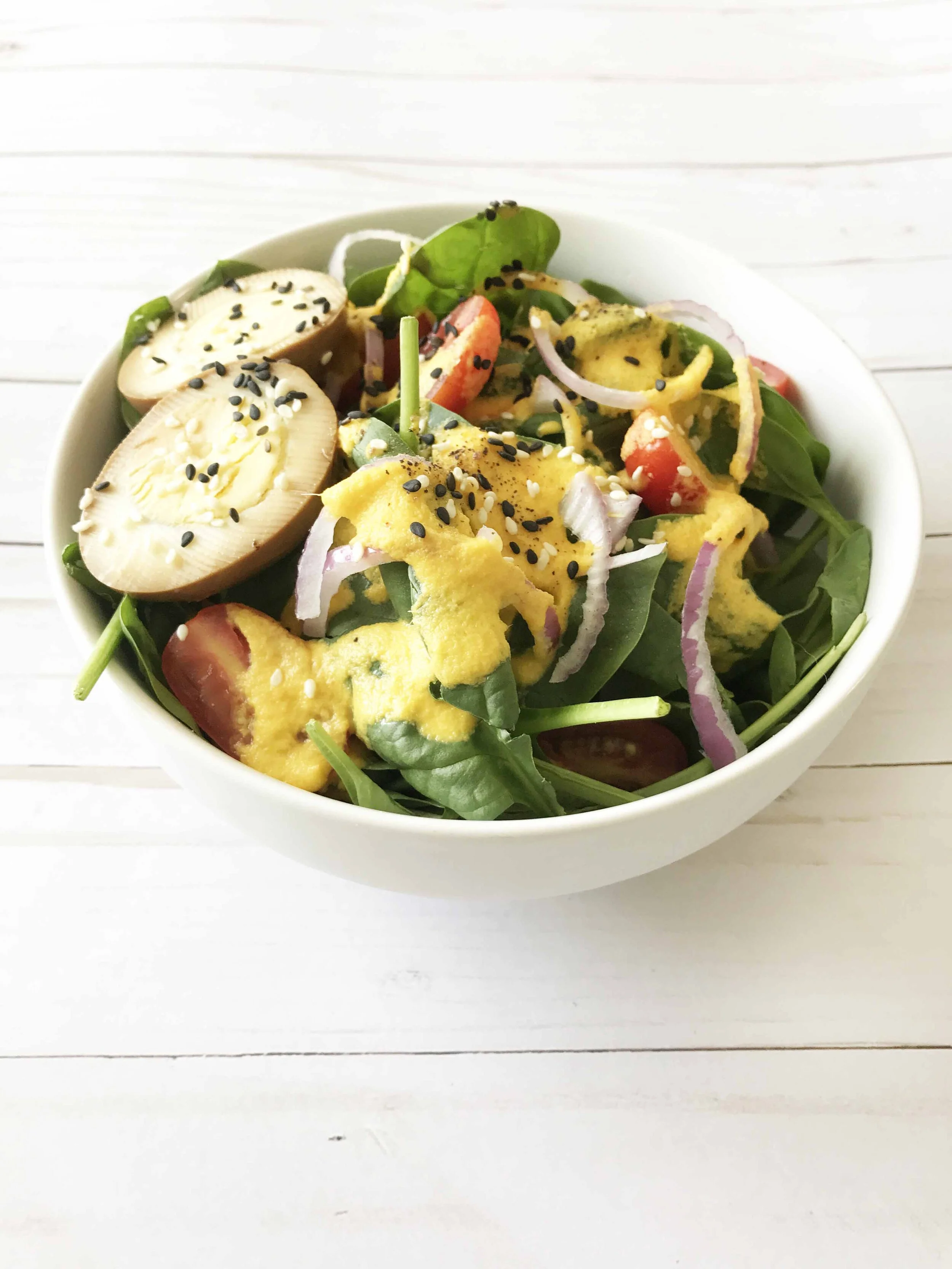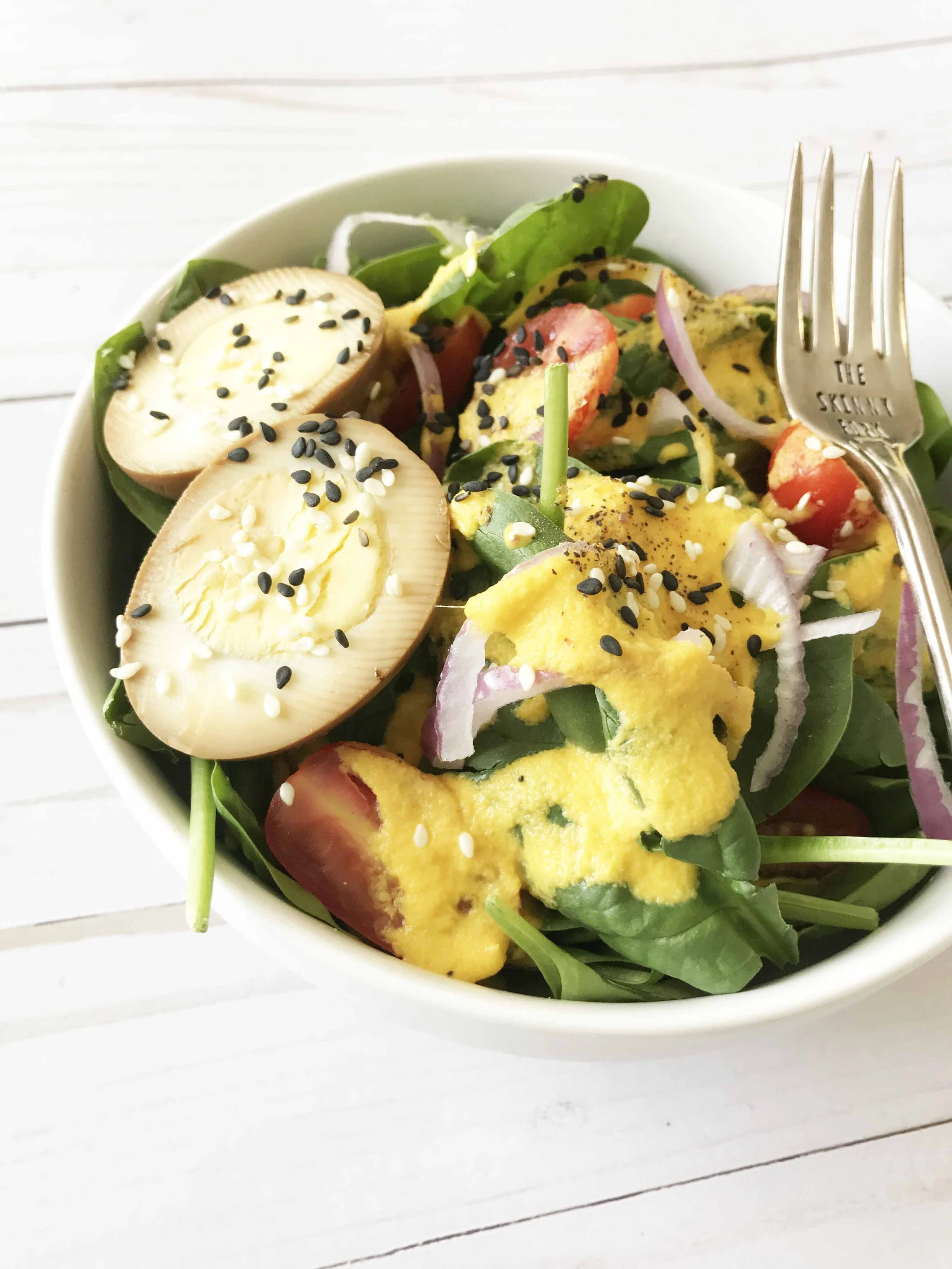 I put my Carrot Ginger Dressing over some baby spinach and added in a few slices of red onion, halved cherry tomatoes, a few sesame seeds on top, and a ‘soy sauce’ marinated hard-boiled egg. It’s one of my new favorite lunches. Easy to toss together and so damn good.